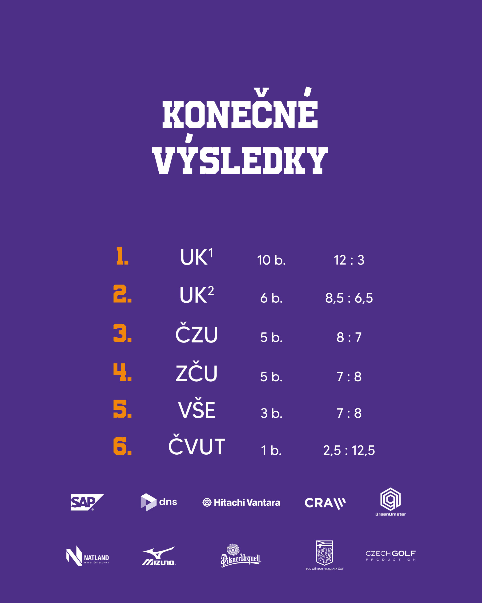Hned úvodní zápas dopoledního kola mezi Západočeskou univerzitou v Plzni a týmem Univerzity Karlovy, rozhodl o celkovém vítězství, právě týmu UK. Toto vítězství se nerodilo snadno, po 9 jamkách měli Plzeňáci v singlech navrch, ale nakonec jasná výhra ve foursomu a jeden vyhraný single vedl k vítězství.