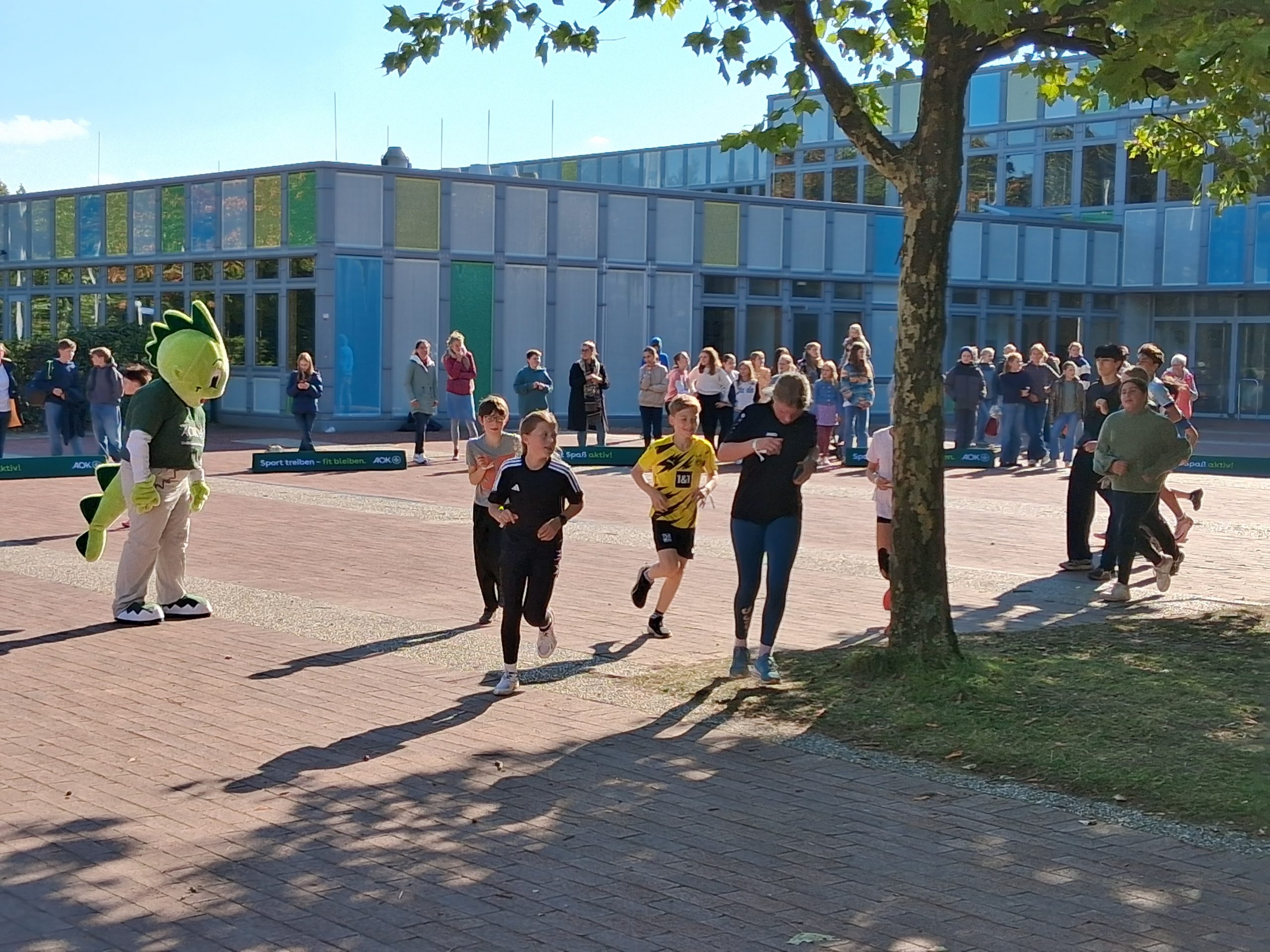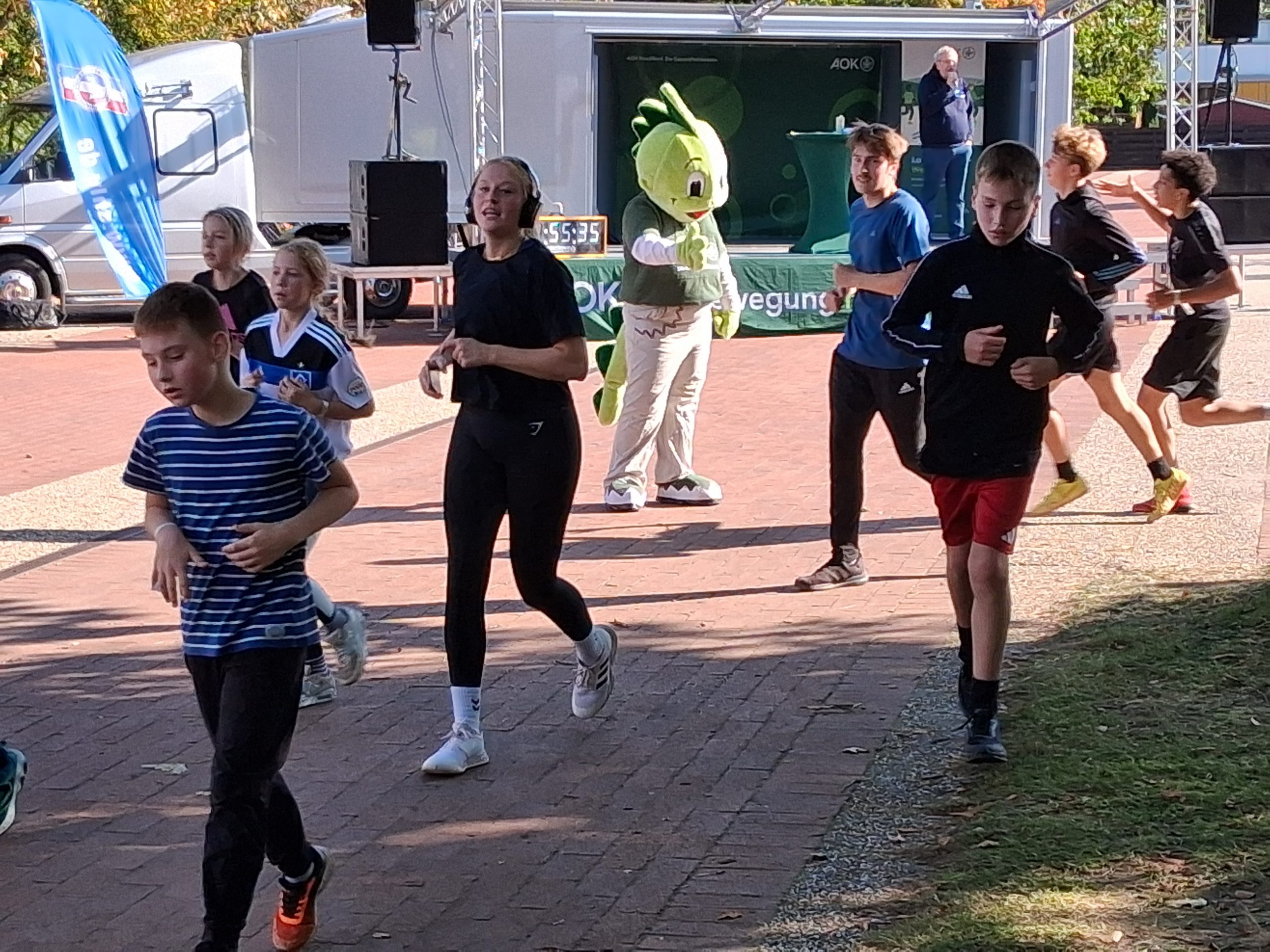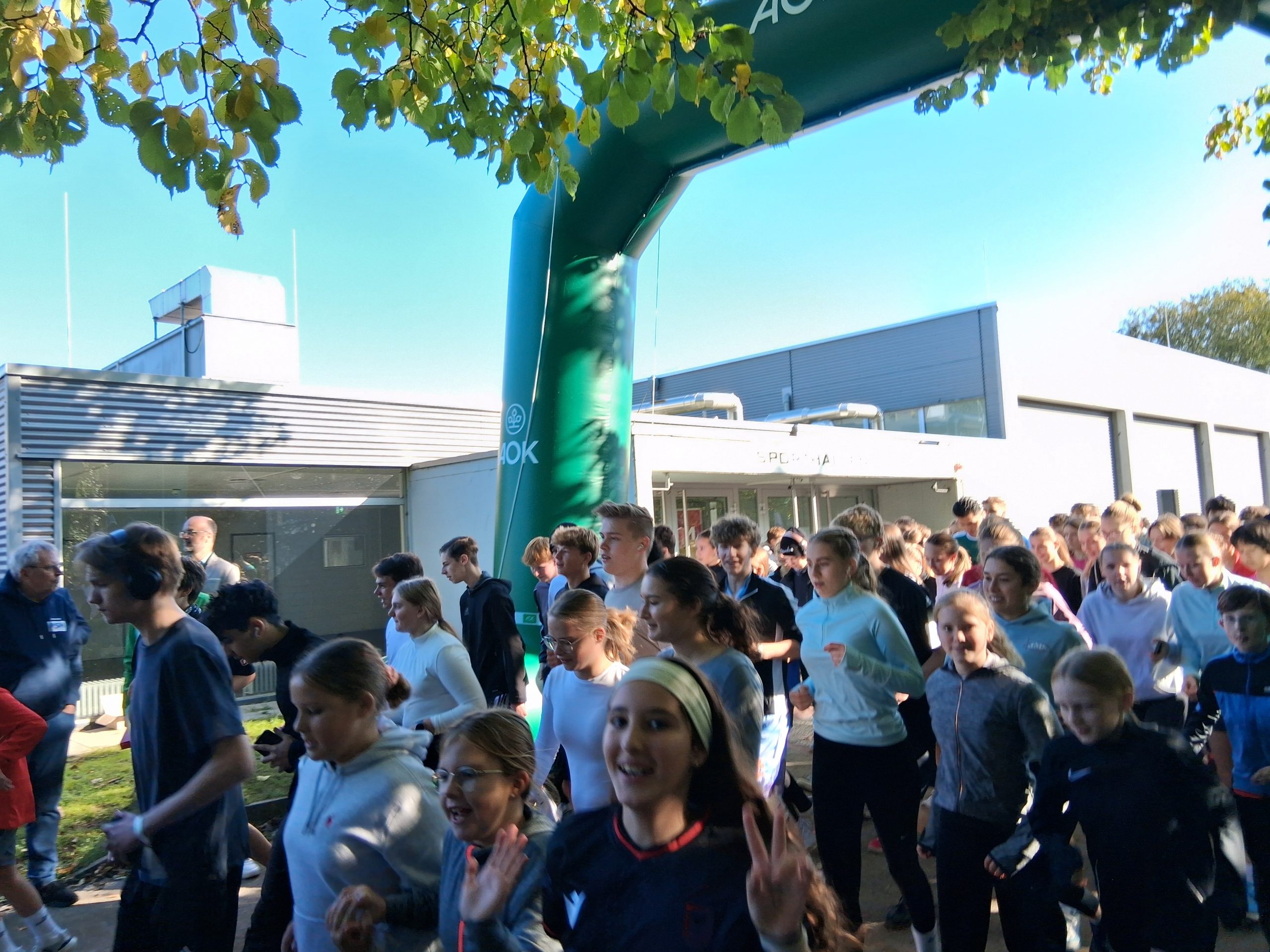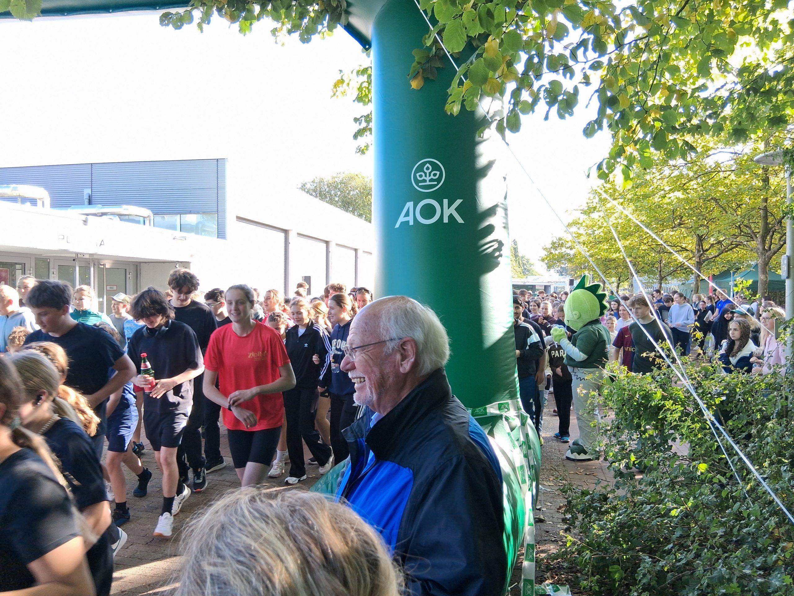 Nach dem Warm-up durch die Schülerinnen und Schüler aus dem Sportprofil des 13. Jahrgangs wurden die mehr als 1.000 Schülerinnen und Schüler der Peter-Ustinov-Schule und der Jungmannschule auf dem Schulvorplatz mit dem Startsignal von AOK-Serviceregionsleiter Stefan Kölpin auf die Strecke geschickt. Der circa ein Kilometer lange Rundkurs führte durch die Grünanlagen neben der Schule zum Sportplatz und von dort wieder zum Vorplatz zurück. So drehten die Schülerinnen und Schüler ihre Runden, bis sie ihre persönlich anvisierte Zeit für das Laufabzeichen erreicht hatten.
