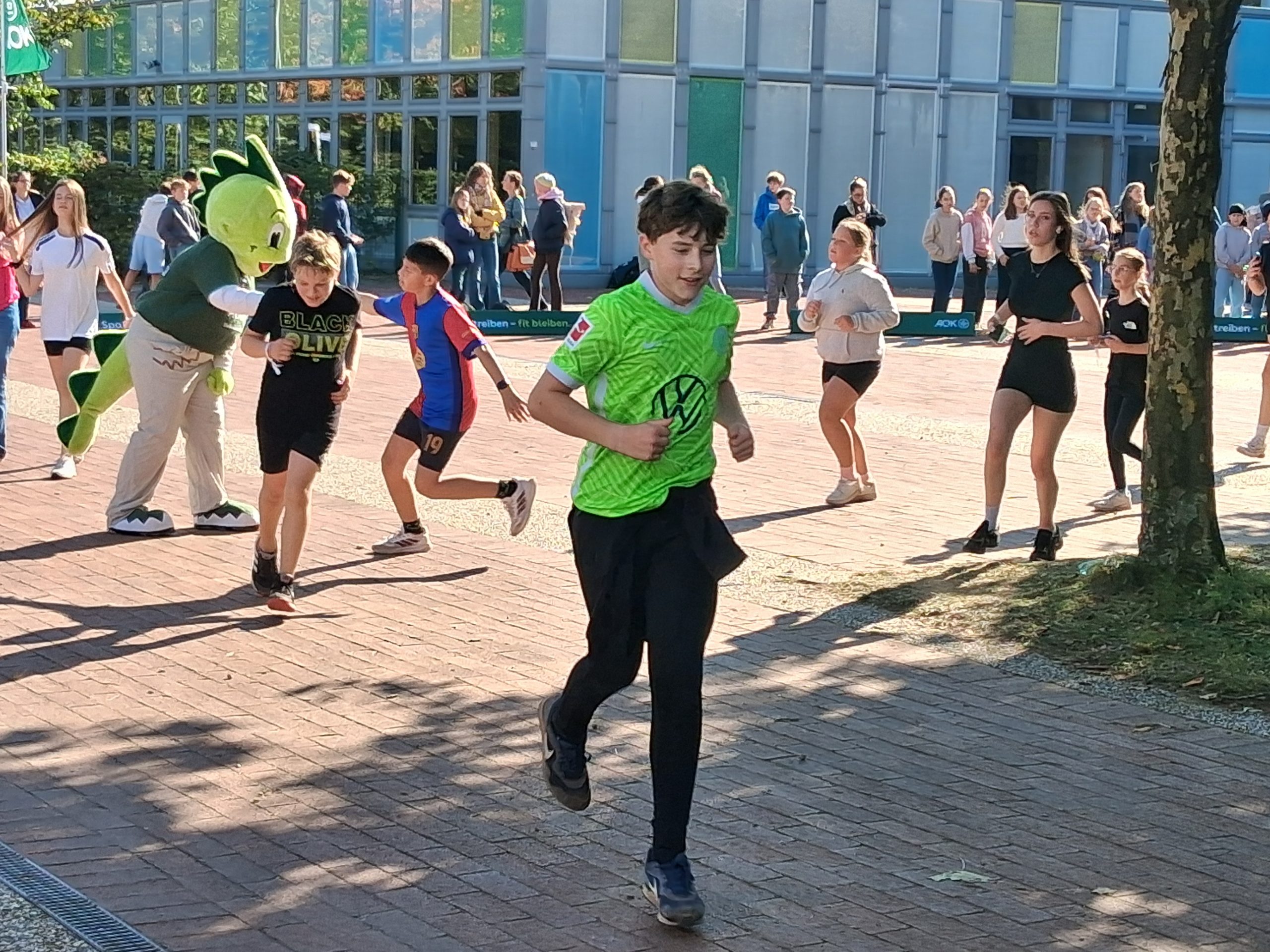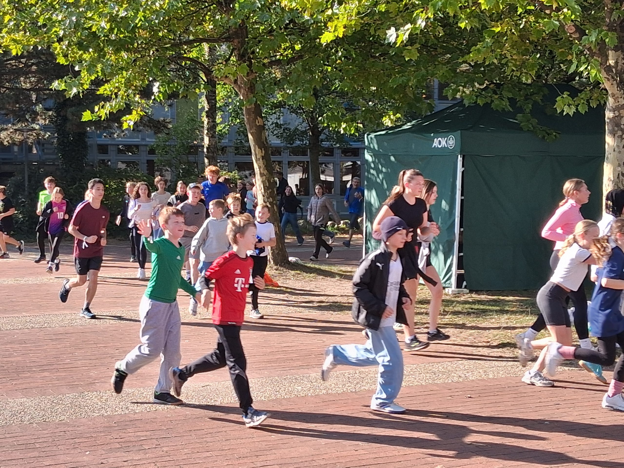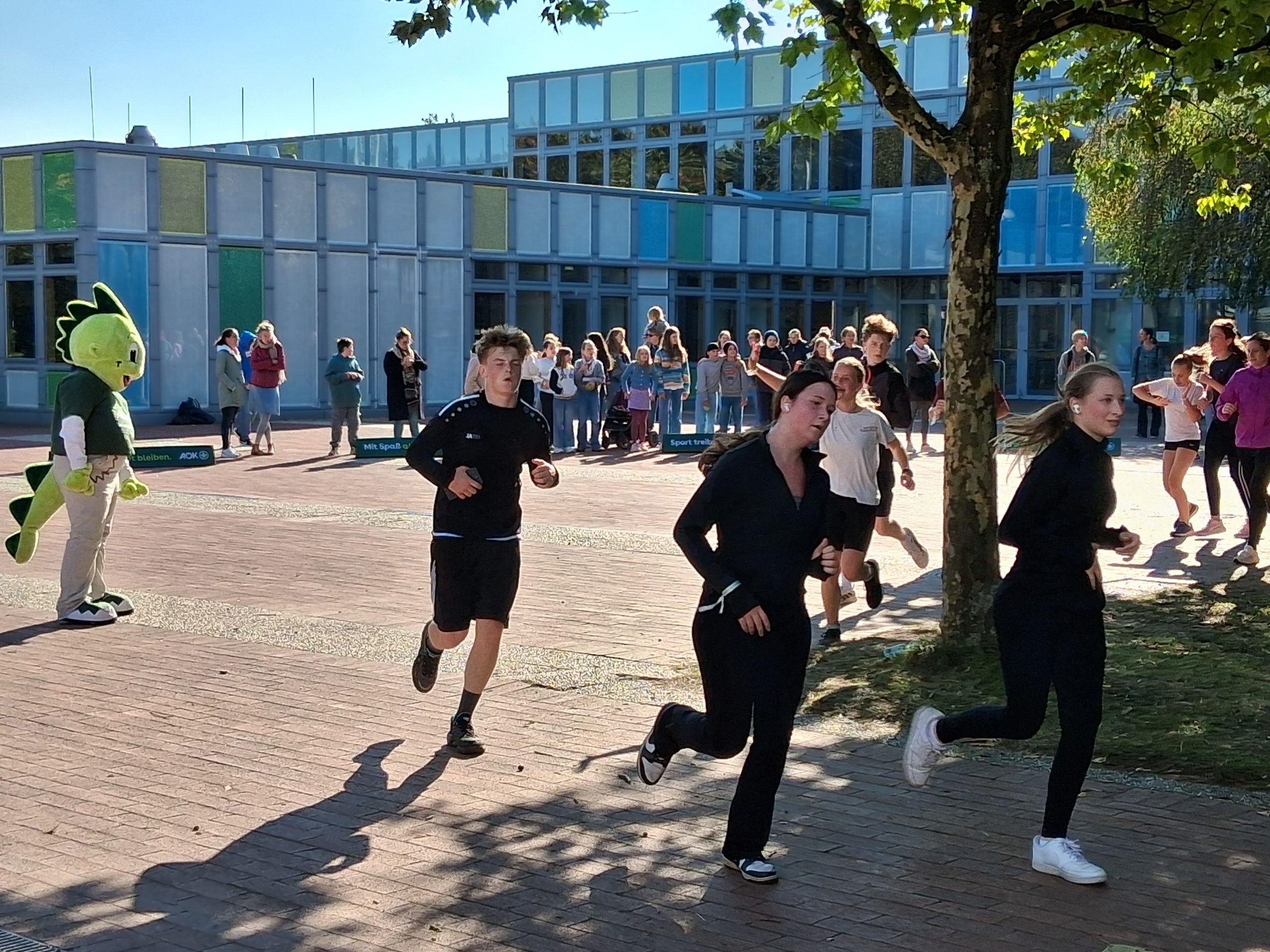 Nach dem Warm-up durch die Schülerinnen und Schüler aus dem Sportprofil des 13. Jahrgangs wurden die mehr als 1.000 Schülerinnen und Schüler der Peter-Ustinov-Schule und der Jungmannschule auf dem Schulvorplatz mit dem Startsignal von AOK-Serviceregionsleiter Stefan Kölpin auf die Strecke geschickt. Der circa ein Kilometer lange Rundkurs führte durch die Grünanlagen neben der Schule zum Sportplatz und von dort wieder zum Vorplatz zurück. So drehten die Schülerinnen und Schüler ihre Runden, bis sie ihre persönlich anvisierte Zeit für das Laufabzeichen erreicht hatten.