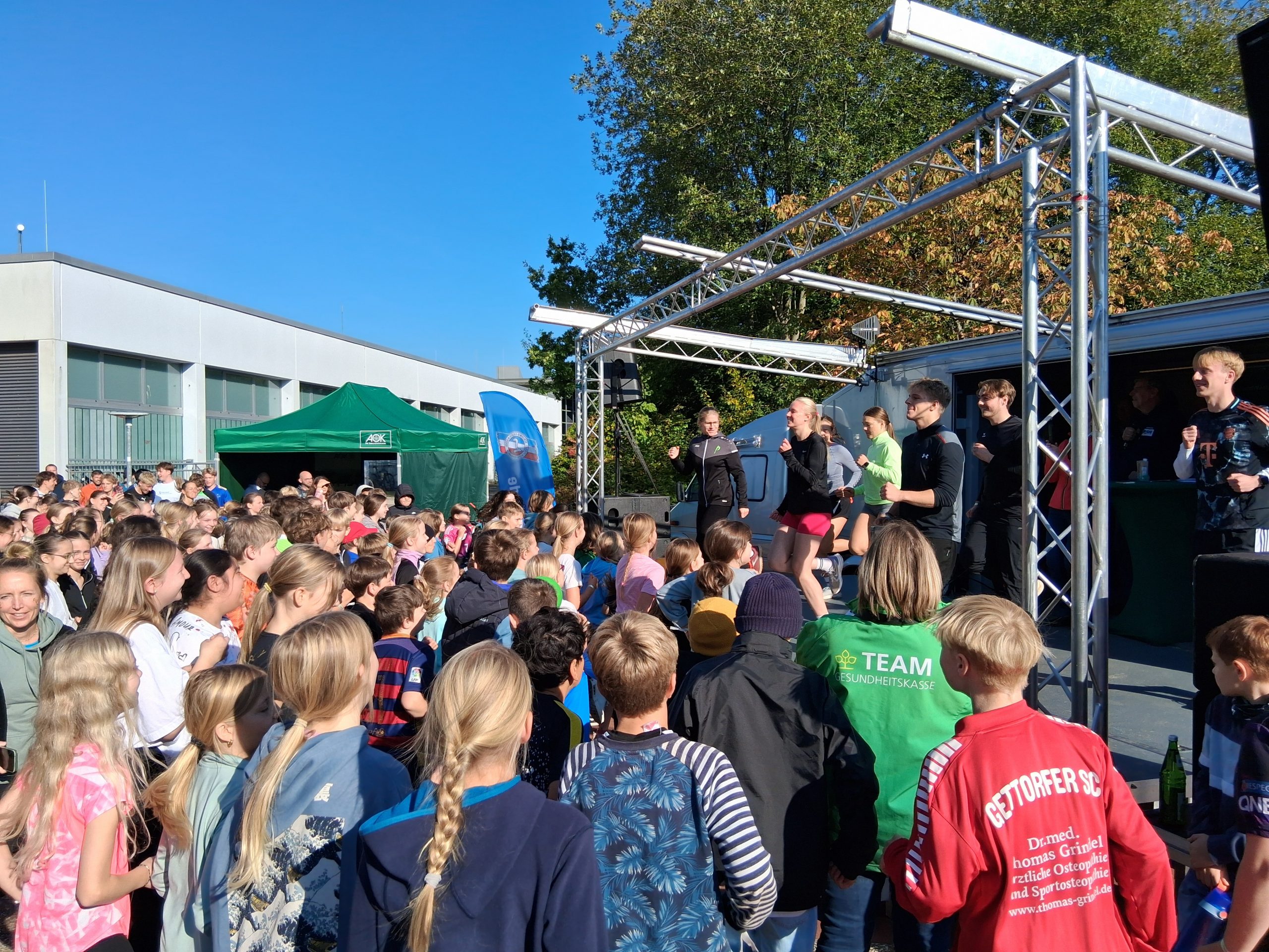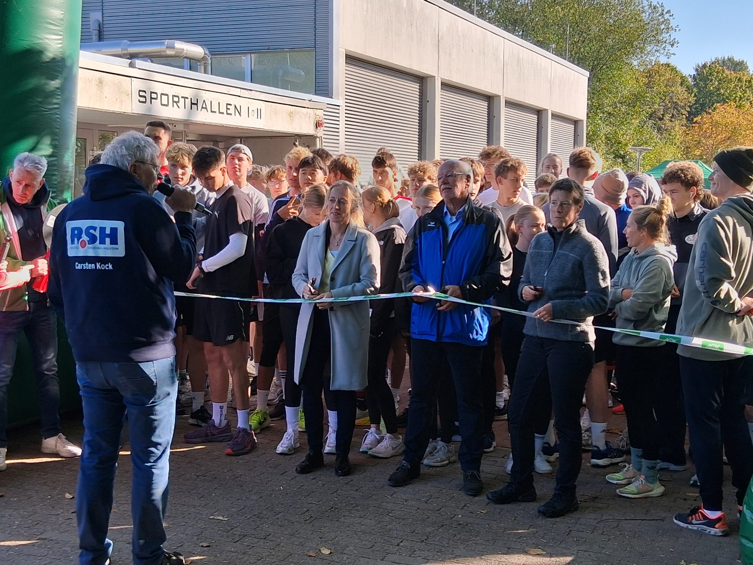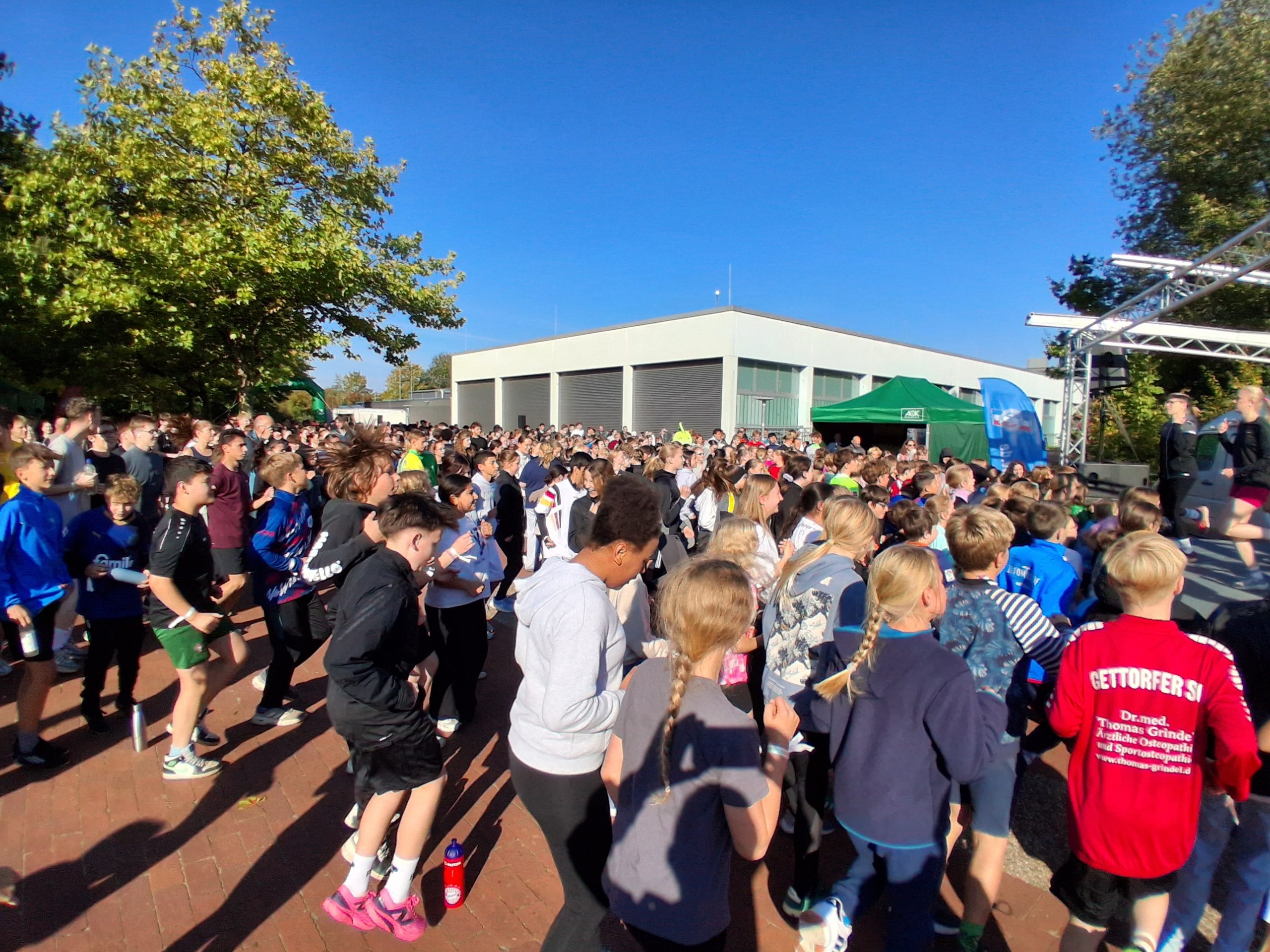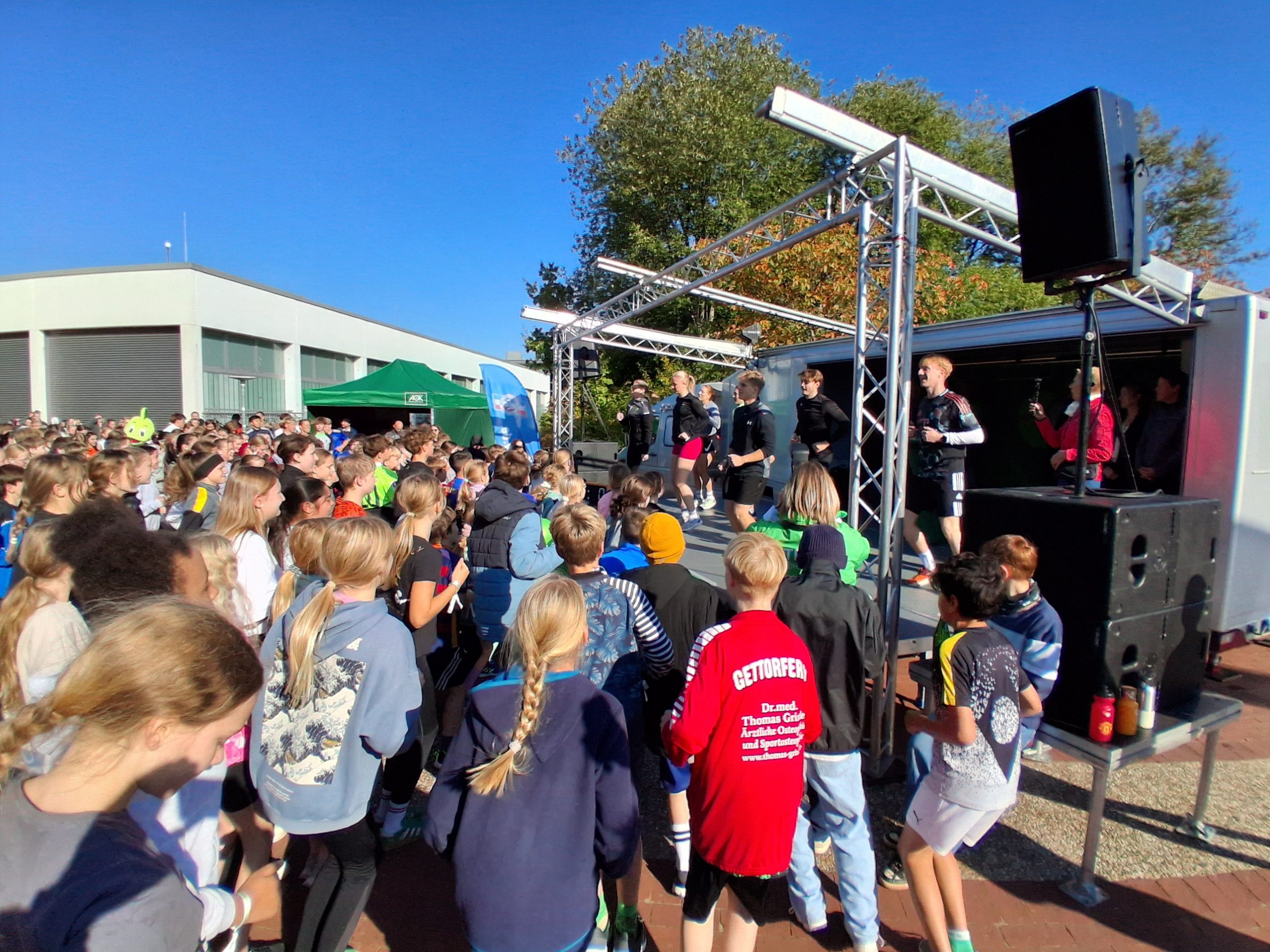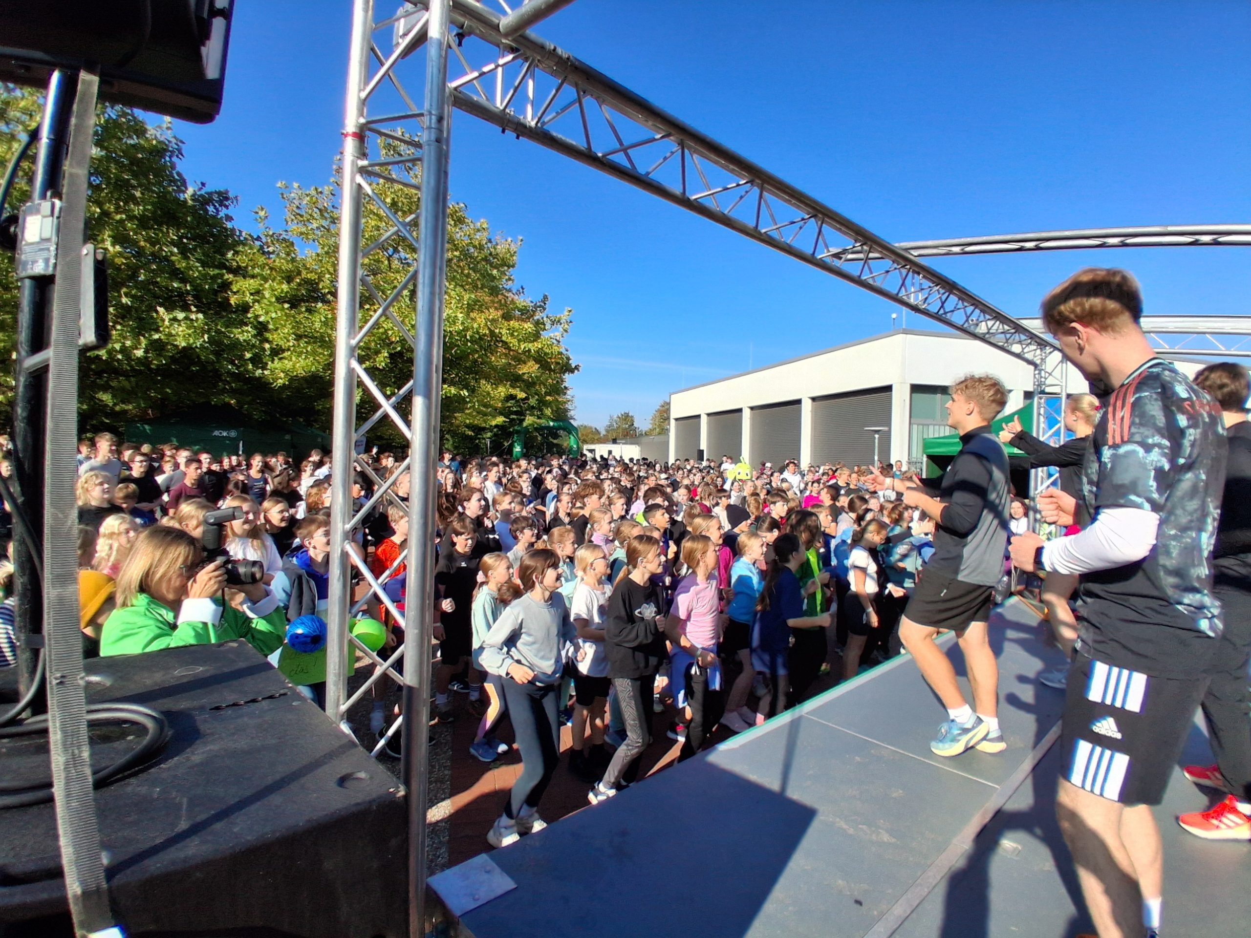 Das Rahmenprogramm des Lauftages wurde von R.SH-Chef-Korrespondent Carsten Kock professionell moderiert. Coole Musik und seine motivierenden Ansagen unterstützten nach dem Startschuss die lauffreudigen Schülerinnen und Schüler auf ihren Runden über das Schulgelände.