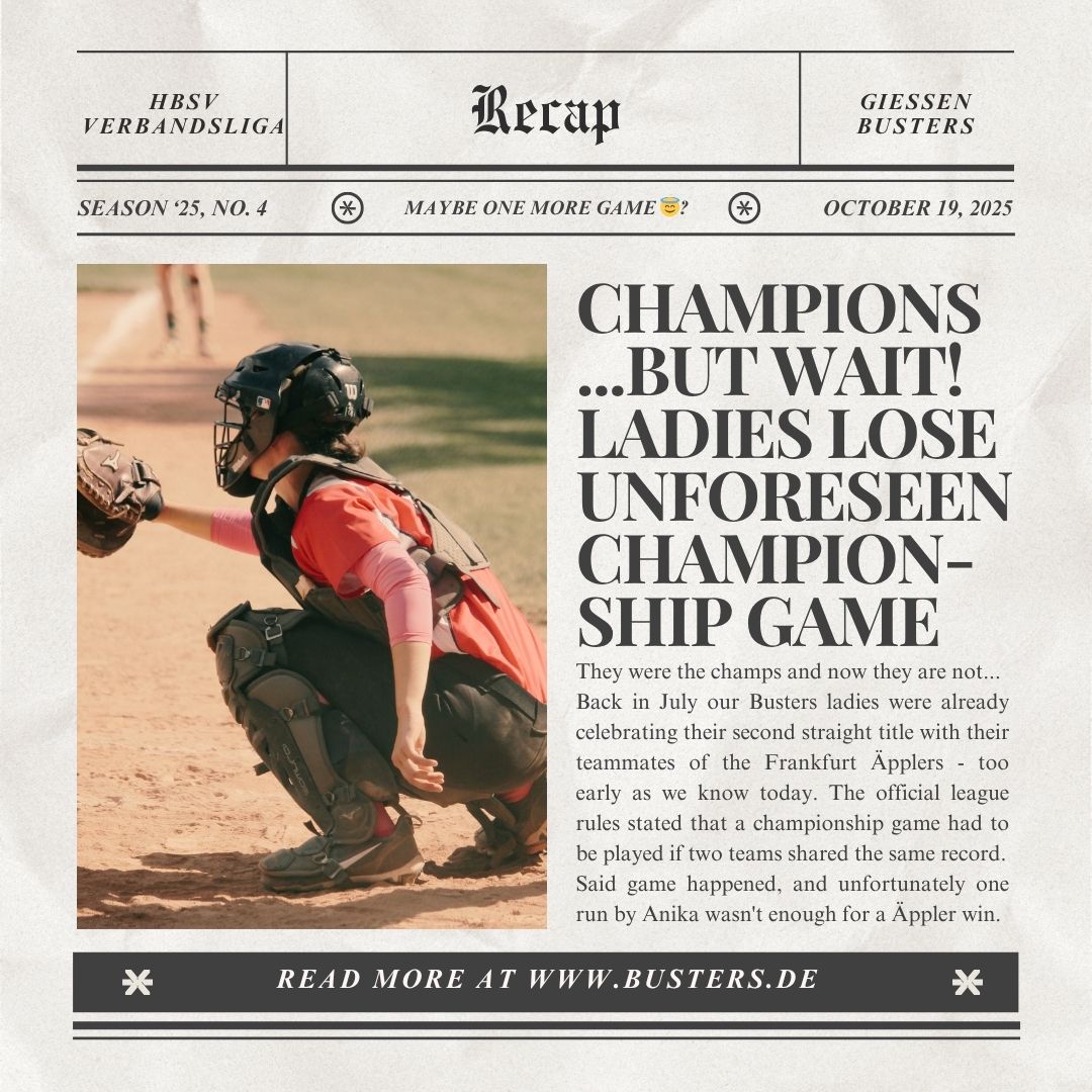 Die geneigten Leserinnen und Leser unter euch werden sich erinnern, dass wir an dieser Stelle vor einigen Wochen bereits die Meisterschaft für die Äpplers, und somit auch unsere Busters-Damen, in der Softball-Verbandsliga verkündeten. Doch nicht so schnell dachten sich die Verantwortlichen des HBSV und SWBSV: Aufgrund einer Regelung, die bei Gleichstand in der Tabelle ein Entscheidungsspiel fordert, ging es für unsere Damen am Sonntag – unerwarteterweise – nochmal auf den Diamond, um nun die Meisterschaft wirklich zu gewinnen.