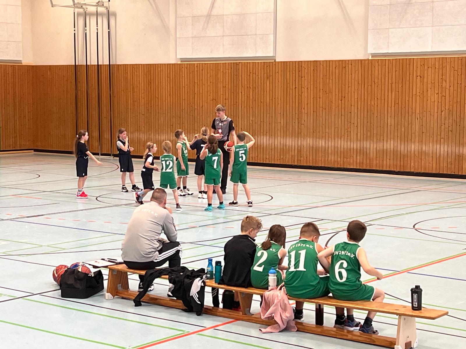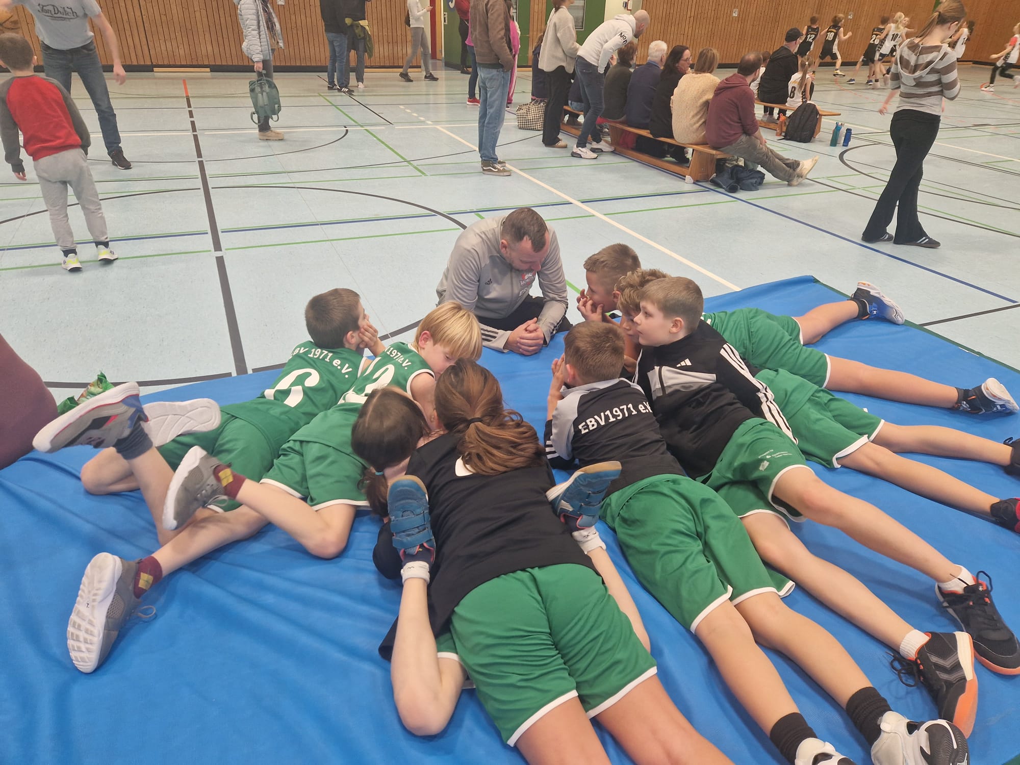 Der EBV begann mit Otto Engelien, Lia Charlotte Wilke, Tomke Domachowski und Lenny Rüdiger. Nach anfänglichem nervösem Beginn beiderseits kam es danach schnell zu den ersten Körben für beide Teams. Das Spiel war vorerst ziemlich ausgeglichen. Im zweiten Viertel kamen dann Diego Joel Schaeffer, Henry Matteo Pirke, Merle Müller, Karl Stolz zu ihrem ersten Einsatz. Mit guten Einzelaktionen und durch gutes Zusammenspiel wurde das erste Spiel gewonnen.