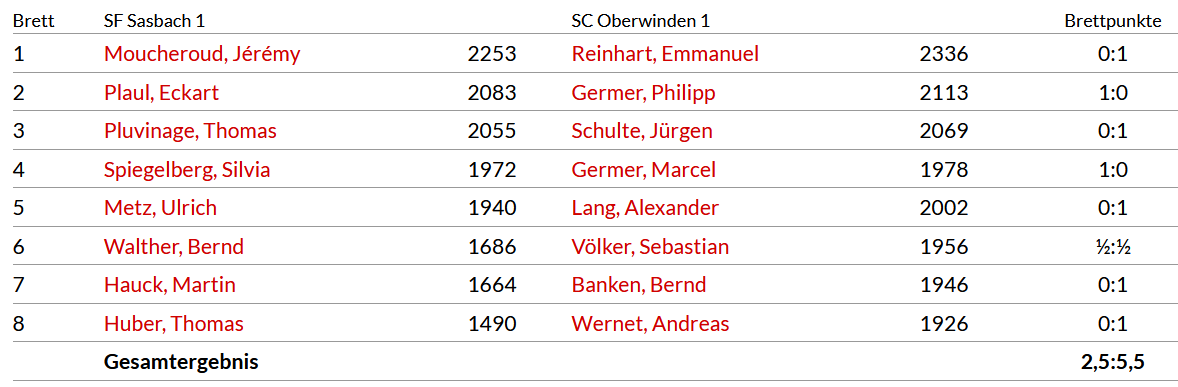 Die erste Mannschaft erzielte in Sasbach einen 5,5:2,5 Auswärtserfolg und setzte sich damit überraschend an die Spitze der Verbandsligatabelle. Die Aussagekraft der Tabellenführung ist nach zwei Spieltagen natürlich noch nicht besonders hoch, aber ein gelungener Start in die Saison ist es allemal.