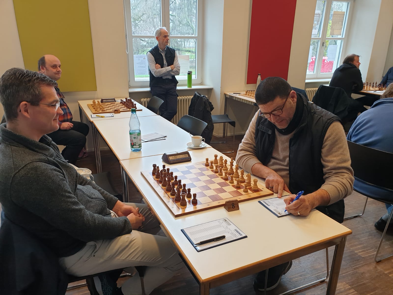 Tim hatte erst stark positionellen Vorteil errungen mit taktischen Optionen. Die schlechte Zeit des Gegners half ein wenig mit und er kam mit zwei Mehrbauern ins Endspiel. Zusätzlich war sein Läuferpaar dominant und Tims Sieg sicherte uns den ersten Heimerfolg dieses Jahr! Jafar hatte eine ambitionierte Partie gespielt, aber das Endspiel sah eher kritisch aus gegen zwei verbundene Freibauern des Gegners. Aber die aktivere Figurenstellung veranlasste den Gegner zu riskantem Spiel. Er opferte zwei Bauern, um einen Freibauern voranzupreschen. Doch Jafar blieb cool und opferte seinen Springer. Das spannende Endspiel Turm und 4 Bauern gegen Turm, Springer und ein Bauer gewann er im Blitzduell. Die Bedenkzeit Fischer kurz bringt das bei komplizierten Endspielen so mit sich. Dadurch konnte mit 5,5 – 2,5 ein wichtiger Sieg in der erneuten Mission Klassenerhalt eingefahren werden!