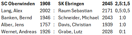 An Brett 3 nutzte Jens seinen Raumvorteil für einen Königsangriff und konnte damit noch vor der Zeitkontrolle den vollen Punkt für Oberwinden holen. Eine sehr starke Leistung gegen einen deutlich stärkeren Gegner.
