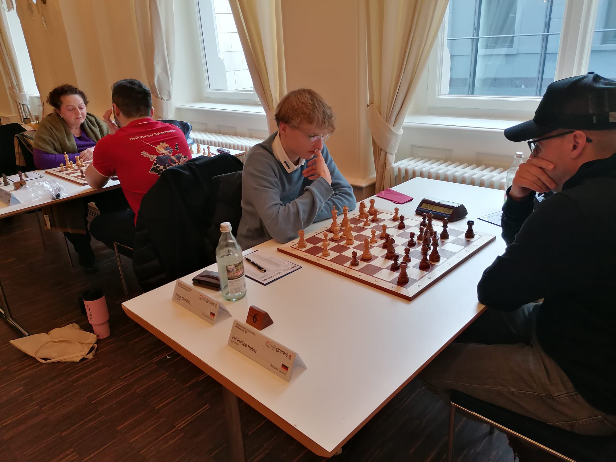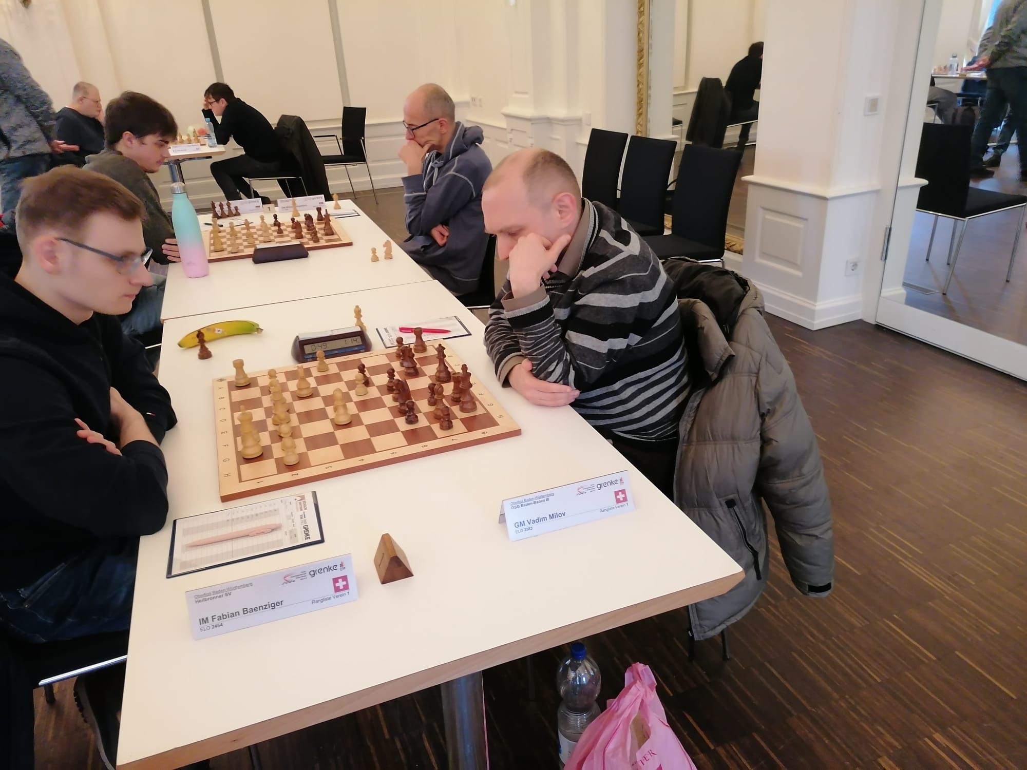 Der Wettkampf begann mit zwei Remisen an Brett 4 durch Ketino Kachiani Gersinska sowie an Brett 8 durch Daniel Schmitt. Besonders an den vorderen Brettern konnten wir jedoch überzeugen. Vadim Milov an Brett 1, Philipp Schlosser an Brett 2 sowie unser Topscorer Dennis Breder an Brett 3 steuerten jeweils volle Punkte bei. Dennis sollte an diesem Wochenende seine weiße Weste mit einem hundert Prozent Ergebnis wahren.