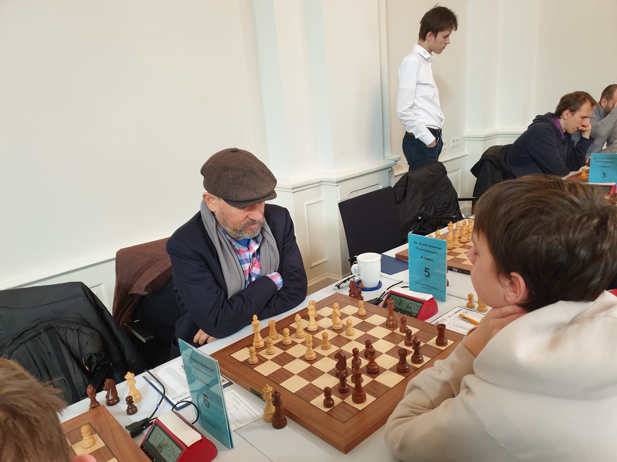 Michail Peterman, Spitzenbrett OSG fünf in der Verbandsliga mit einem Remis gegen GM Schlosser in Runde 2.