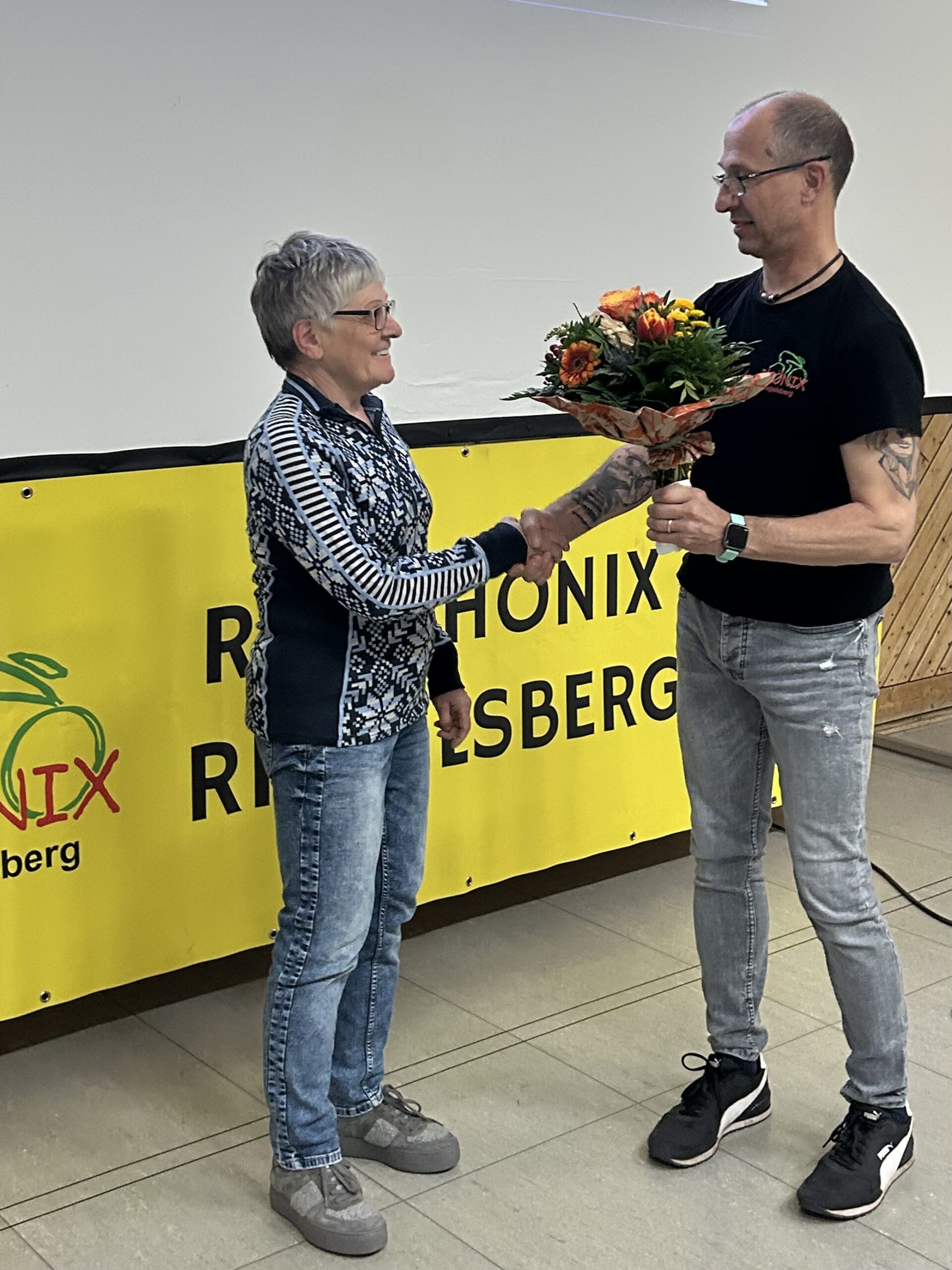 Zudem wurden die vorangekündigten Anpassungen der Satzung beschlossen und und der Vorstand teilweise neu aufgestellt. Vielen Dank an Stefan Blank für die Übernahme des Amts des zweiten Vorsitzenden sowie an Silke Philippi, die nun als Geschäftsführerin tätig ist. Gemeinsam haben wir unsere langjährige Geschäftsführerin Martina Dörr feierlich verabschiedet. Wir bedanken uns herzlich für ihr tatkräftiges Engagement für die RSF Phönix Riegelsberg e.V.