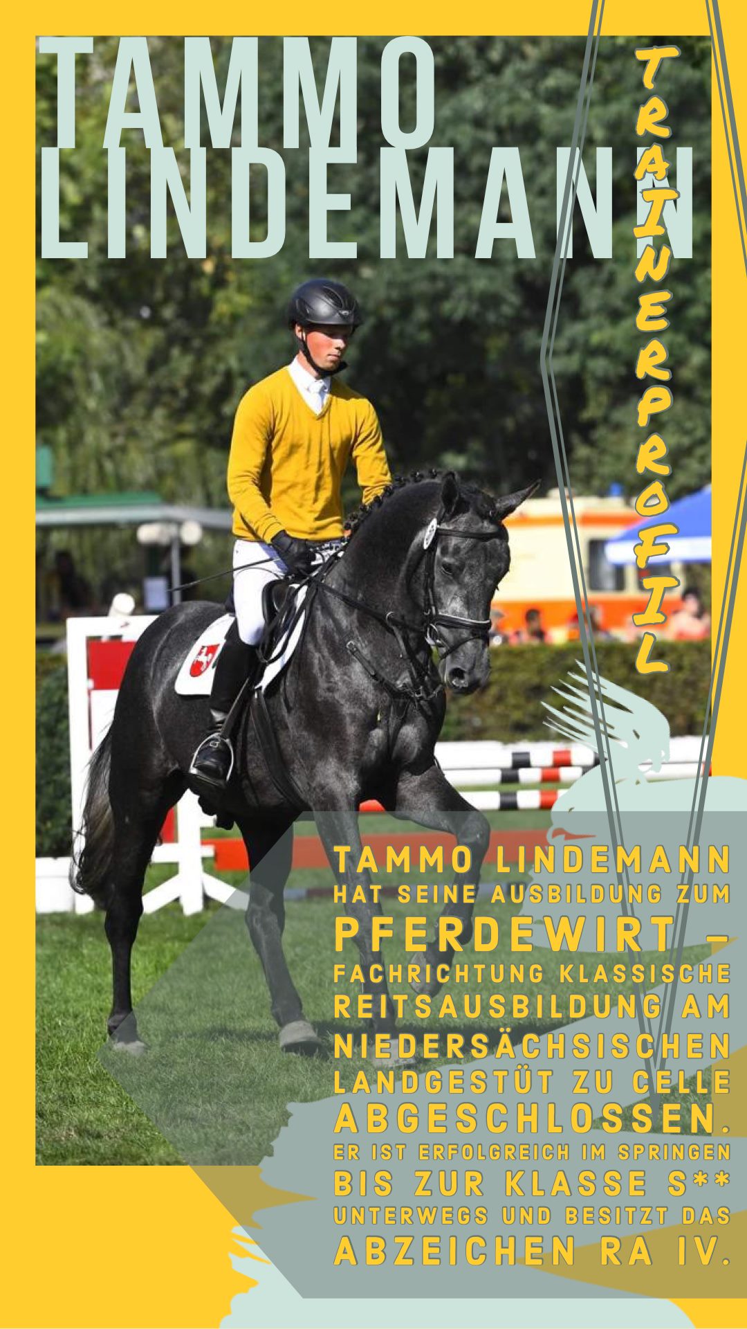 Tammo ist Pferdewirt der Klassischen Reitweise und hat seine Ausbildung im Landesgestüt Celle absolviert. Er selbst ist im Springsport der Klasse S unterwegs und bietet ab sofort auch jeden Montag den Springunterricht bei uns an. Zudem bietet er auch Dressurstunden (derzeit nur Einzelstunden), Beritt und Lehrgänge an.