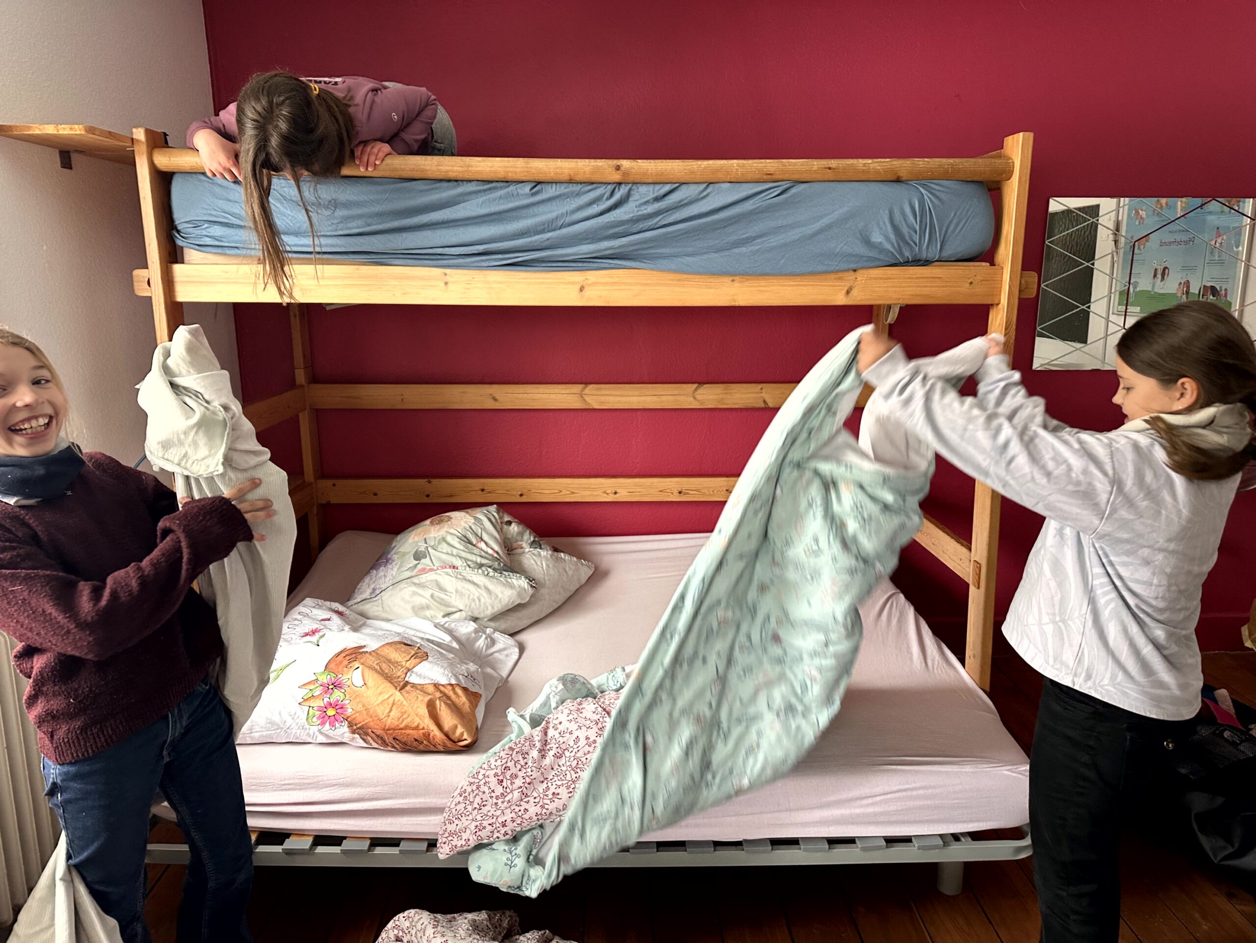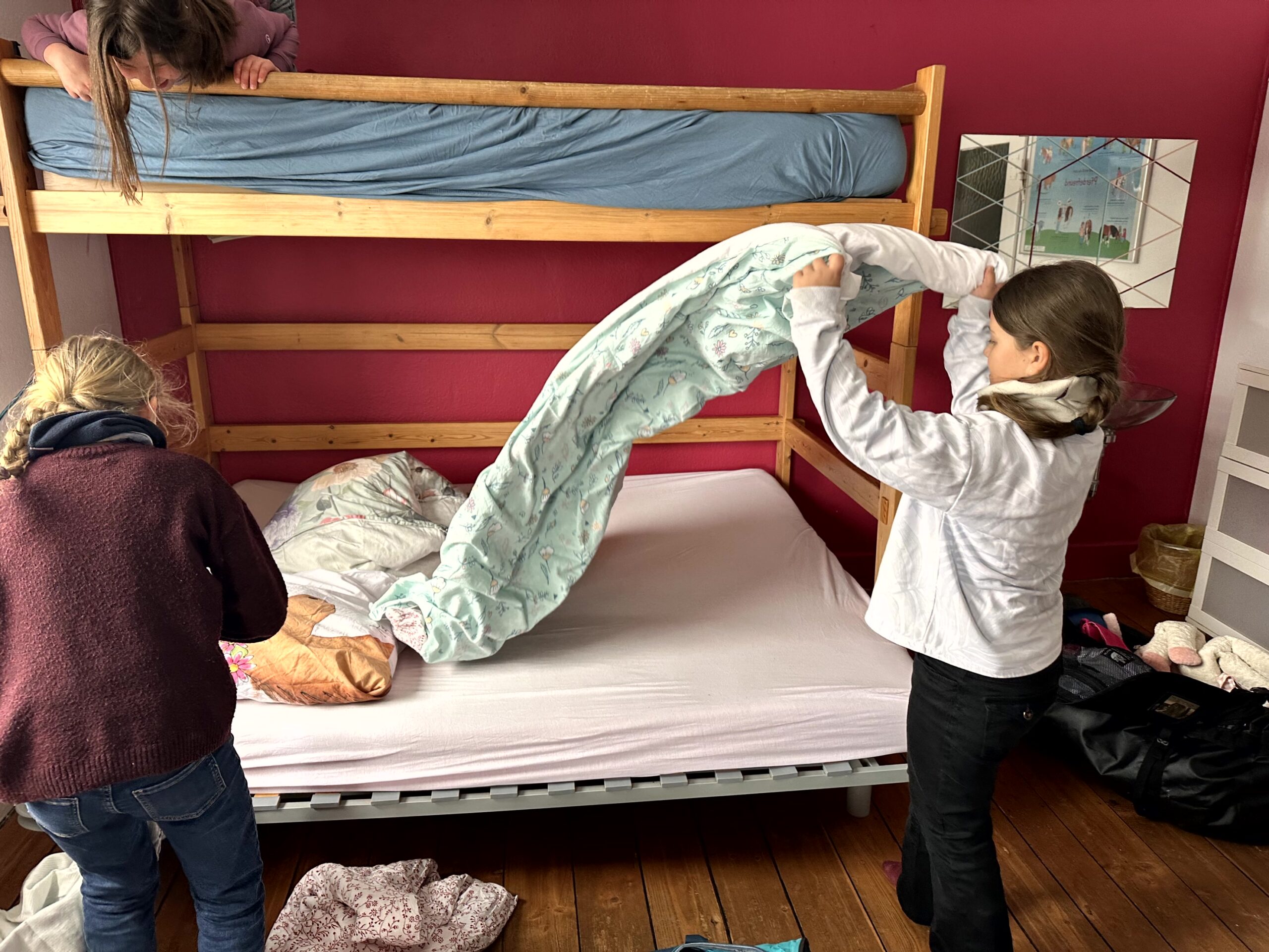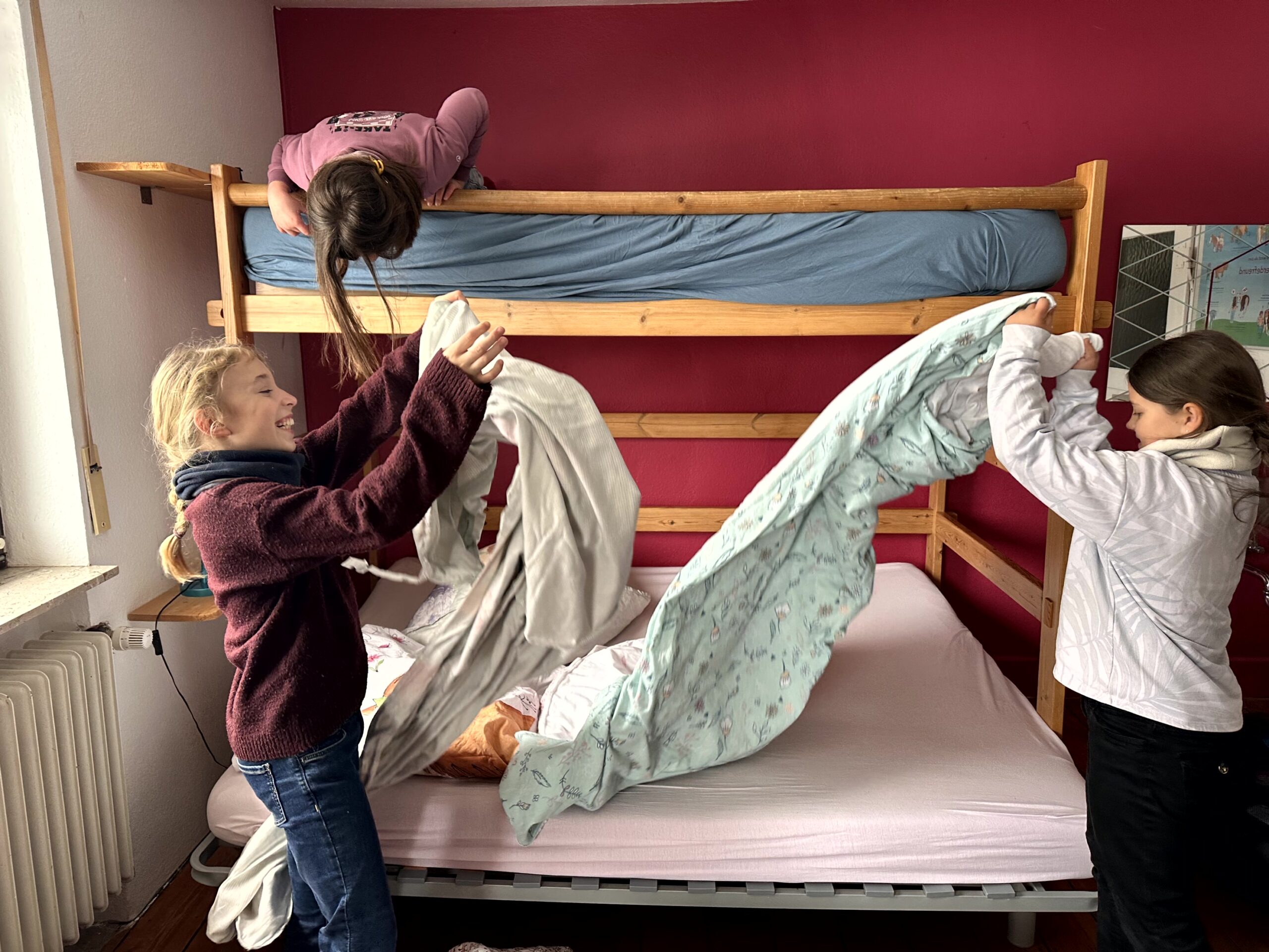 Nach einer gemütlichen Vorstellungsrunde, bei der wir uns alle erst einmal beschnuppern konnten, stand der wohl spannendste Moment an: die Ponyeinteilung! Jedes Kind hat sein passendes Gegenstück auf vier Hufen gefunden. Danach ging es ans Einquartieren. Wir haben unsere Zimmer bezogen – und dabei gab es für den einen oder anderen direkt die erste kleine Herausforderung der Woche: Zum ersten Mal ganz alleine die Bettwäsche beziehen! Da wurde gleich mal was Neues gelernt, und mit ein bisschen Teamwork war das Ganze schnell (und mit viel Gelächter) erledigt.