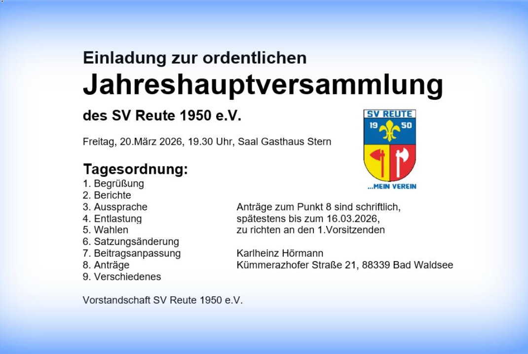 Der SV Reute 1950 e.V. lädt alle Mitglieder, Anhänger, Förderer, Freunde und sonstigen Interessierten zu seiner ordentlichen Jahreshauptversammlung am Freitag, 20. März 2026, ins Gasthaus Stern (Saal) ein. Auf der Tagesordnung stehen neben den Vorstandsberichten und üblichen Regularien auch Wahlen und eine Satzungsänderung, Beginn ist um 19.30 Uhr.