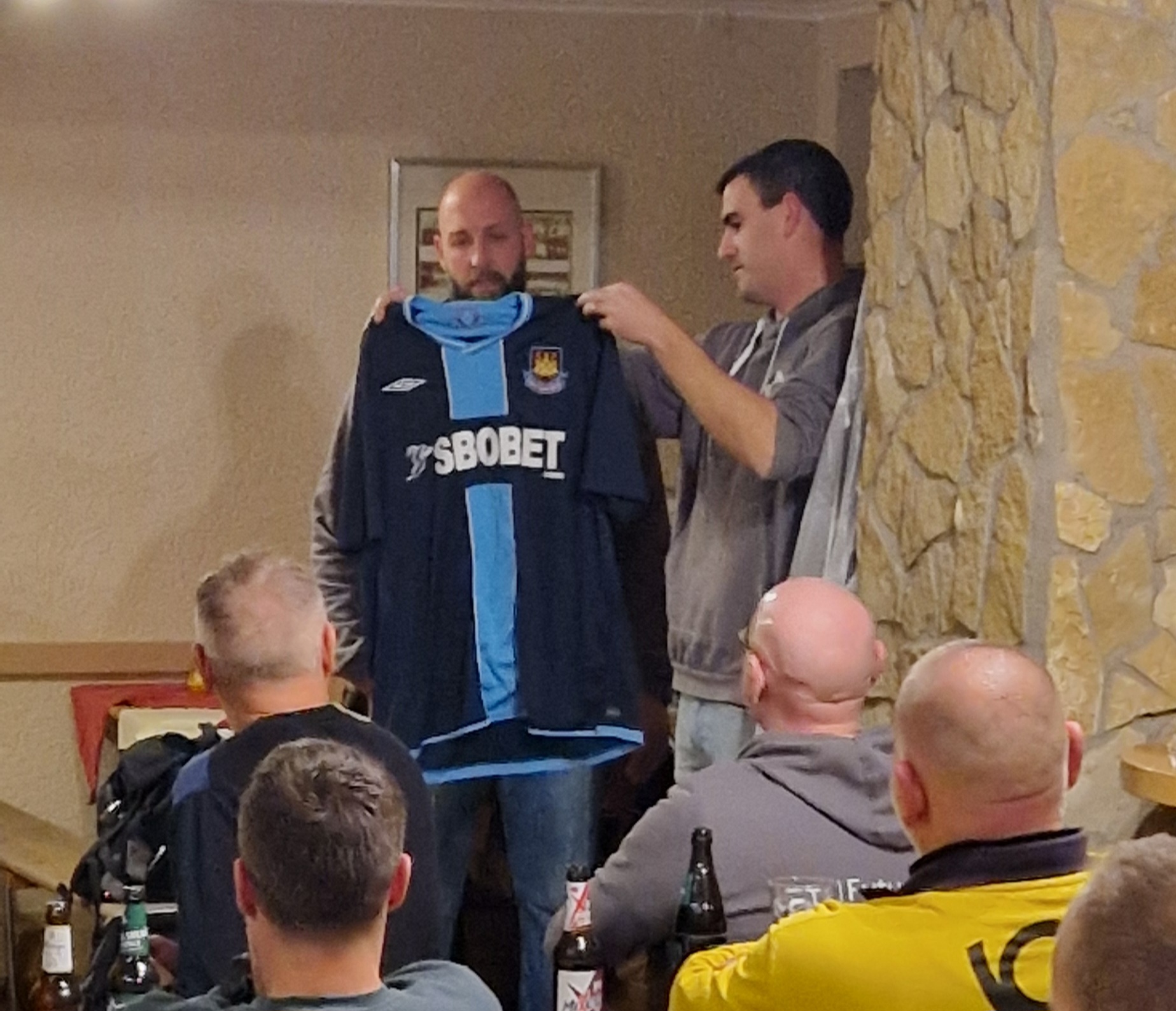 Besonders gedankt wurde der Clubheimwirtin Sarah Podevin, die „ihre“ Alten Herren jeden Donnerstag auch mal bis zu vorgerückter Stunde mit isotonischen Getränken versorgt. Das ist ein perfektes Match zwischen Sarah und der AH! Auch Frank Bickelmann, der sich um die Trikots bei den Spielen kümmert und den internen Sponsoren der AH wurden wie unserem AH Spieler und zugleich 1.Vorsitzender Florian Feit gedankt. Die AH Abteilung ist für Florian eine wichtige Säule im Gesamtverein und er hat immer ein offenes Ohr für die Anliegen der AH. Dann wurde es noch einmal emotional, denn auch die Männer der AH hatten für ihren „Chef“ Jan Thielen etwas besorgt – ein original West Ham United Trikot mit Spielerunterschrift rührte den starken Mann dann doch sehr. Der Abend klang mit einem gemeinsamen geselligen Absch(l)uss aus, bei dem noch lange gelacht, gefeiert und auf das vergangene Jahr angestoßen wurde. Mit Vorfreude blicken die Alten Herren nun auf das kommende Jahr und weitere gemeinsame Erlebnisse.