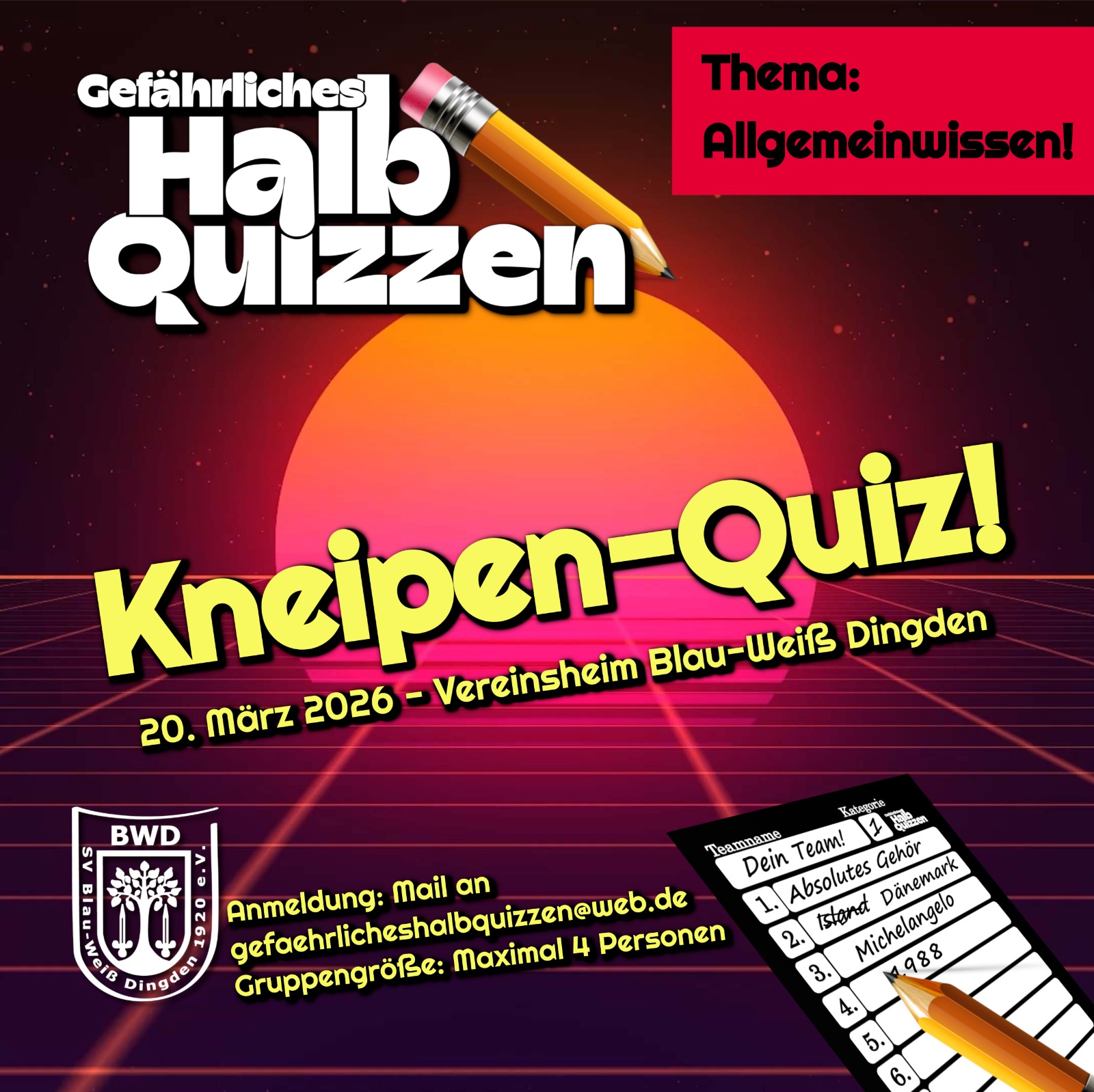 Es ist wieder soweit! Das Team „Gefährliches HalbQuizzen“ lädt euch im Vereinsheim von Blau-Weiß Dingden ein. Am 20. März um 19:00 Uhr geht’s los – stellt euer Wissen in spannenden Runden zum Thema: Allgemeinwissen unter Beweis.
