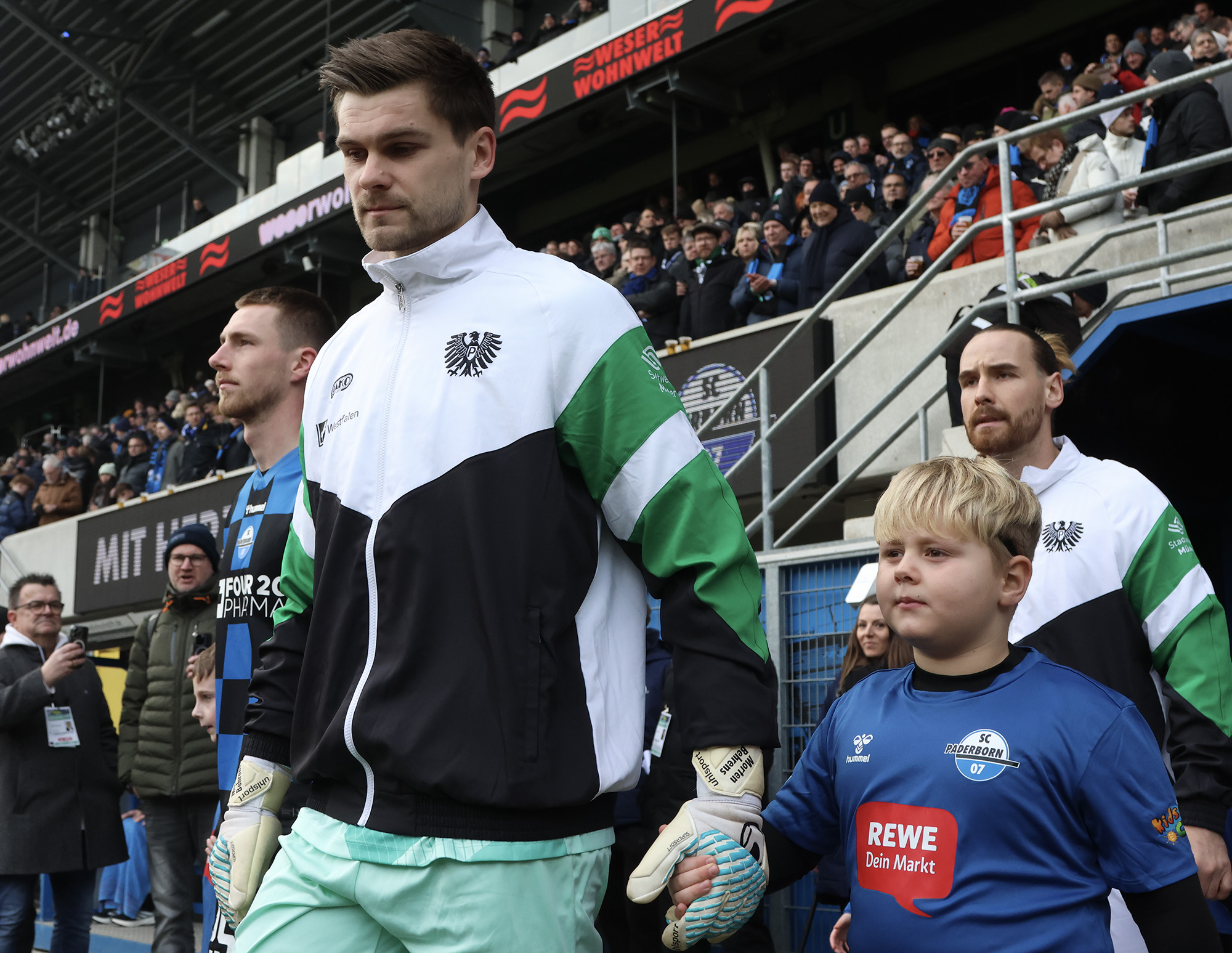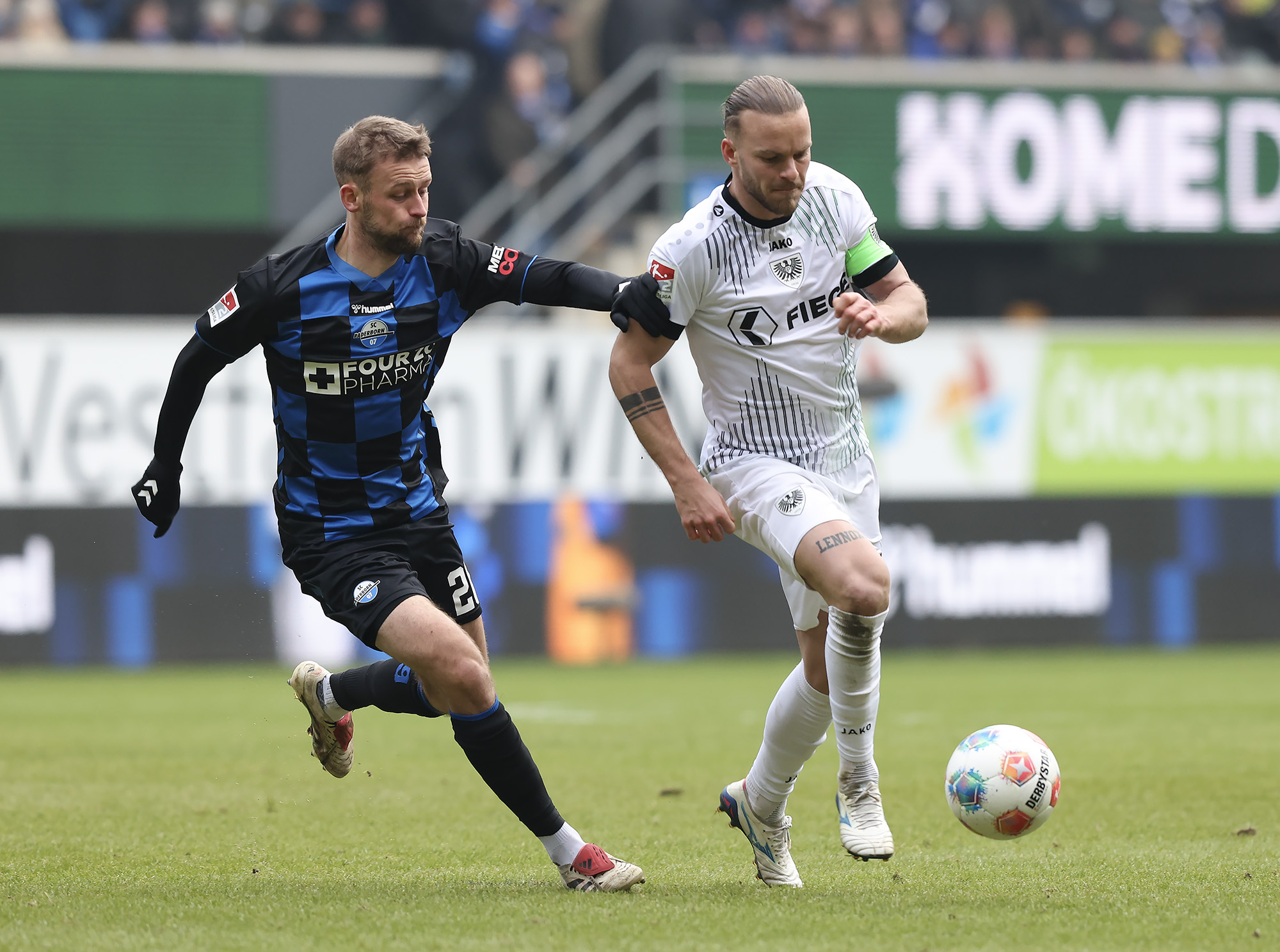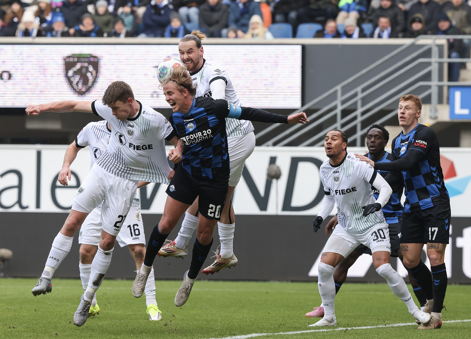 Das Trainerteam musste neben den zahlreichen verletzen Spielern und dem gesperrten Paul Jaeckel – vertreten durch Torge Paetow – kurzfristig auch auf Torhüter Johannes Schenk verzichten, der krankheitsbedingt passen musste. Für ihn stand Morten Behrens zwischen den Pfosten. Die Preußen erwischten einen optimalen Start an der Pader: Eine perfekt getimte Flanke von Ter Horst in die gefährliche Zone fand mit Amenyido den richtigen Abnehmer. Mit dem Kopf musste unsere eingelaufene Nummer 30 “nur noch“ einnicken. Zwei Minuten waren da gespielt. Der SC Paderborn zeigte sich vom frühen Rückstand nicht geschockt, überzeugten vor allem spielerisch und wurde durch Bilbija in der 17. Minute erstmals richtig gefährlich. Auch die Preußen ließen die Murmel gut laufen, verloren allerdings in einigen aussichtsreichen Situationen noch zu einfach den Ball. Dennoch tauchten sie immer wieder in der heißen Zone auf – etwa nach einer gut reingebrachten Ecke (18.) oder bei einem knallharten Distanzschuss von Heuer, den der Paderborner Schlussmann nur zur Ecke klären konnte.