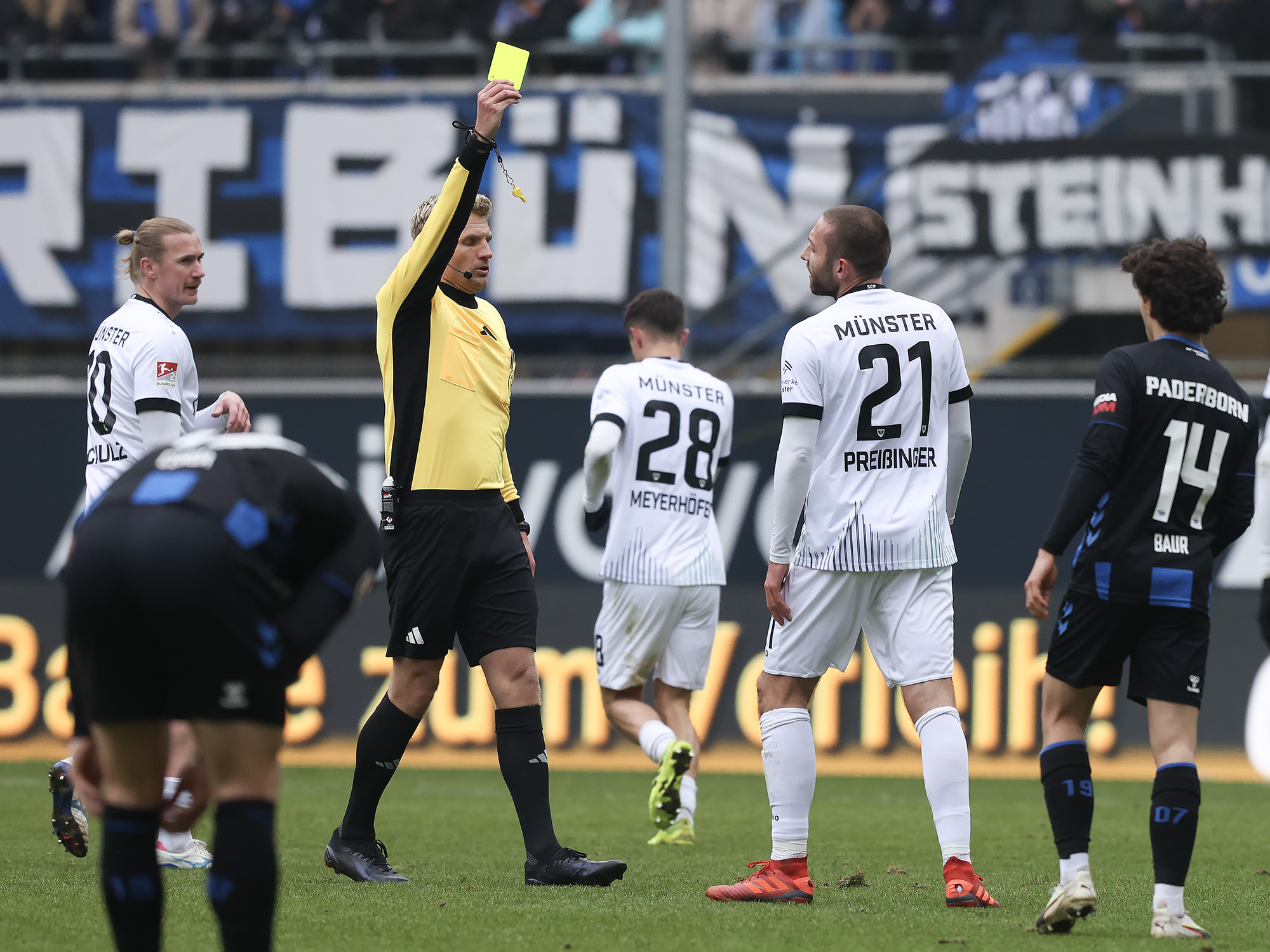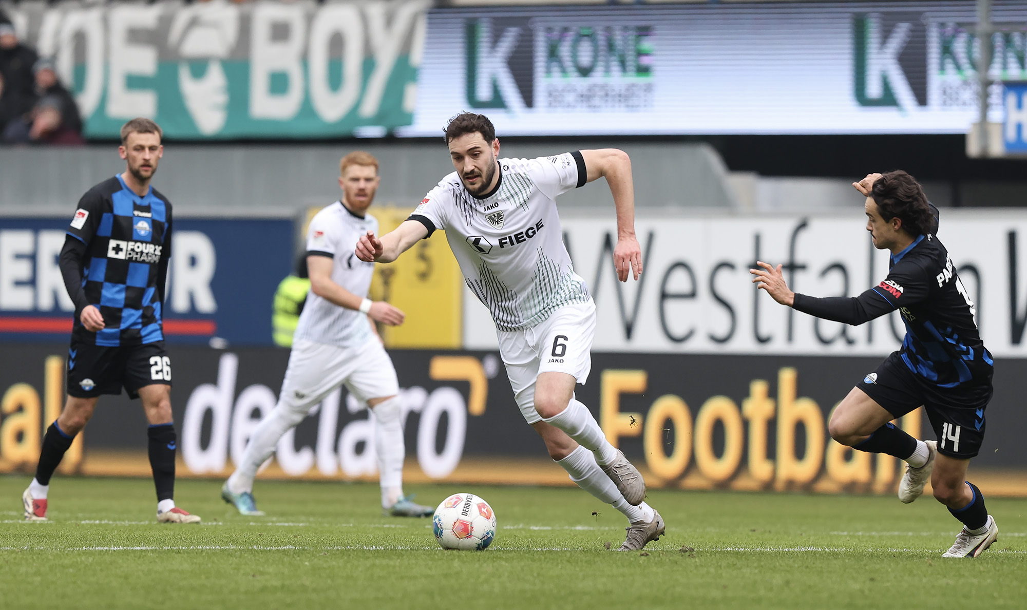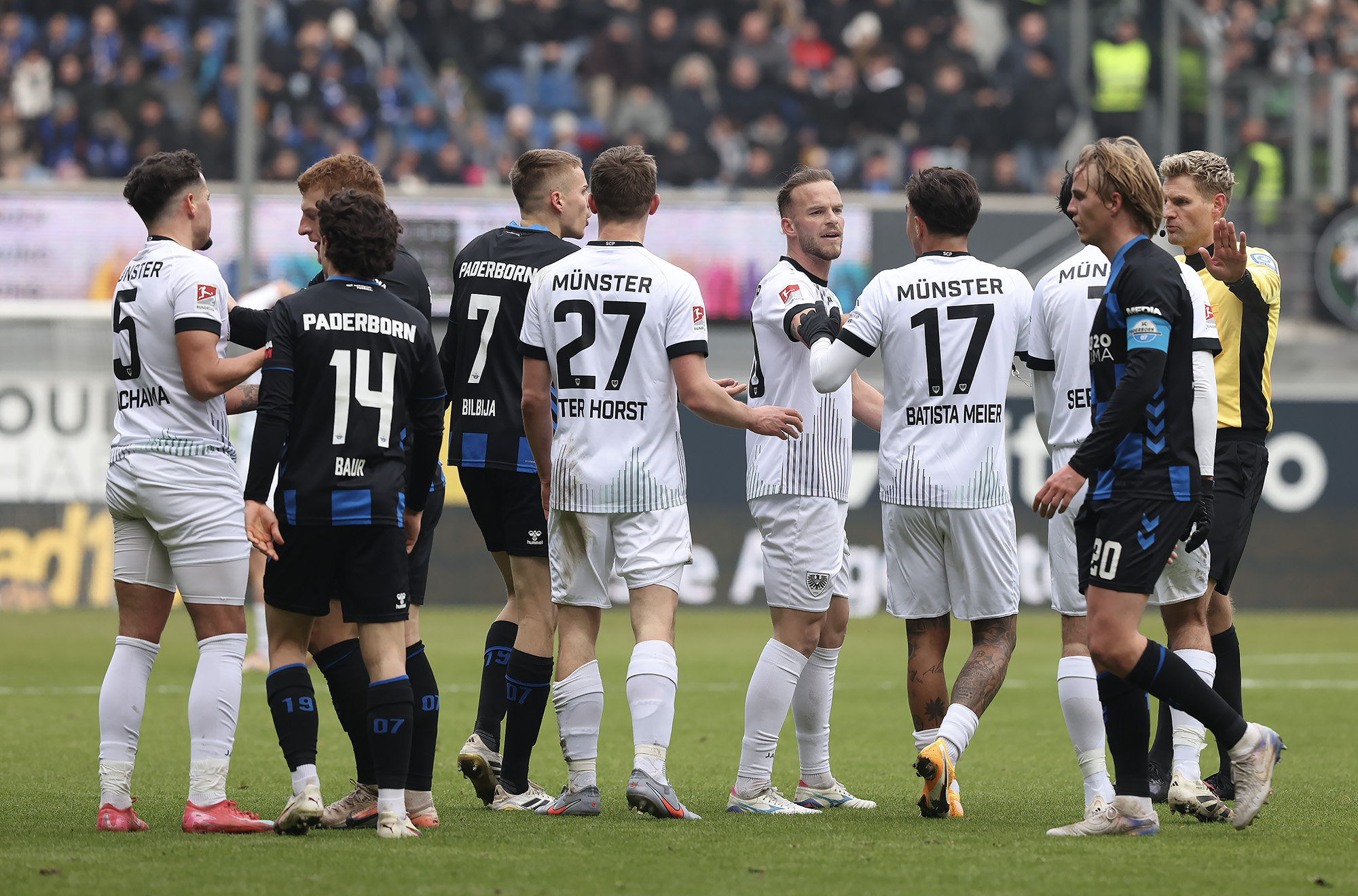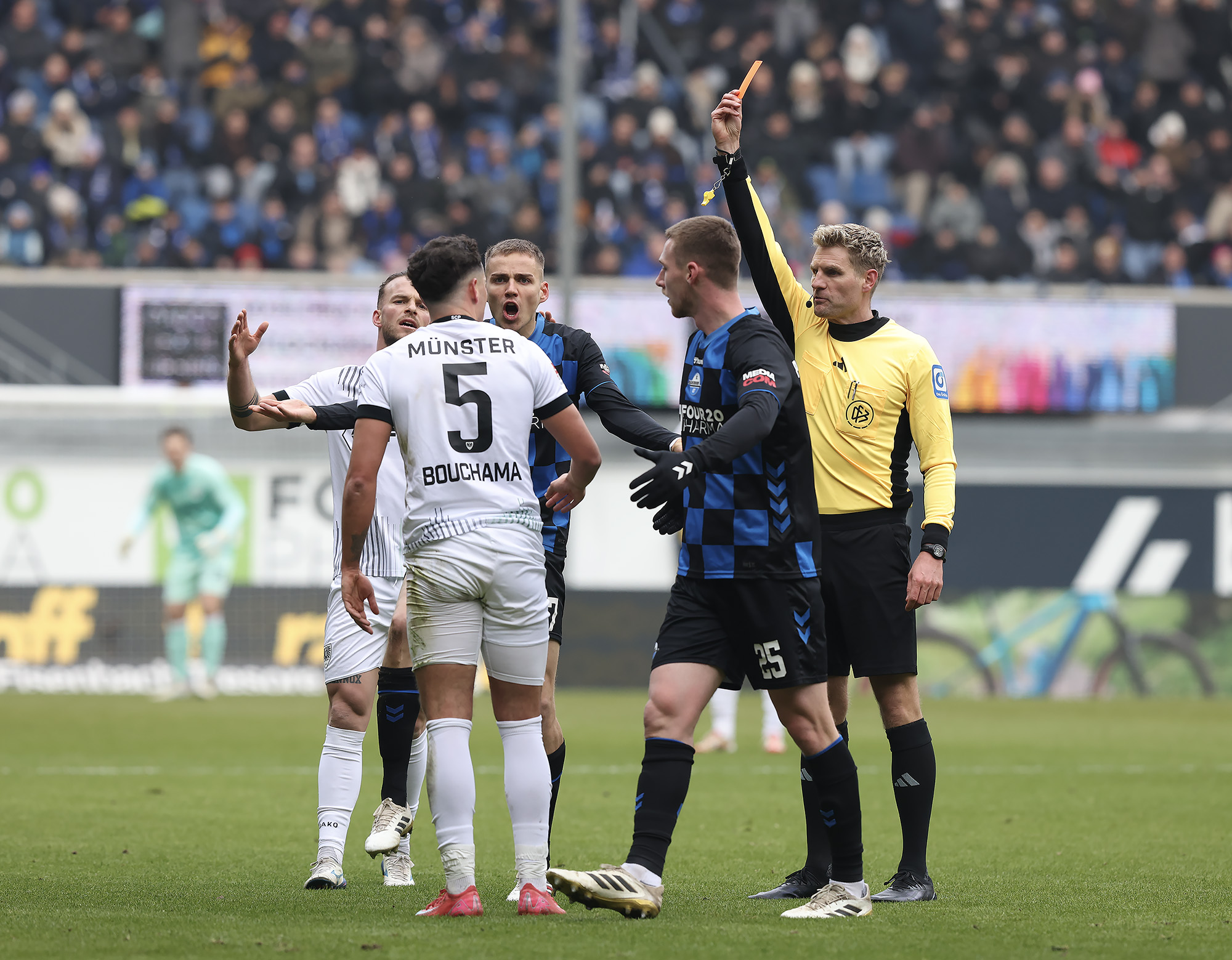 Eine halbe Stunde war gespielt, ehe der nächste Rückschlag weggesteckt werden musste: Bouchama setzte gegen Obermeier zur Grätsche an, kam aber zu spät. Da Bouchama das Bein ohne Chance auf den Ball noch hochzog, wertete Schiedsrichter Timo Gerach die Situation als Unsportlichkeit und zückte die Rote Karte. Kurz drauf wechselte der SCP taktisch und brachte Meyerhöfer für Batista Meier. Der Matchplan der Münsteraner war damit ausgehebelt und die Ostwestfalen drückten auf den Ausgleich. Der SC Paderborn versucht immer wieder mit schönen Doppelpässen durchzudringen, unsere Jungs hielten allerdings gut dagegen, nahmen die Laufwege des Gegners auf und verteidigten leidenschaftlich. In der Nachspielzeit der ersten Halbzeit ertönte dann die Paderborner Torhymne, als Castaneda den Ball im Preußen-Tor unterbrachte. Der Jubel verstummte aber, weil Mitspieler Bilbija zwar nicht an den Ball kam, aus Abseitsposition aber entscheidend störte. Folgerichtig zählte der Treffer nicht – Glück für den Sportclub.