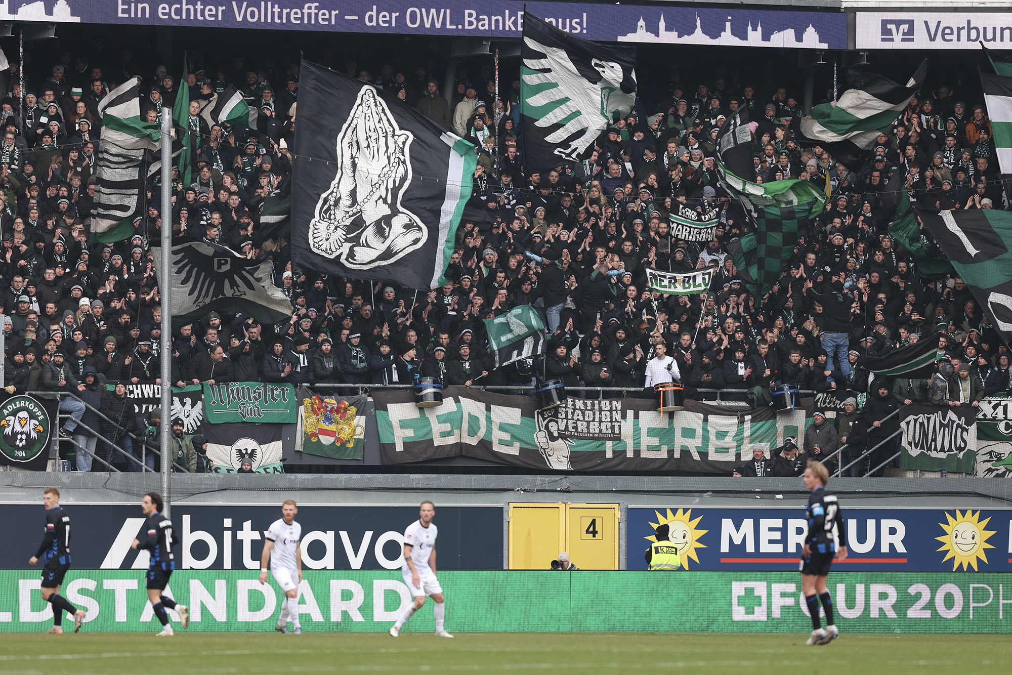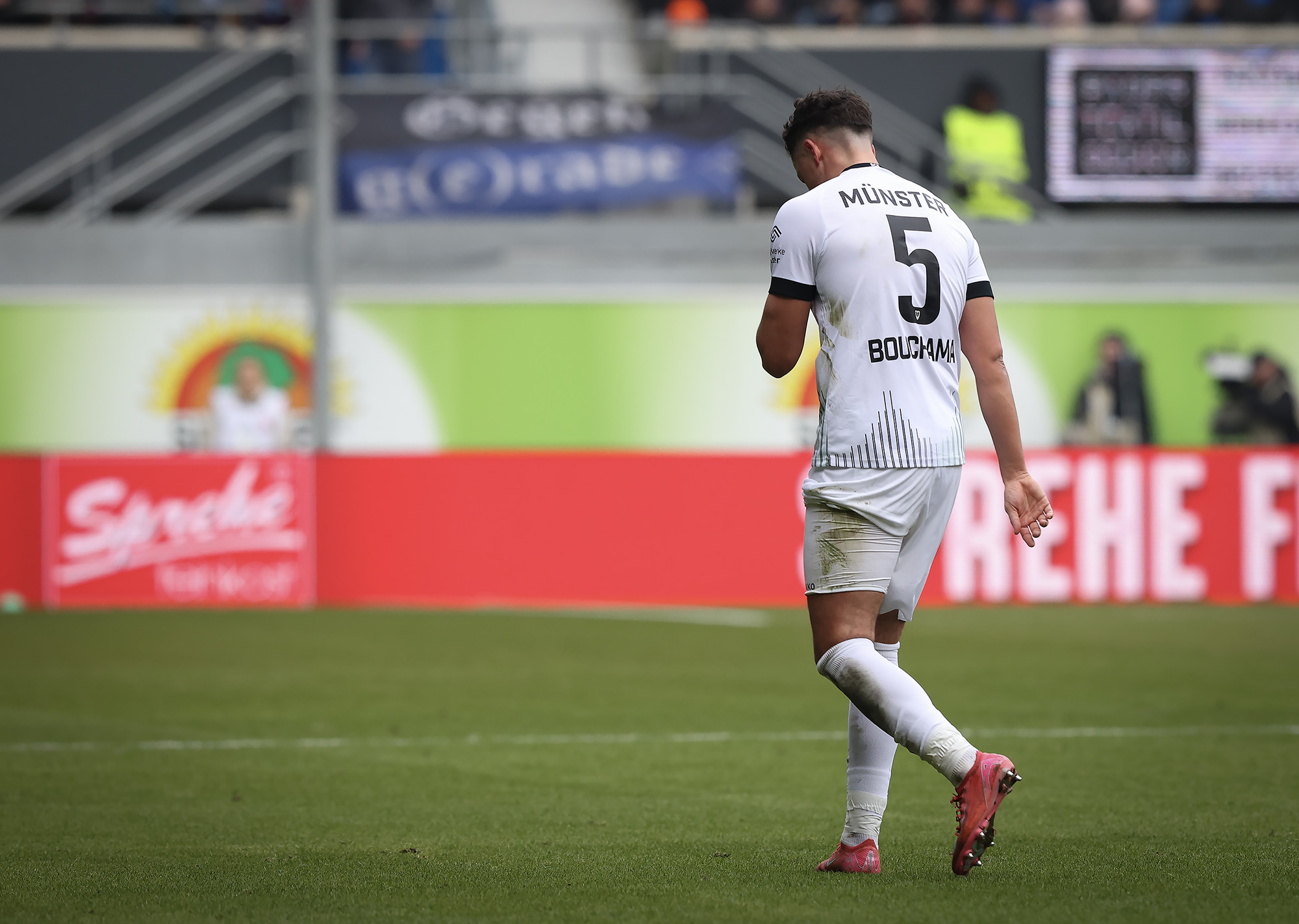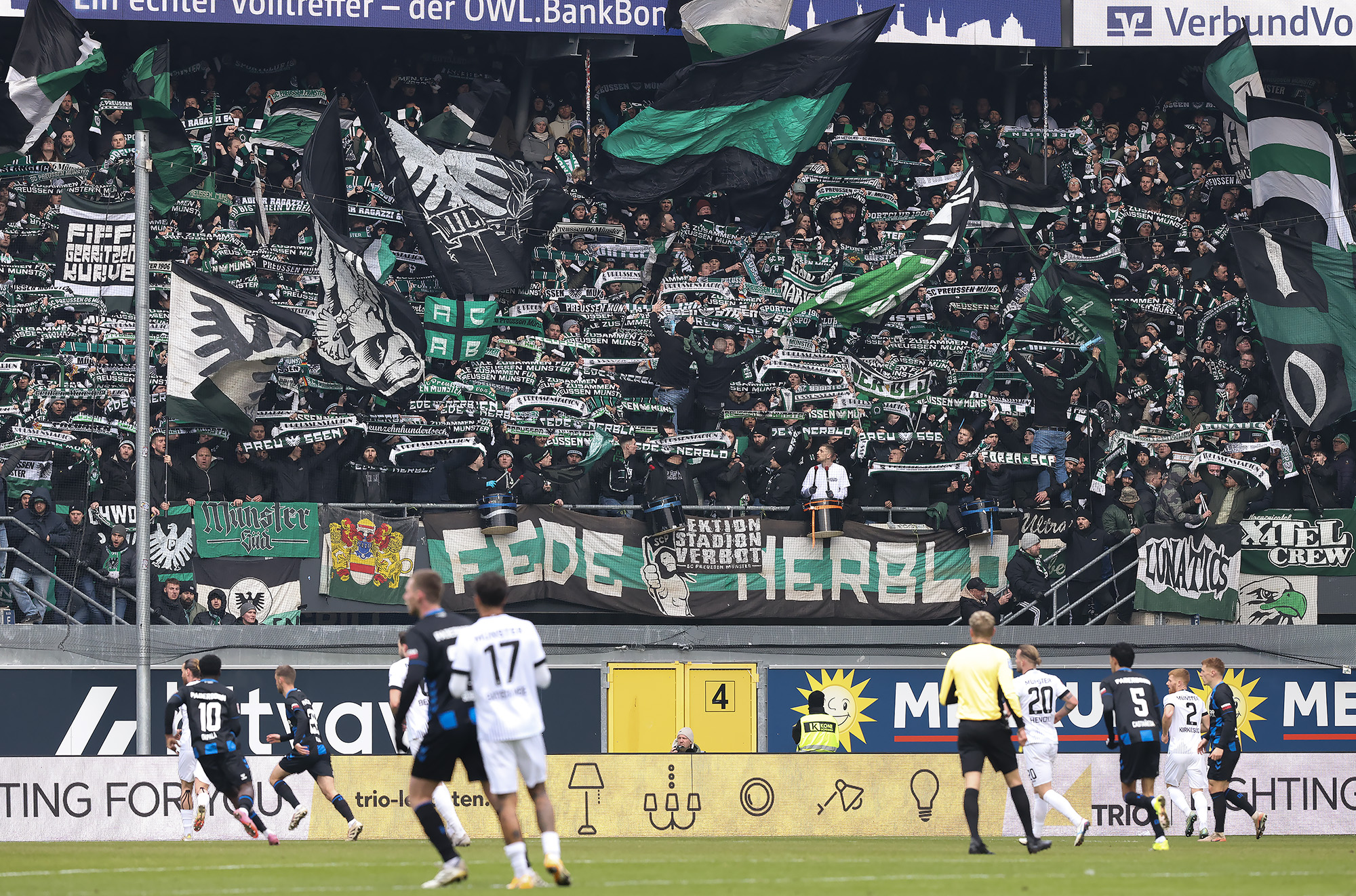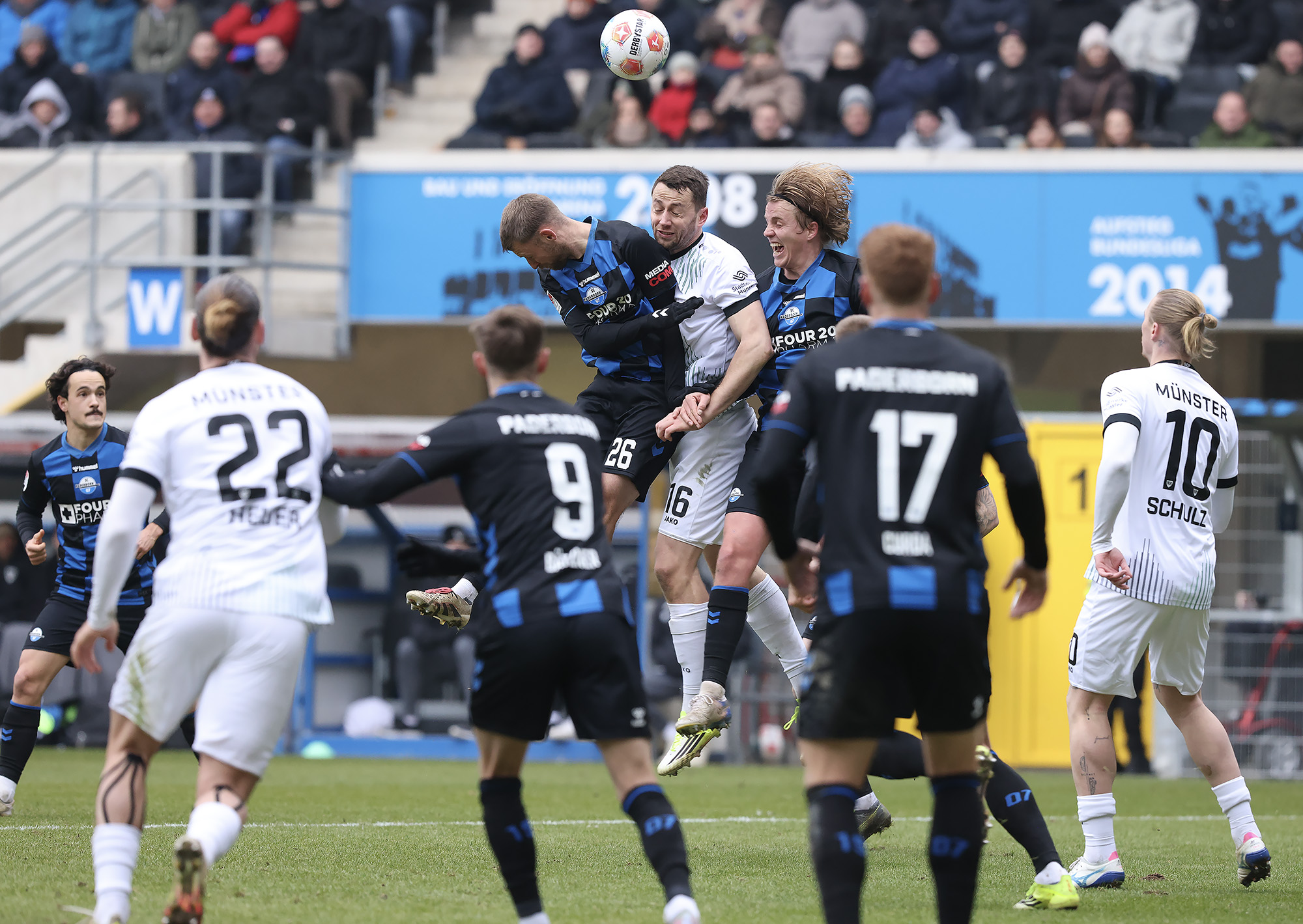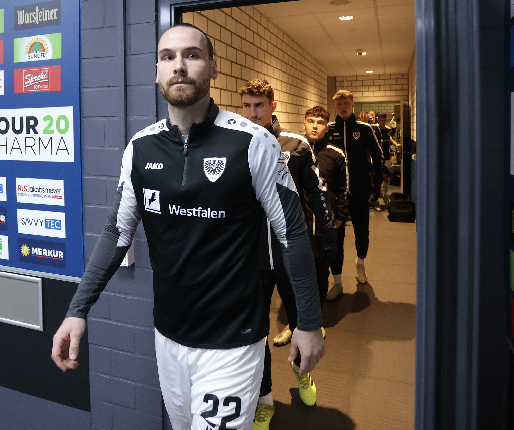 Eine halbe Stunde war gespielt, ehe der nächste Rückschlag weggesteckt werden musste: Bouchama setzte gegen Obermeier zur Grätsche an, kam aber zu spät. Da Bouchama das Bein ohne Chance auf den Ball noch hochzog, wertete Schiedsrichter Timo Gerach die Situation als Unsportlichkeit und zückte die Rote Karte. Kurz drauf wechselte der SCP taktisch und brachte Meyerhöfer für Batista Meier. Der Matchplan der Münsteraner war damit ausgehebelt und die Ostwestfalen drückten auf den Ausgleich. Der SC Paderborn versucht immer wieder mit schönen Doppelpässen durchzudringen, unsere Jungs hielten allerdings gut dagegen, nahmen die Laufwege des Gegners auf und verteidigten leidenschaftlich. In der Nachspielzeit der ersten Halbzeit ertönte dann die Paderborner Torhymne, als Castaneda den Ball im Preußen-Tor unterbrachte. Der Jubel verstummte aber, weil Mitspieler Bilbija zwar nicht an den Ball kam, aus Abseitsposition aber entscheidend störte. Folgerichtig zählte der Treffer nicht – Glück für den Sportclub.