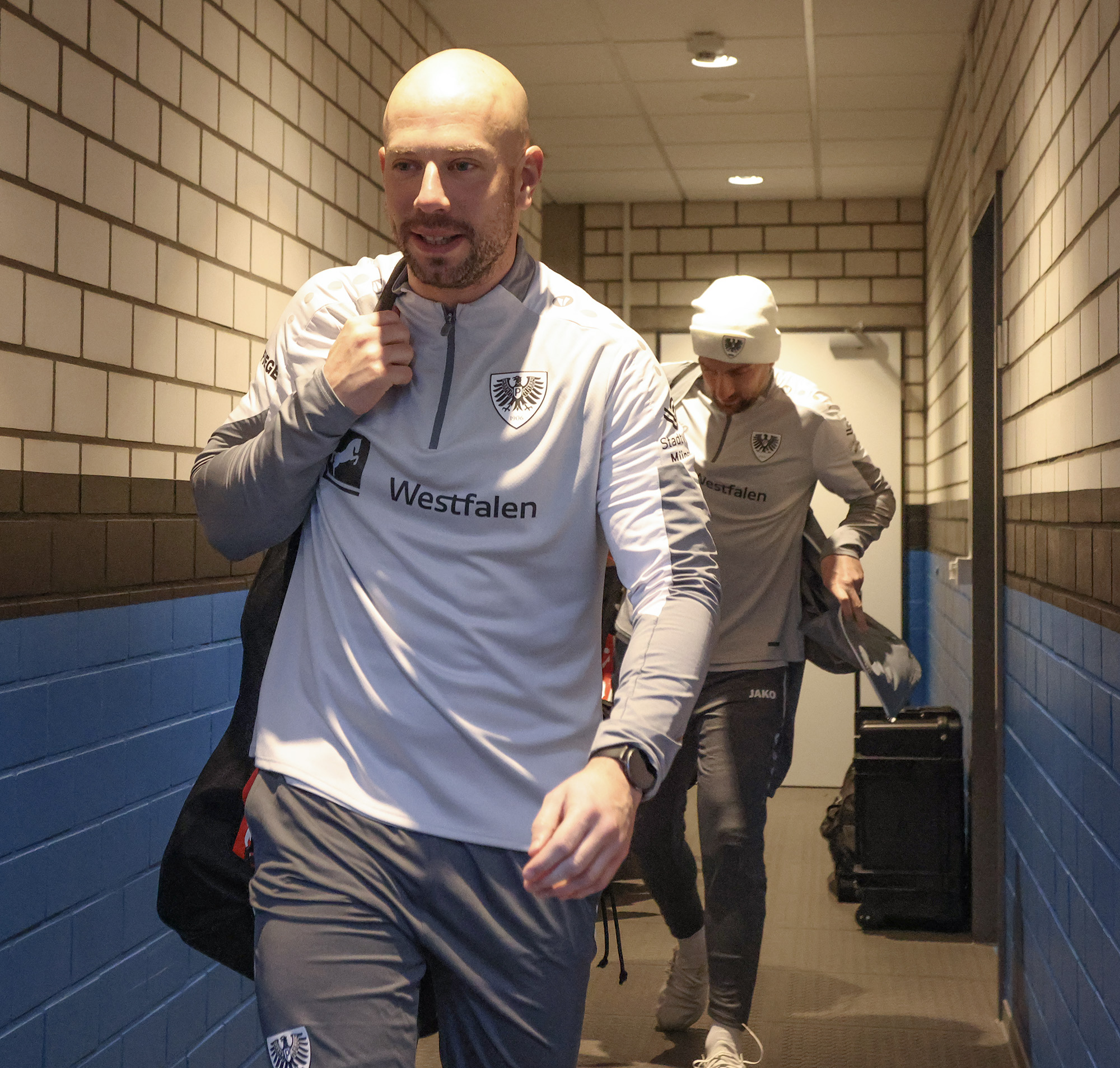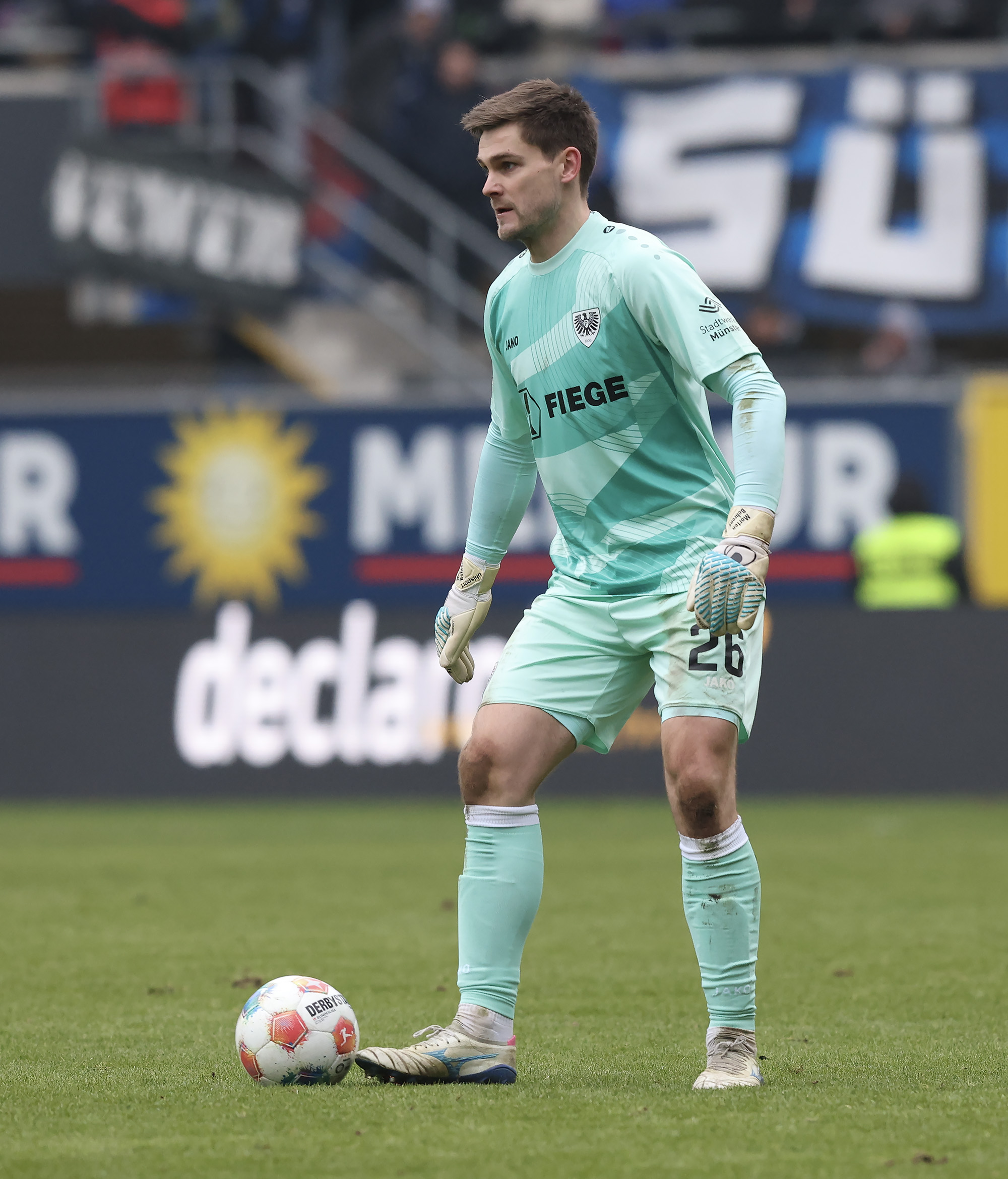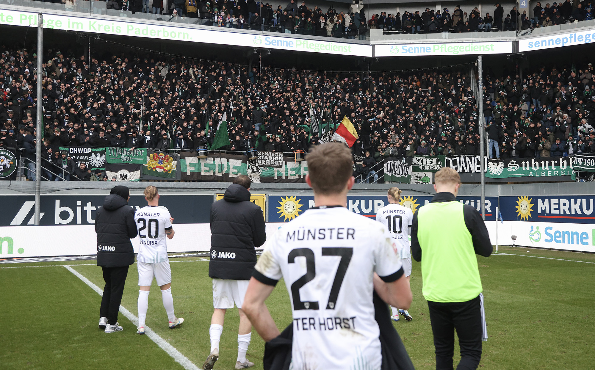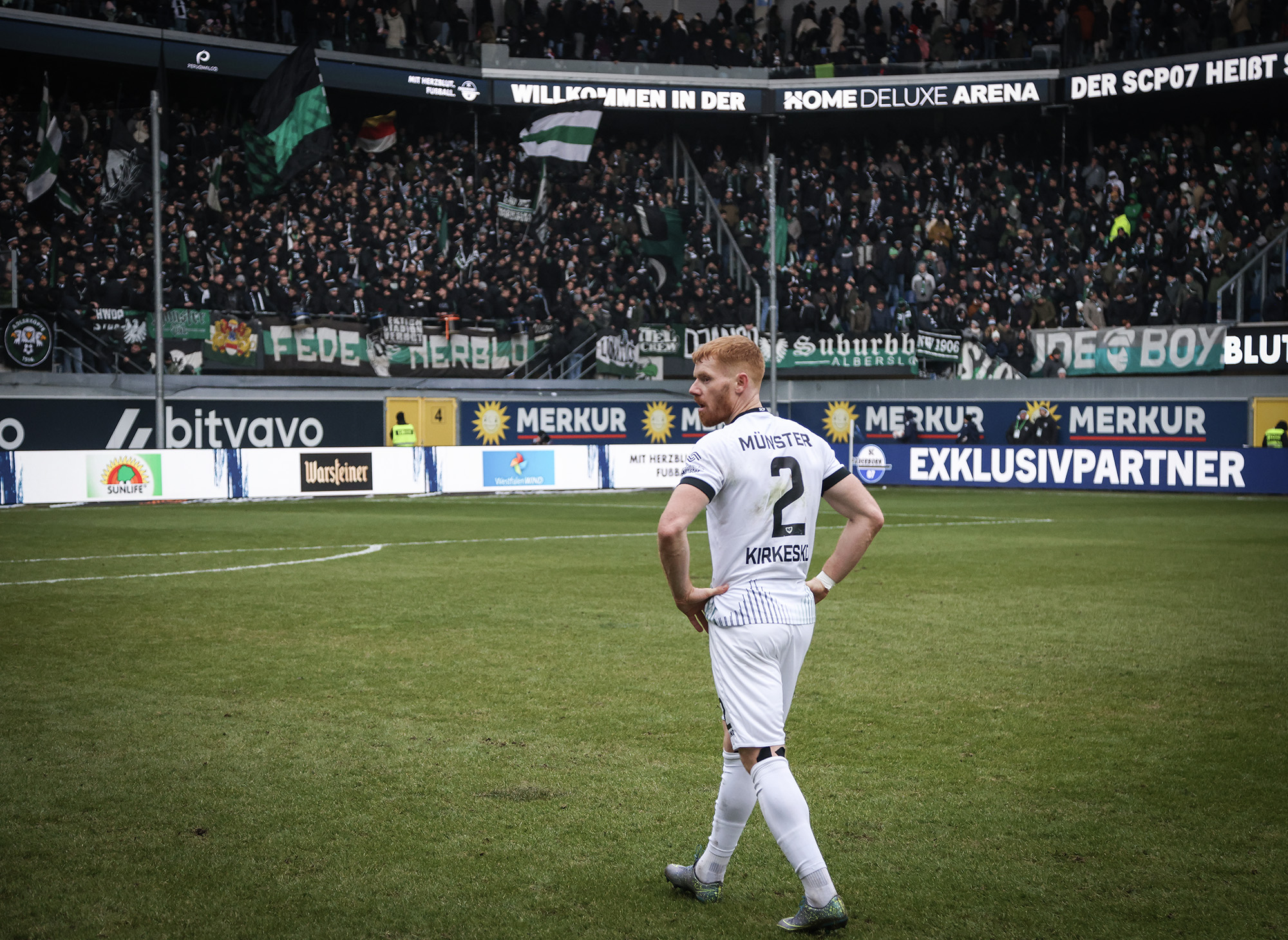 Eine halbe Stunde war gespielt, ehe der nächste Rückschlag weggesteckt werden musste: Bouchama setzte gegen Obermeier zur Grätsche an, kam aber zu spät. Da Bouchama das Bein ohne Chance auf den Ball noch hochzog, wertete Schiedsrichter Timo Gerach die Situation als Unsportlichkeit und zückte die Rote Karte. Kurz drauf wechselte der SCP taktisch und brachte Meyerhöfer für Batista Meier. Der Matchplan der Münsteraner war damit ausgehebelt und die Ostwestfalen drückten auf den Ausgleich. Der SC Paderborn versucht immer wieder mit schönen Doppelpässen durchzudringen, unsere Jungs hielten allerdings gut dagegen, nahmen die Laufwege des Gegners auf und verteidigten leidenschaftlich. In der Nachspielzeit der ersten Halbzeit ertönte dann die Paderborner Torhymne, als Castaneda den Ball im Preußen-Tor unterbrachte. Der Jubel verstummte aber, weil Mitspieler Bilbija zwar nicht an den Ball kam, aus Abseitsposition aber entscheidend störte. Folgerichtig zählte der Treffer nicht – Glück für den Sportclub.