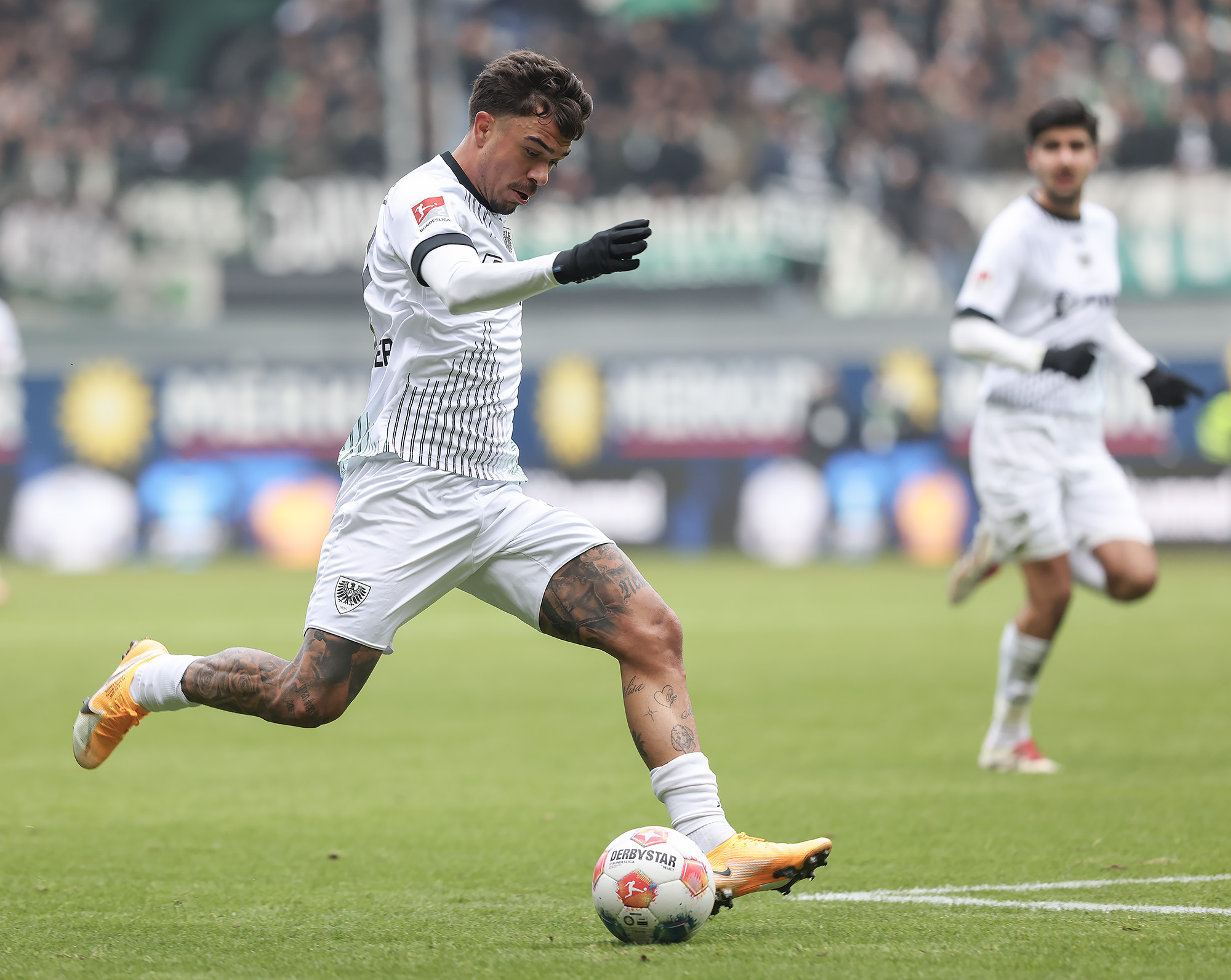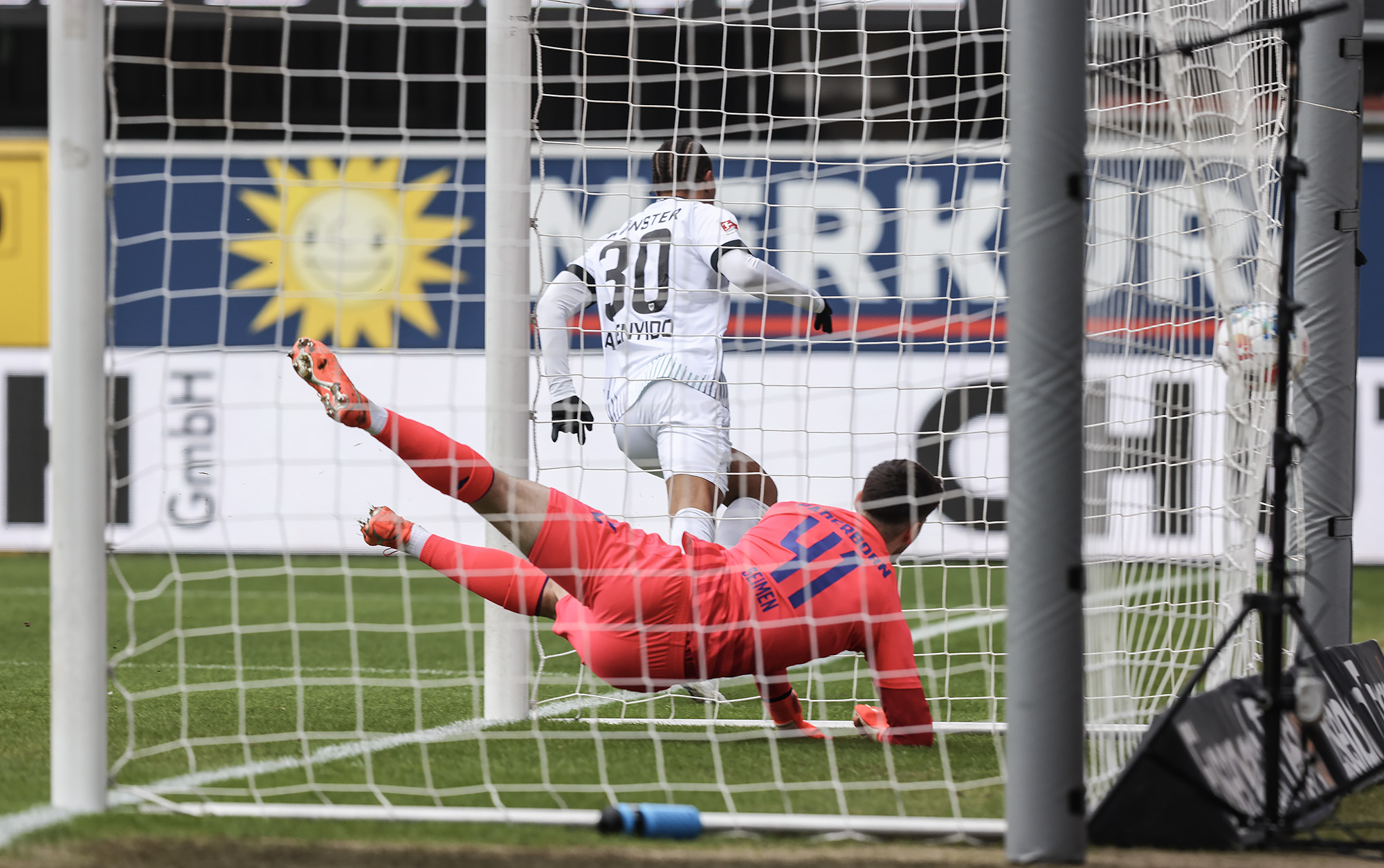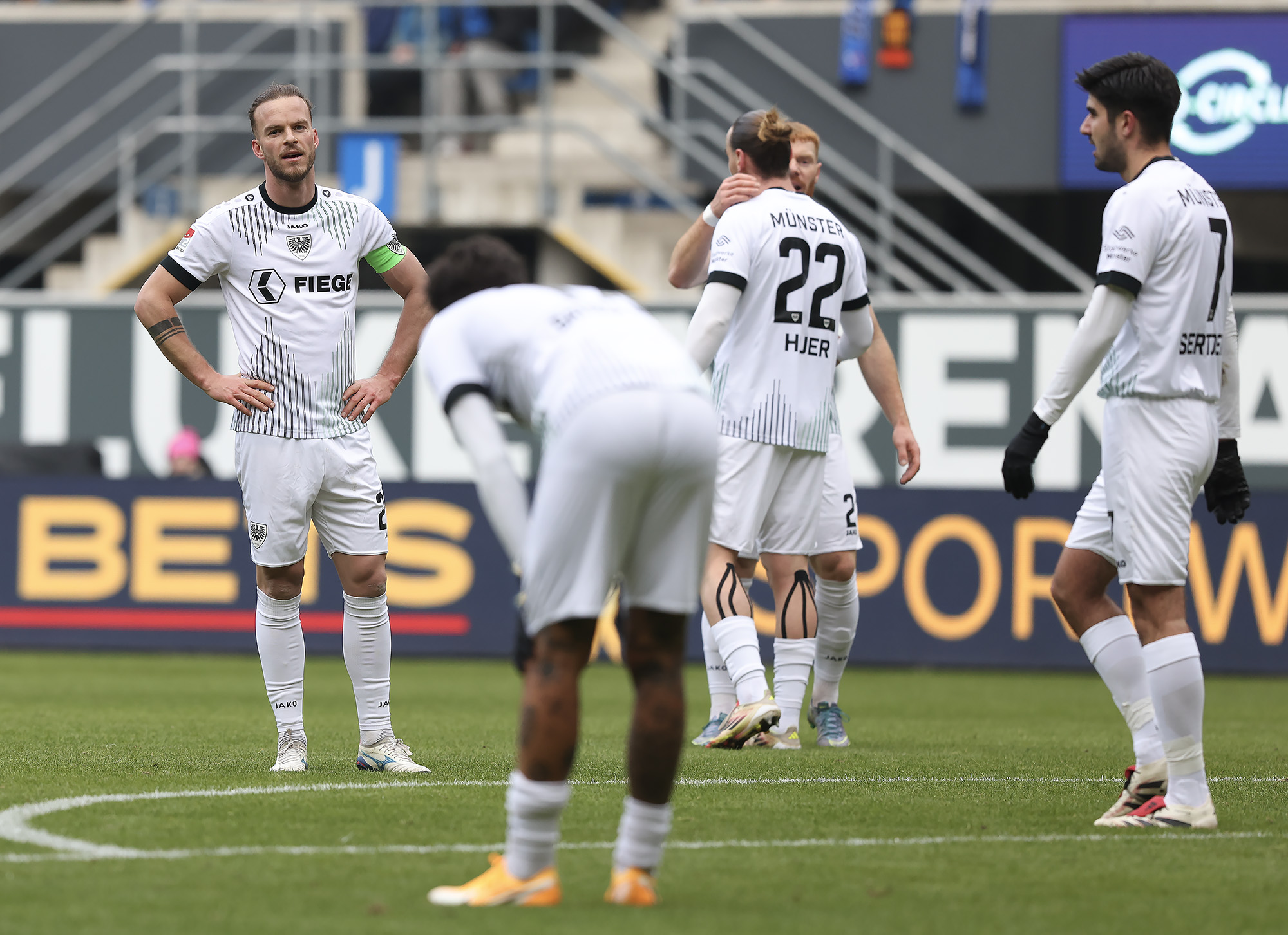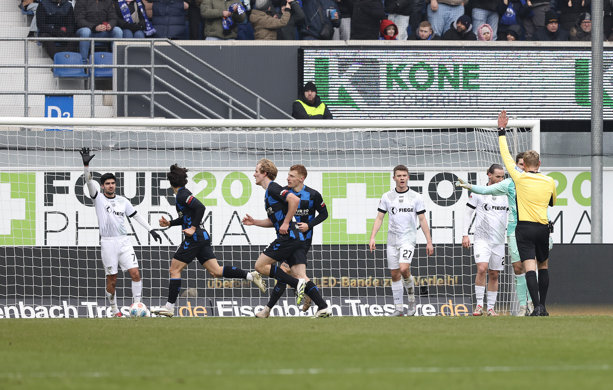 „34 Prozent Ballbesitz – so wenig hatten wir noch nie“, schaute Trainer Alex Ende auf eine ungewöhnliche Statistik der 90 Minuten plus Nachspielzeit. Hinter dem Negativwert der Saison steht natürlich ein Spielverlauf, der nach der Herausstellung von Yassine Bouchama aus dem Gleichgewicht geraten war. Nach Traumstart und früher Führung durch Etienne Amenyido (2.) mussten die Adlerträger gegen ein Spitzenteam der 2. Bundesliga 60 Minuten in Unterzahl überstehen. Das gelang über weite Strecken gut, am Ende hielt das aufopferungsvoll kämpfende Team dem vor allem im zweiten Durchgang zunehmenden Druck aber nicht mehr Stand. Der beim Gegner zur zweiten Halbzeit eingewechselte Steffen Tigges drehte die Partie mit einem Doppelpack zum 2:1-Endstand.