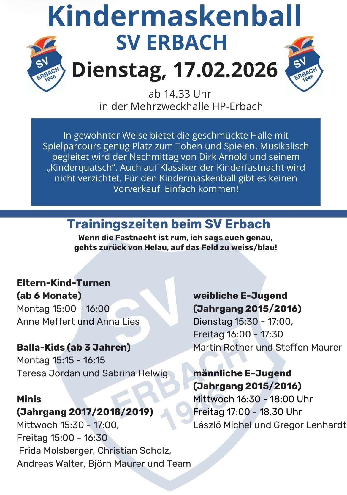 Am Dienstag den 17.02. ab 14:33, findet der alljährliche Kindermaskenball in der Erbacher Mehrzweckhalle statt!
