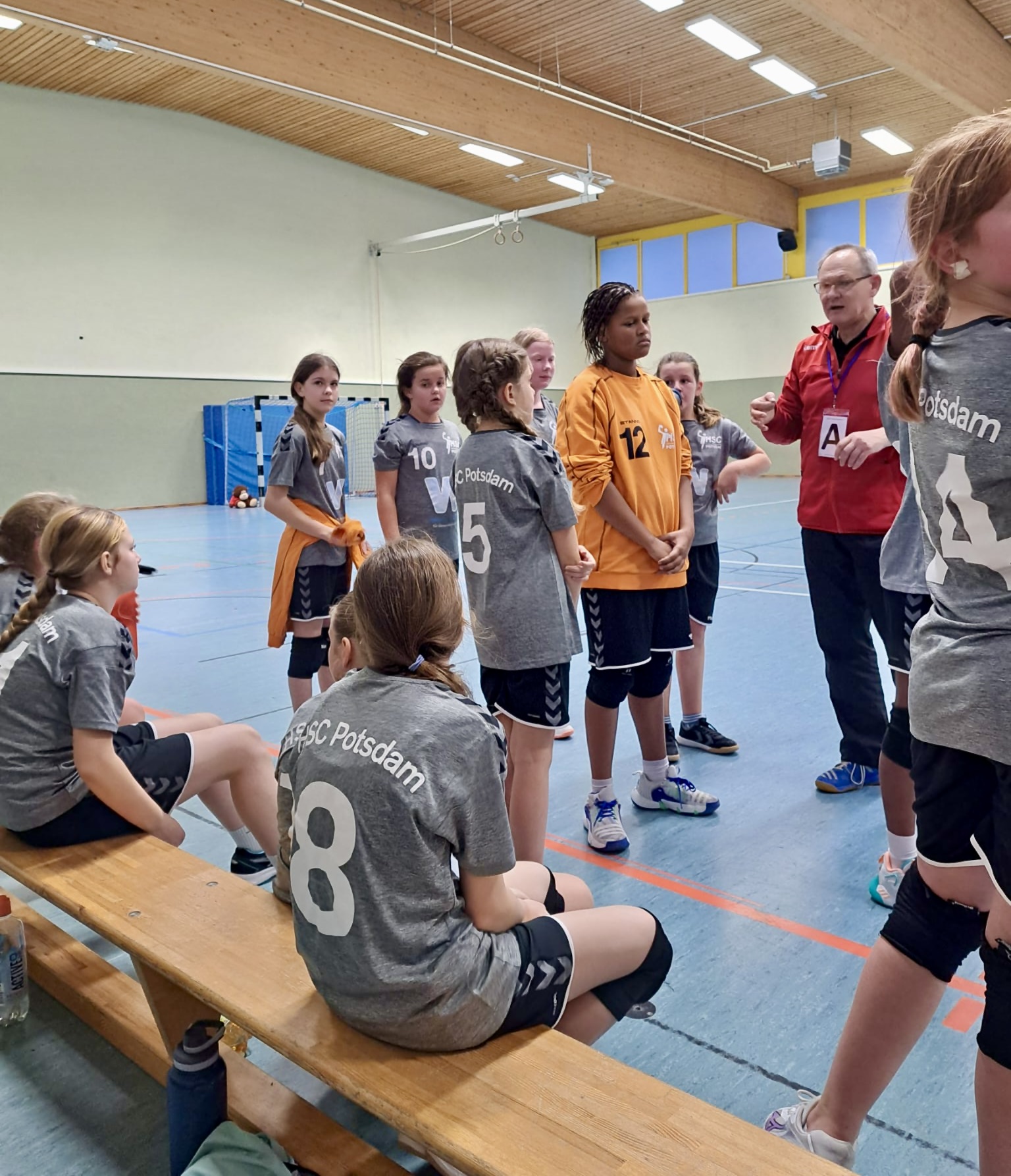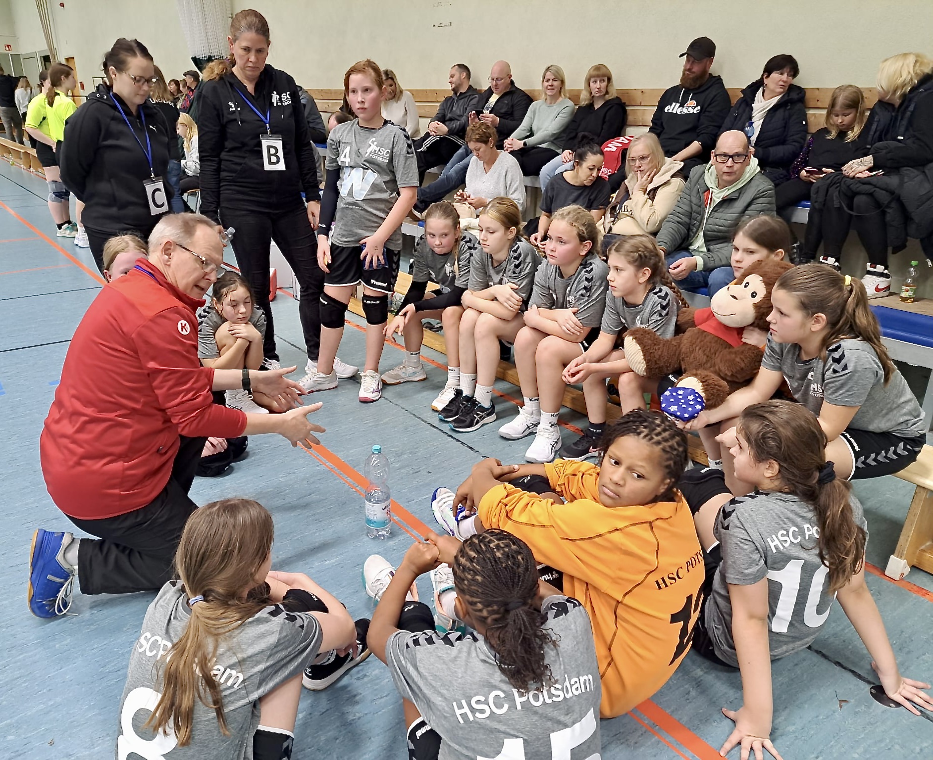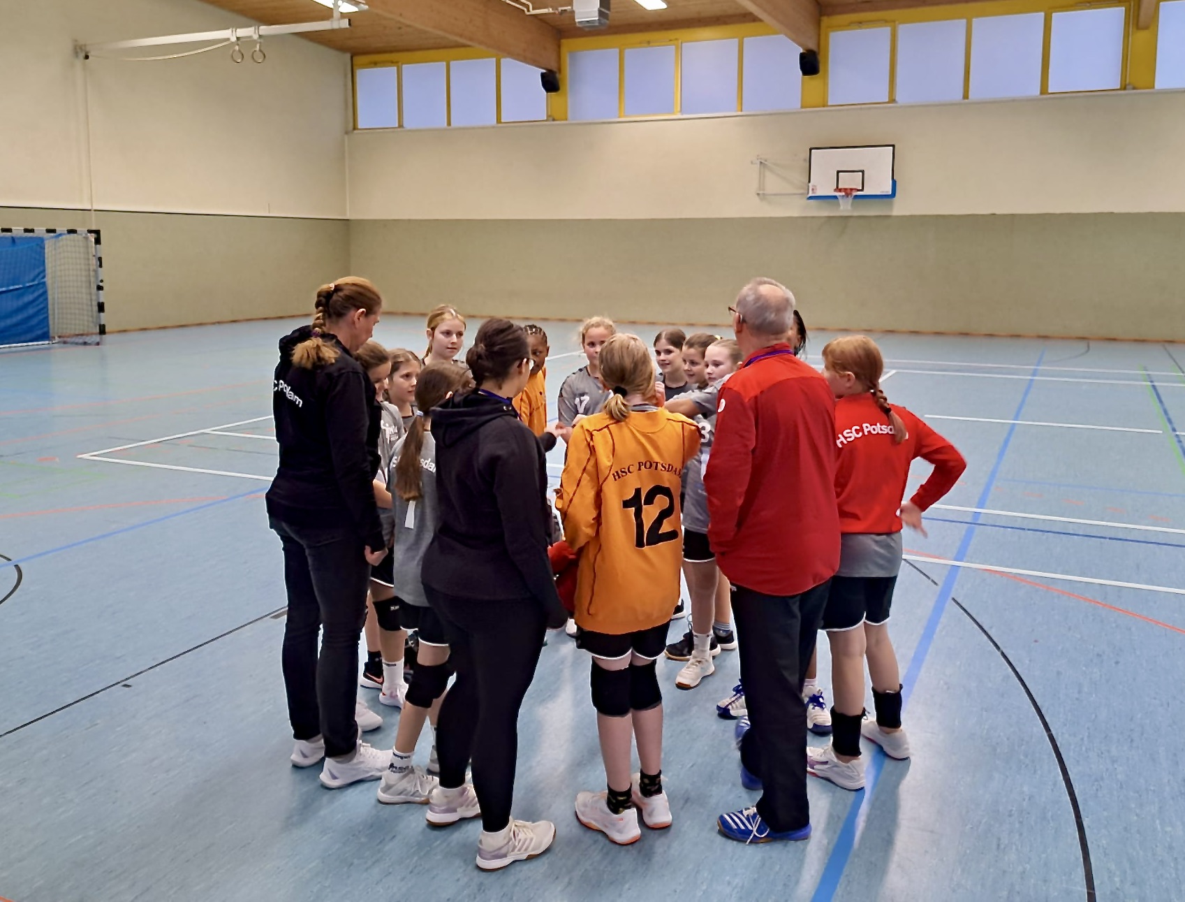 Gleich im ersten Spiel begann ein Kräftemessen gegen die Mädchen vom VfL Potsdam. Unsere Mädchen starteten mit zwei Tore in Folge optimistisch in das Spiel. Leider konnten wir diesen Start nicht in die weitere Begegnung mitnehmen. Ein um das andere Mal belohnten wir unsere guten Angriffsaktionen nicht mit Torerfolgen. Der VfL Potsdam kam auf, glich aus und ging zur Halbzeit mit 5:2 in Führung. Noch war alles offen. In 2.Halbzeit war dann auf einmal so richtig der Wurm im Angriffsspiel des HSC drin. Der Ball wollte nicht ins Tor und eine halbherzig agierende Abwehr ermöglichte den Potsdamerinnen vom VfL Tor um Tor davonzuziehen und zum Schluss verdient mit 16:6 das Spiel zu gewinnen. An diesem Tag war das Team vom VfL Potsdam das Bessere.