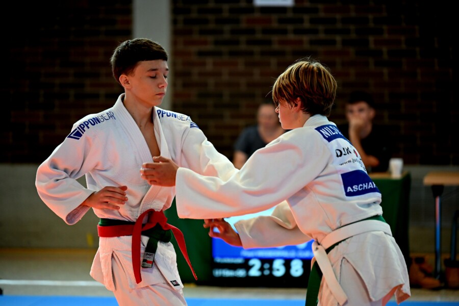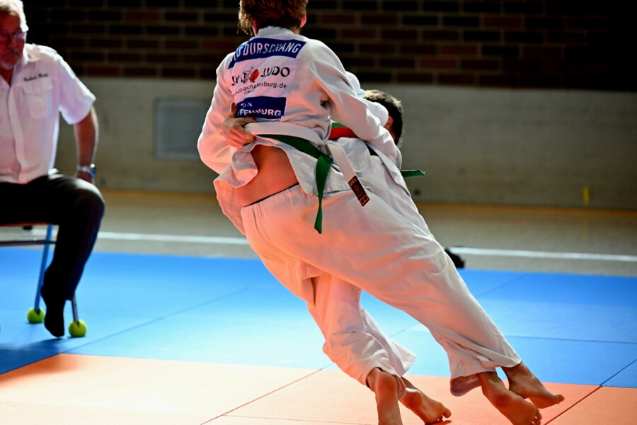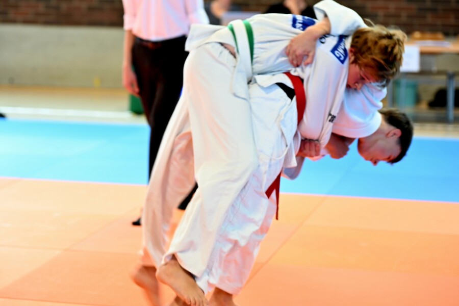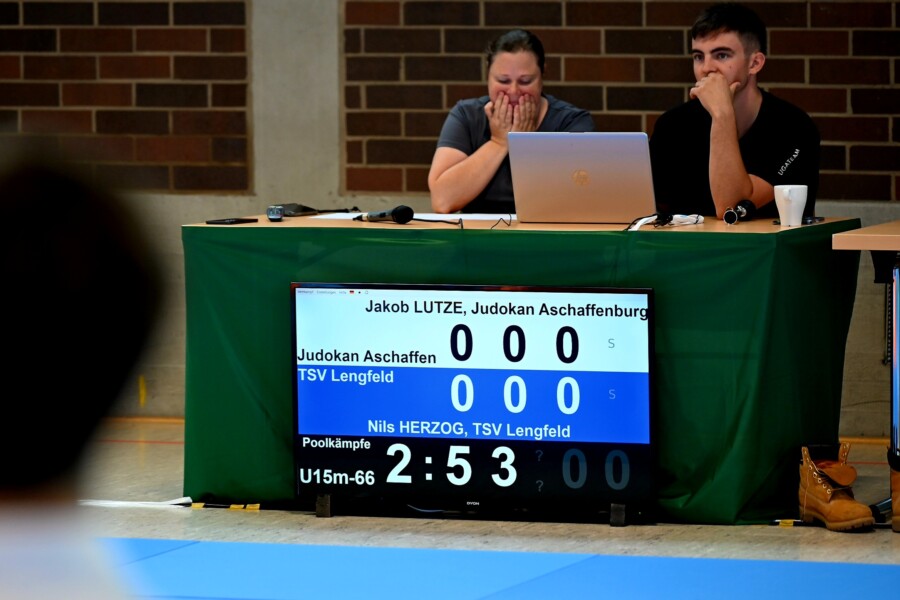 Ein besonders spannendes Finale lieferten sich Nils Durschang und Paul Weberpals (beide DJK Aschaffenburg) in der Gewichtsklasse bis 55 kg. Durschang ging zunächst mit zwei kleinen Wertungen durch Kontertechniken in Führung. Doch nach der Hälfte der Kampfzeit gelang Weberpals ein kraftvoller links eingedrehter Hüftwurf, der ihm eine halbe Wertung einbrachte. Den anschließenden Haltegriff konnte Durschang nicht mehr lösen – Sieg für Paul Weberpals.