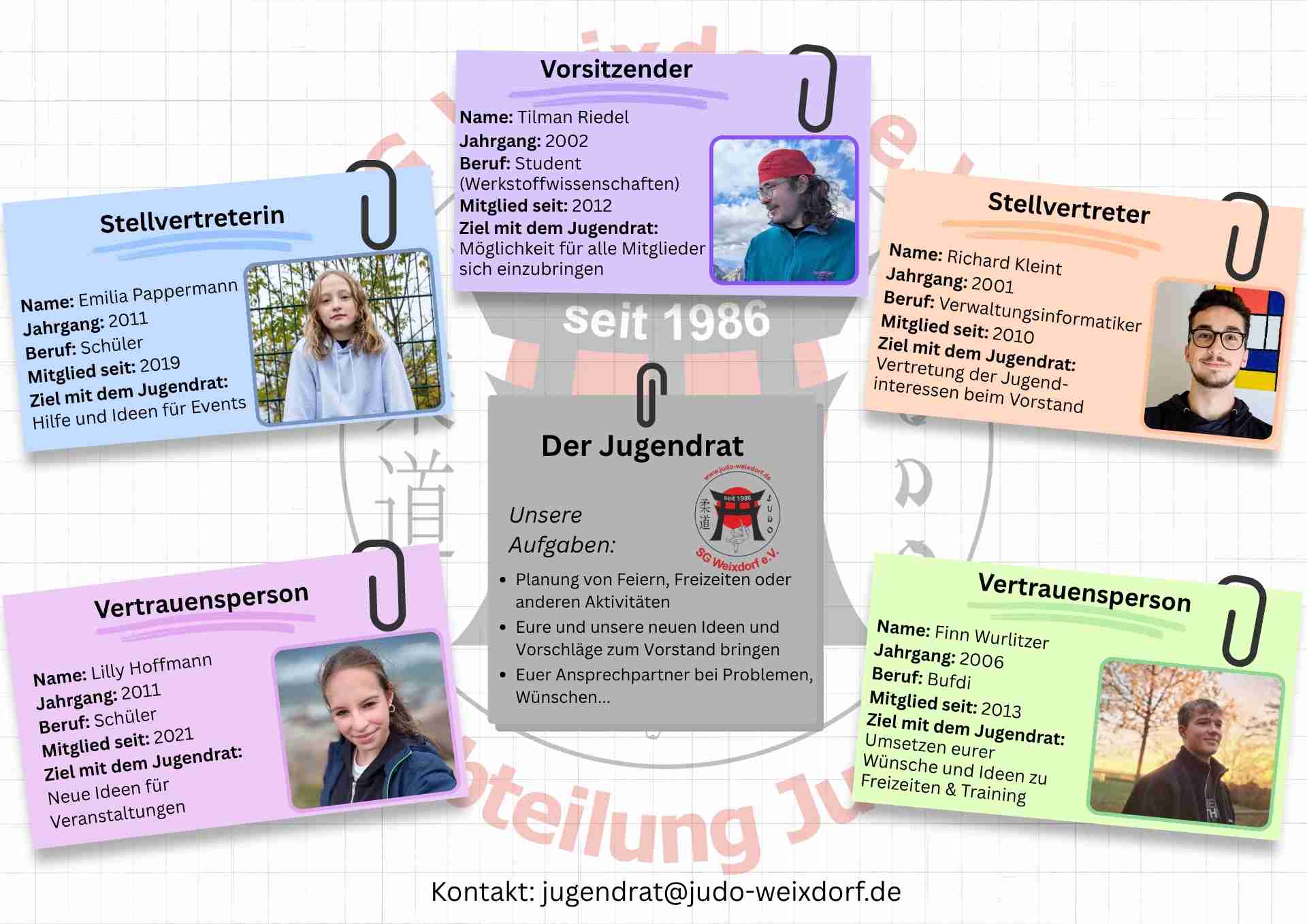 Ihr könnt uns über den Klubraum anschreiben, eine E-Mail an jugendrat@judo-weixdorf.de senden oder uns einfach persönlich ansprechen.