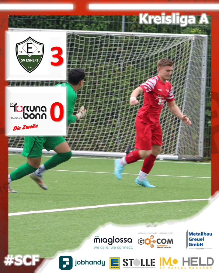 Auch dieses Mal folgte auf eine Heimgala wieder eine enttäuschende Leistung bei einem Auswärtsspiel. In Ennert konnte man nicht an die tolle Leistung vom vergangenen Wochenende anknüpfen. Obwohl die Personalsituation in Ennert so gut wie schon lange nicht mehr war, verlor man mit 3:0. Damit muss man im Kampf um die vordersten Tabellenplätze wieder abreißen lassen.