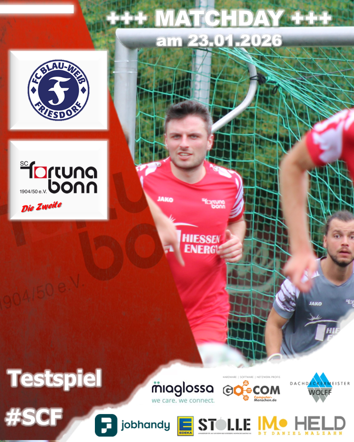 Am kommenden Sonntag steht die nächste Testspielphase für unsere Herrenmannschaften an. Alle drei Teams sind auswärts unterwegs. Bereits heute Abend spielt unsere Zweite im Derby gegen den ambitionierten Bezirksligisten FC BW Friesdorf. Am Sonntag tritt unsere Erste Mannschaft dann gegen den derzeitigen Tabellenzweiten der Bezirksliga, gegen den SV RW Merl an. Unsere Dritte testet ebenfalls am Sonntag, eine Woche vor dem ersten Rückrundenspiel, die Form gegen den Tabellenzweiten der Kreisliga B1, gegen die Zweitvertretung des FV Bonn-Endenich.