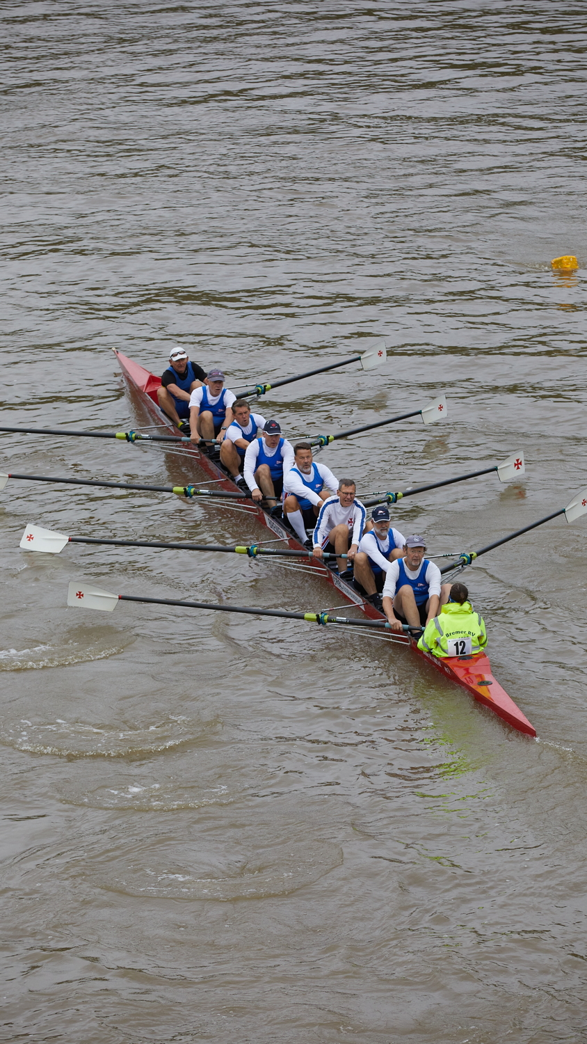 Samstag Mittag war der Moment der Wahrheit gekommen. Der F8+ hatte sich vorgenommen, die gute Zeit von 16:02 vom vorletzten Jahr zu unterbieten. Das sollte mit durchgängiger Schlagzahl 30 Realität werden. Die Schlagzahl haben wir zum eigenen Erstaunen gut gepackt. Aber es fehlte hier und da der Druck. Es wurde nur 16:20. Die Abteilung war für ihr Alter sehr schnell. Der Sieger schon nach 14:53 im Ziel. Ohne dass wir abgehängt wurden, aber es war der 5. und damit letzte Platz. Und dennoch ein erhebendes Rennen.