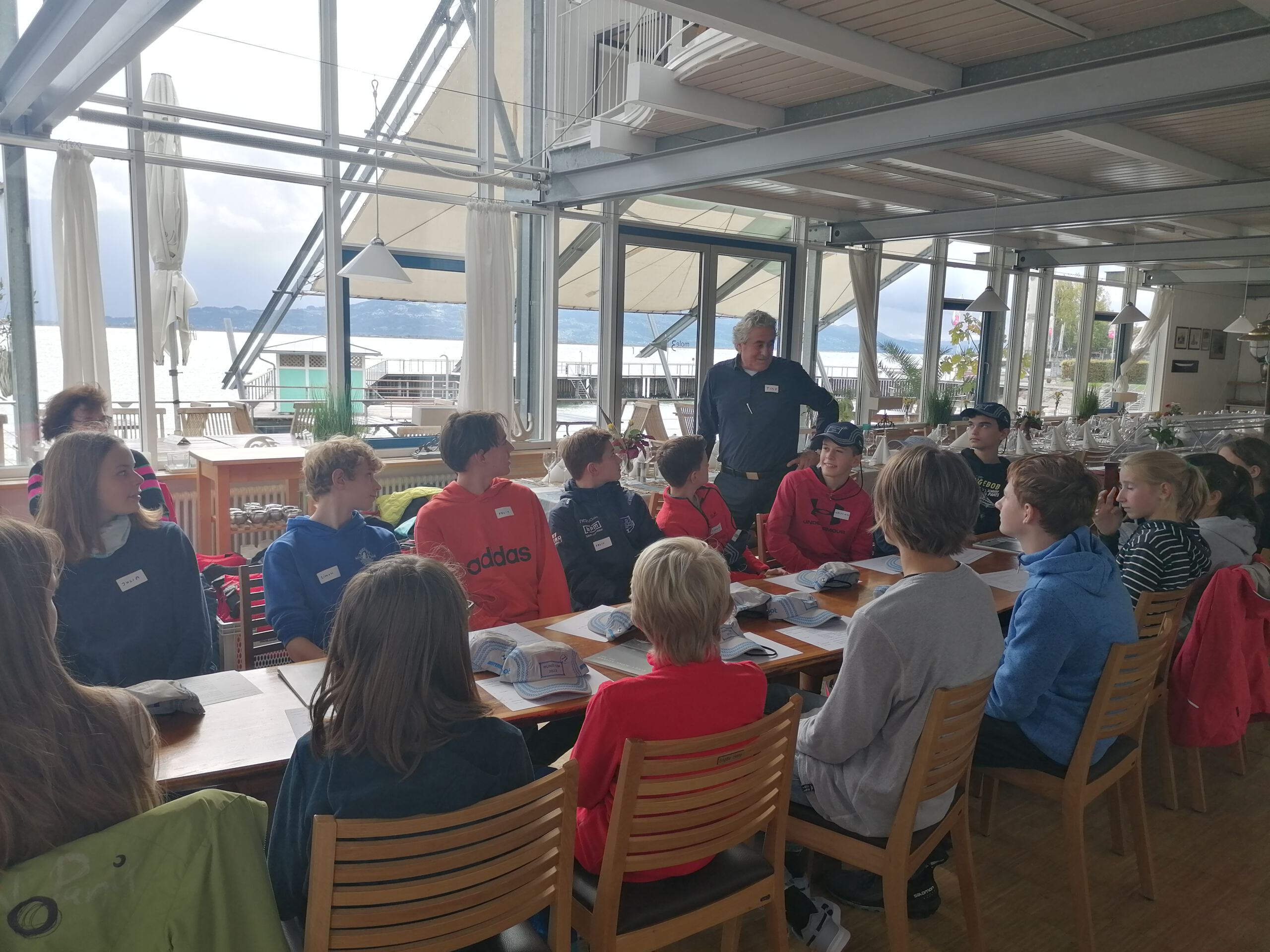 Zum heutigen Kursbeginn, an dem neben dem LSC- Präsidenten Achim Holz auch BoGy- Rektorin Jutta Merwald teilnahm, war bei Sturmwarnung und Windstärke 6-7 kein Segelwetter für Anfänger. Dennoch wurden, nach einer kurzen Einführung in die Grundlagen, an Bord der vier Ausbildungsboote im Hafen alle Segelmanöver durchgespielt und sogar Segel gesetzt. Den Abschluss des ersten Kurstages bildete ein Besuch an Bord des Einsatzbootes Seewolf der Lindauer Wasserwacht, bei dem Einsatzleiter Mathias Müller den Jugendlichen die vielfältigen Aufgaben der Wasserretter erklärte. Die Vorfreude auf den ersten Segeltörn, bereits in der kommenden Woche, war gegen Ende allen jungen Seglerinnen und Seglern ins Gesicht geschrieben.