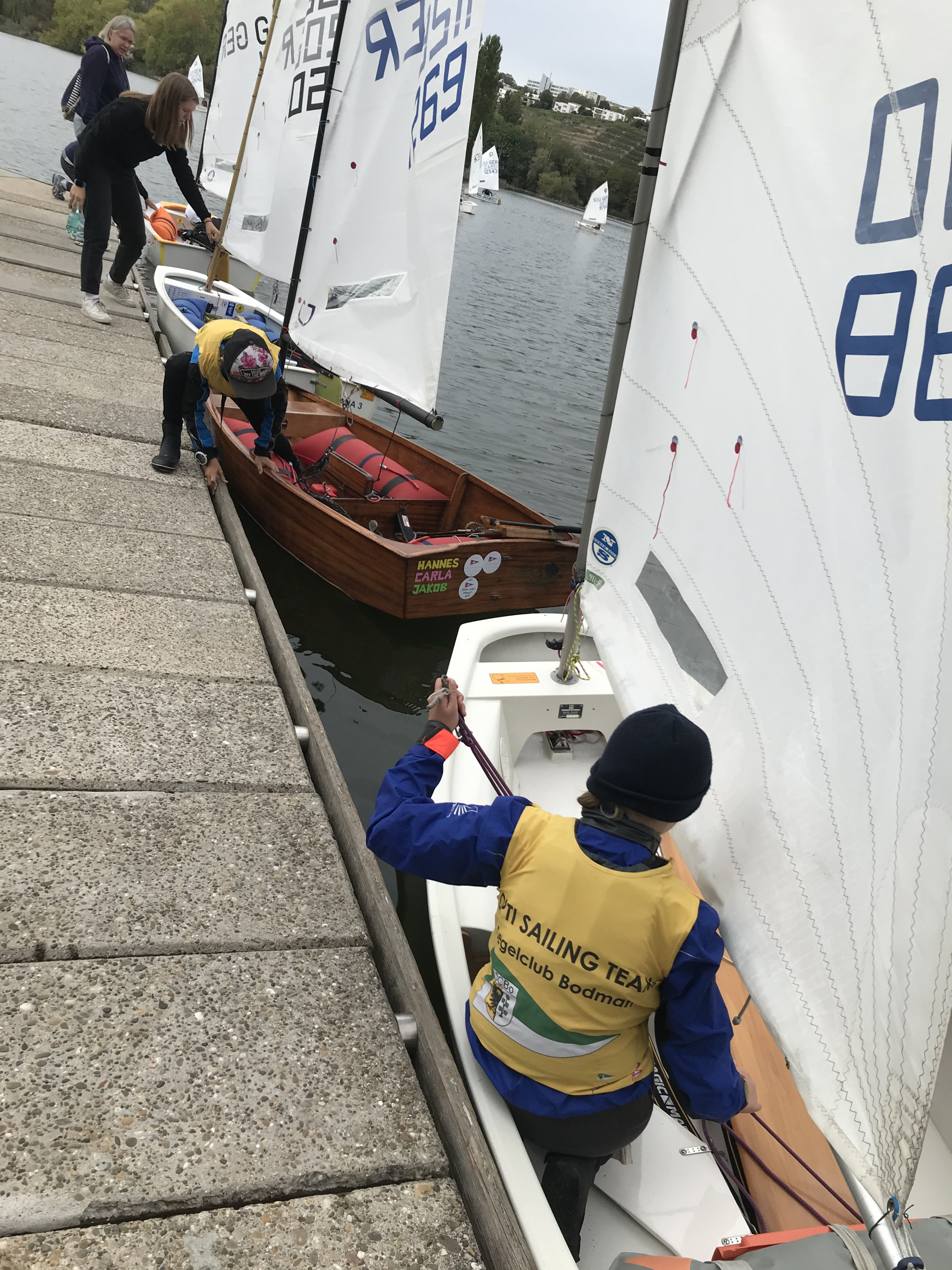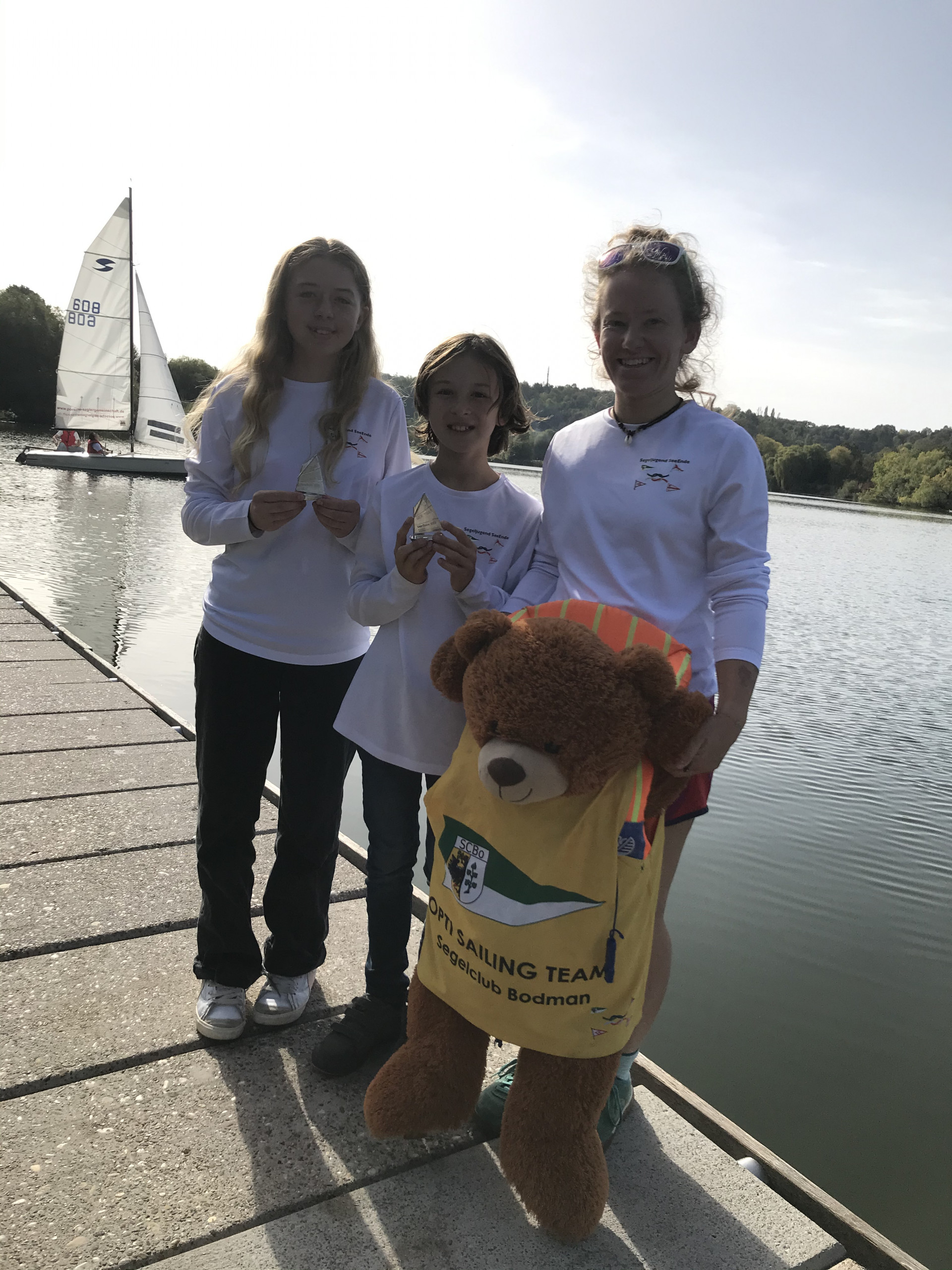 Schon der Name dieser Regatta deutet darauf hin, dass dieses Wochenende teuflisch werden kann. Und so war es auch in diesem Jahr: Der Wind blies kräftig und alle fragten sich, ob Opti B überhaupt aufs Wasser gelassen würde oder ob nur die Landesmeisterschaft von Opti A segeln würde. Aus unserem Team fuhren Lilly, Simon und Ruben in Opti A und Jakob, Cosima und Carolina in Opti B. Dann wurde klar, dass alle aufs Wasser gehen würden. Das Windteufele wütete schon im Hafen. Nur mithilfe von Christa, die im Badeanzug bei eiskalten Temperaturen bis zum Bauchnabel im Wasser stand, konnten wir die Boote starten. Die Wellen waren riesig! Bei Cosima schmiss das Windteufele so viel Wasser in das Boot, dass sie mit dem Ausschöpfen gar nicht hinterher kam und sie bei der ersten Wettfahrt nicht mehr starten konnte. Carolina und Jakob schmiss es aus Wut über den guten Start von Bord. Die Kinder ließen sich vom Windteufele jedoch keine Angst einjagen. Deshalb versuchte es mit Hagel, Regen und Gewitter die Kinder vom See zu vertreiben. In der dritten Wettfahrt schaffte es das endlich. Große schwarze Wolken kamen bedrohlich näher und die ersten Blitze schossen vom Himmel. Alle Kinder, die noch nicht aufgegeben hatten, wurden in den Hafen geschickt. Die Kinder, Eltern und Helfer wurden nass bis auf die Knochen. Unsere Mannschaft ließ sich nicht beirren. Am Sonntag waren alle früh wieder am Start. Cosima kam nur mit Hilfe von Bruno aus dem Hafen. Glücklicherweise ging dem Wind- Teufele langsam die Puste aus, und wir konnten ohne weitere Zwischenfälle die nächsten vier Wettfahrten segeln. Unsere tollen Trainer gratulierten uns zu unseren Erfolgen und besonders zu unserem Durchhaltevermögen.