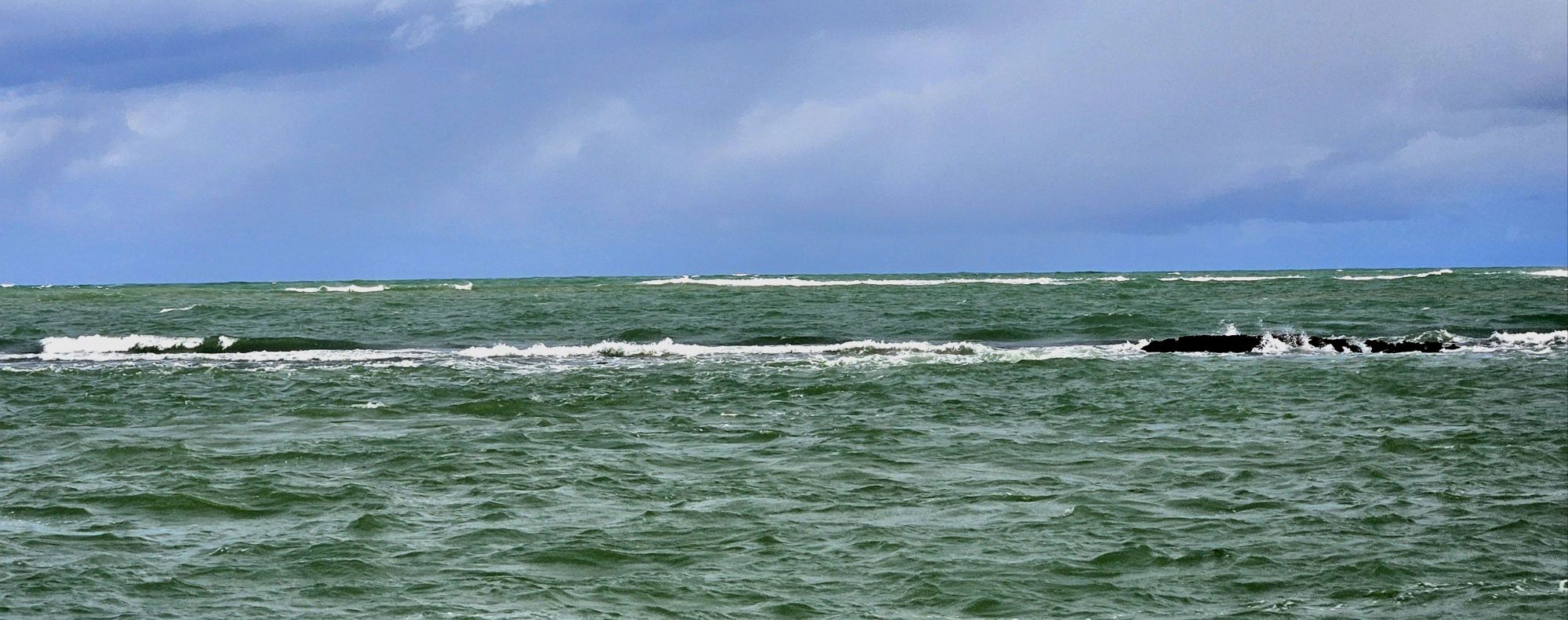 Bei Flut um 06:00 holten wir den Anker hoch und sobald das offene Meer sichtbar wurde, zeigte sich eine weisse Wand. Windstill aber mit 4m Düngung aus SE sind Wellen beim der Riffeinfahrt gebrochen. Was für eine Höllenfahrt durch diese Brecher.