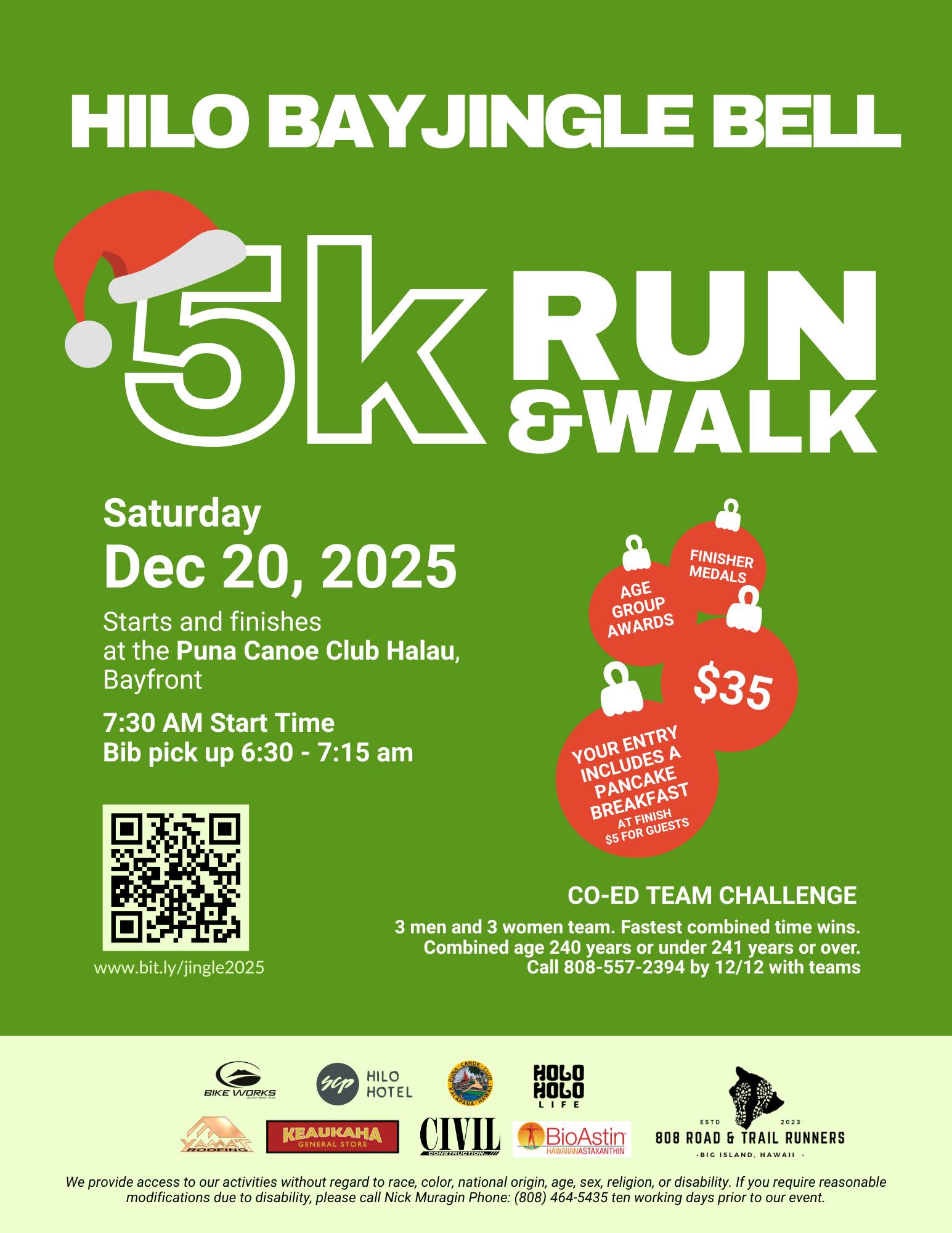 Please come join us at the Hilo Bay Jingle Bell 5k Run or Walk on Saturday December 20th 2025! Starts and finishes at the Puna Canoe Club Halau at Bayfront, Hilo, with pancake breakfast included in registration. Sign up at https://sites.chronotrack.com/event/88478