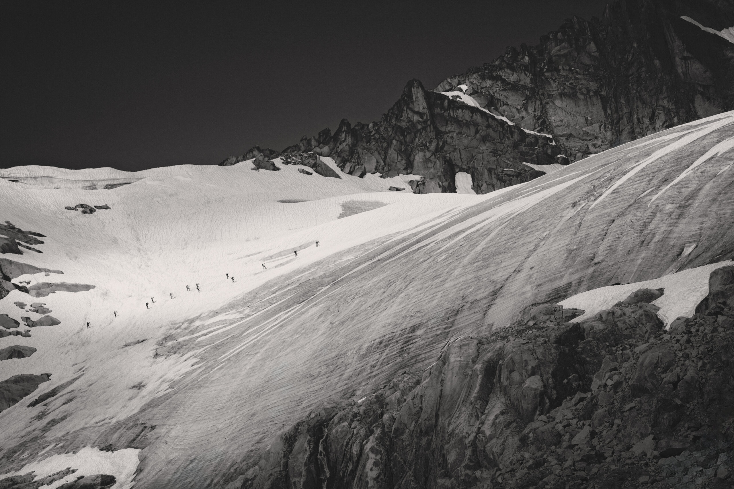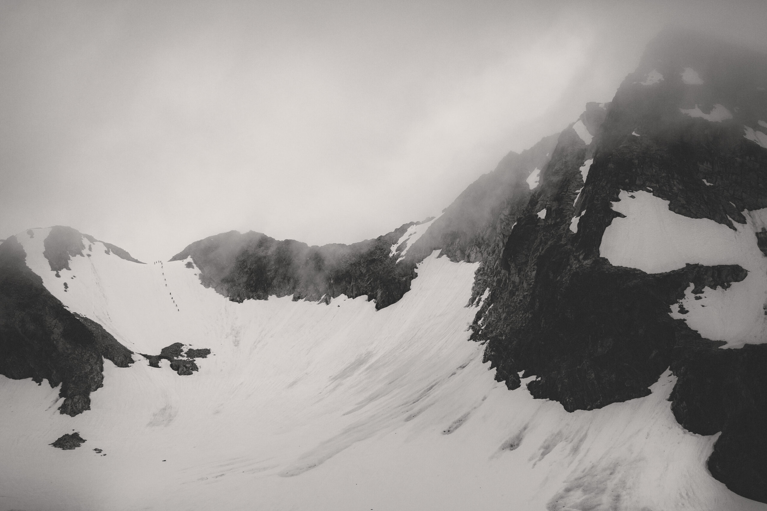Not only does this panorama showcase the physical landscape in perfect definition; it also serves up a healthy amount of drama. The eye is drawn immediately to Hatteras – centre stage – and you can feel its commanding presence. The light and shadow is perfectly balanced, and the monochrome treatment enhances the composition, textures and structure. It pays respect to and adequately represents these powerful and timeless mountains. Congrats, Steve!