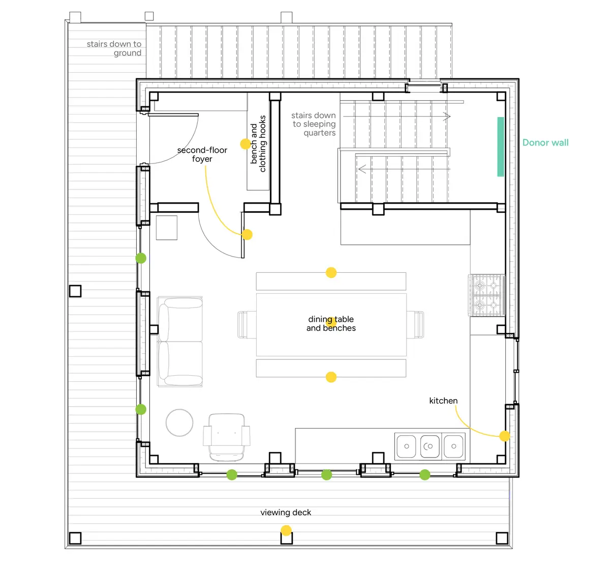 The yellow dots highlight the naming opportunities on offer and their suggested plaque location. The locations of the plaques are open to discussion. The “Donor wall” is where all major donors will be named on a plaque.