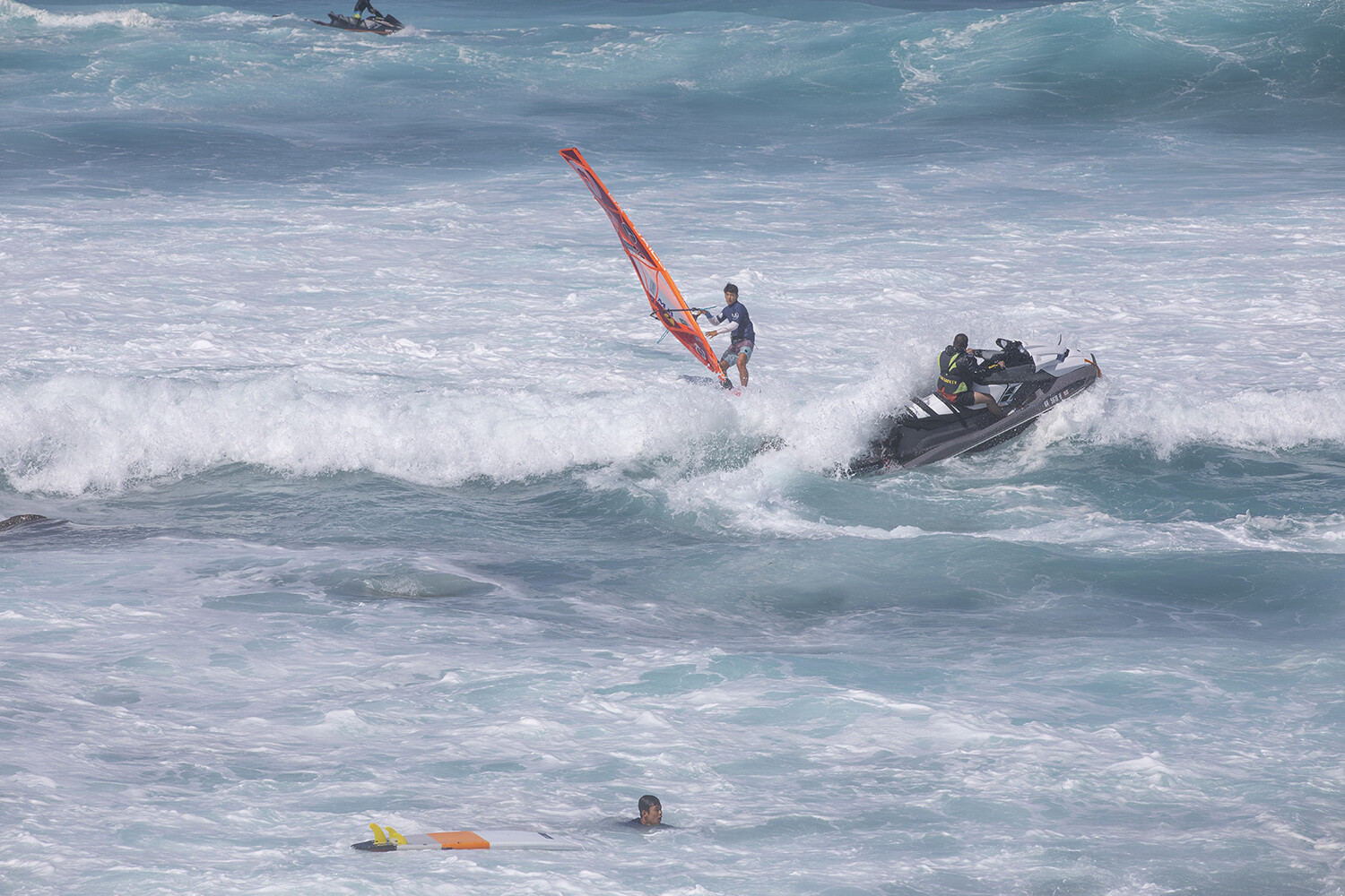 The real heroes of the event were the water safety—Jay Sniffen and Marc Pokini. The judges wanted to limit the rescues in each heat to avoid any unfair advantages. But the waves were so big and powerful that the rescue team refused to step down. Sniffen and Pokini pulled into the rocks to save riders and their gear in a display of sportsmanship and courage rivalling anything that we were doing on the waves.