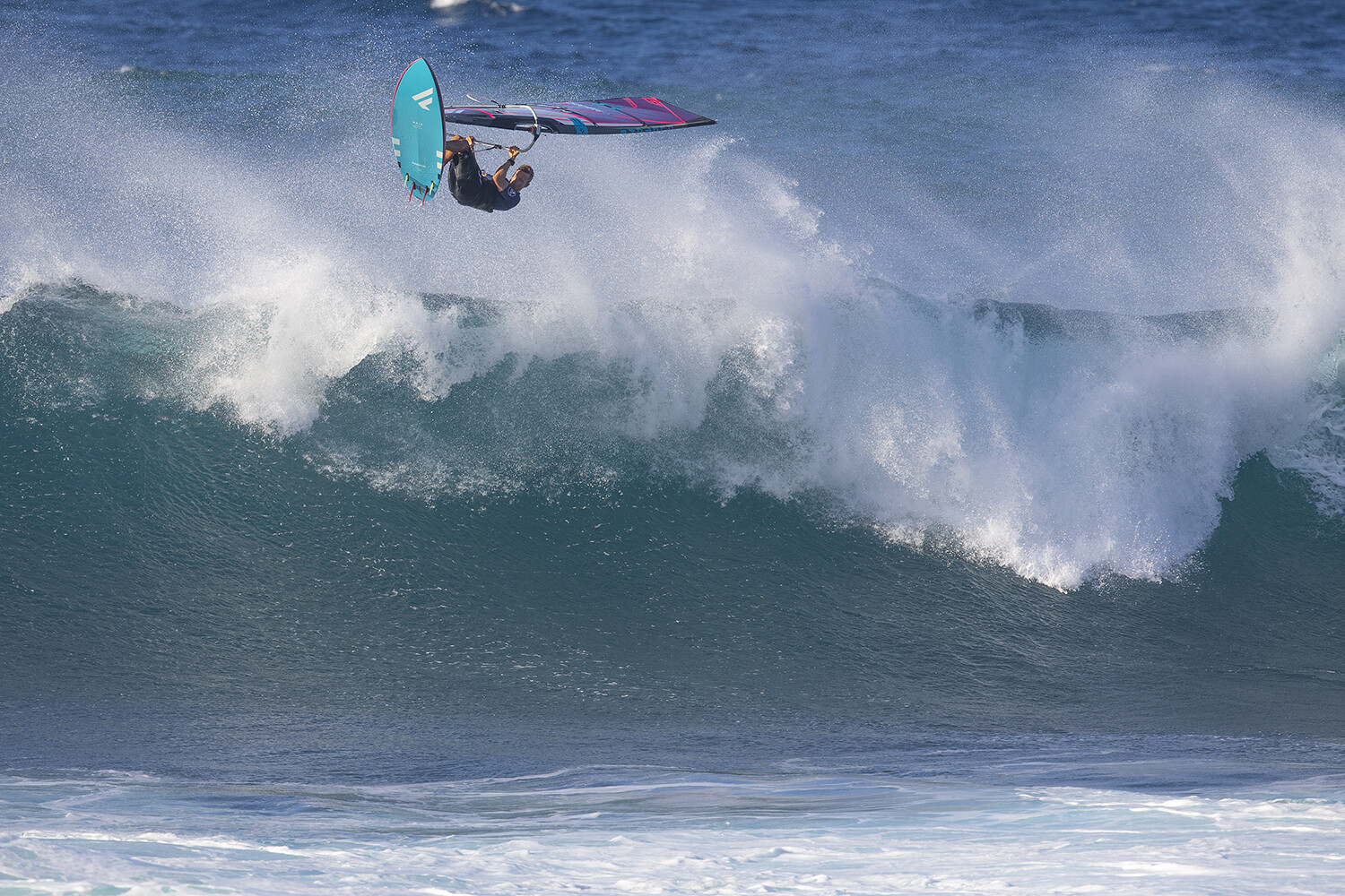 My 4.7 is a Neil Pryde Combat and I used it with my 100% carbon masts, that’s just how my sail works best. The wave is so powerful, you’re mast is going to break anyway if you’re in the wrong spot. At Ho’okipa I used 30 inch harness lines, whereas in the Canaries I’ll use 32 inch. I have my boom lower than I would use for freestyle, at about chin height, but I have definitely not followed the trend yet of the mega low boom. I feel so underpowered with my boom that low and am not comfortable on the board.