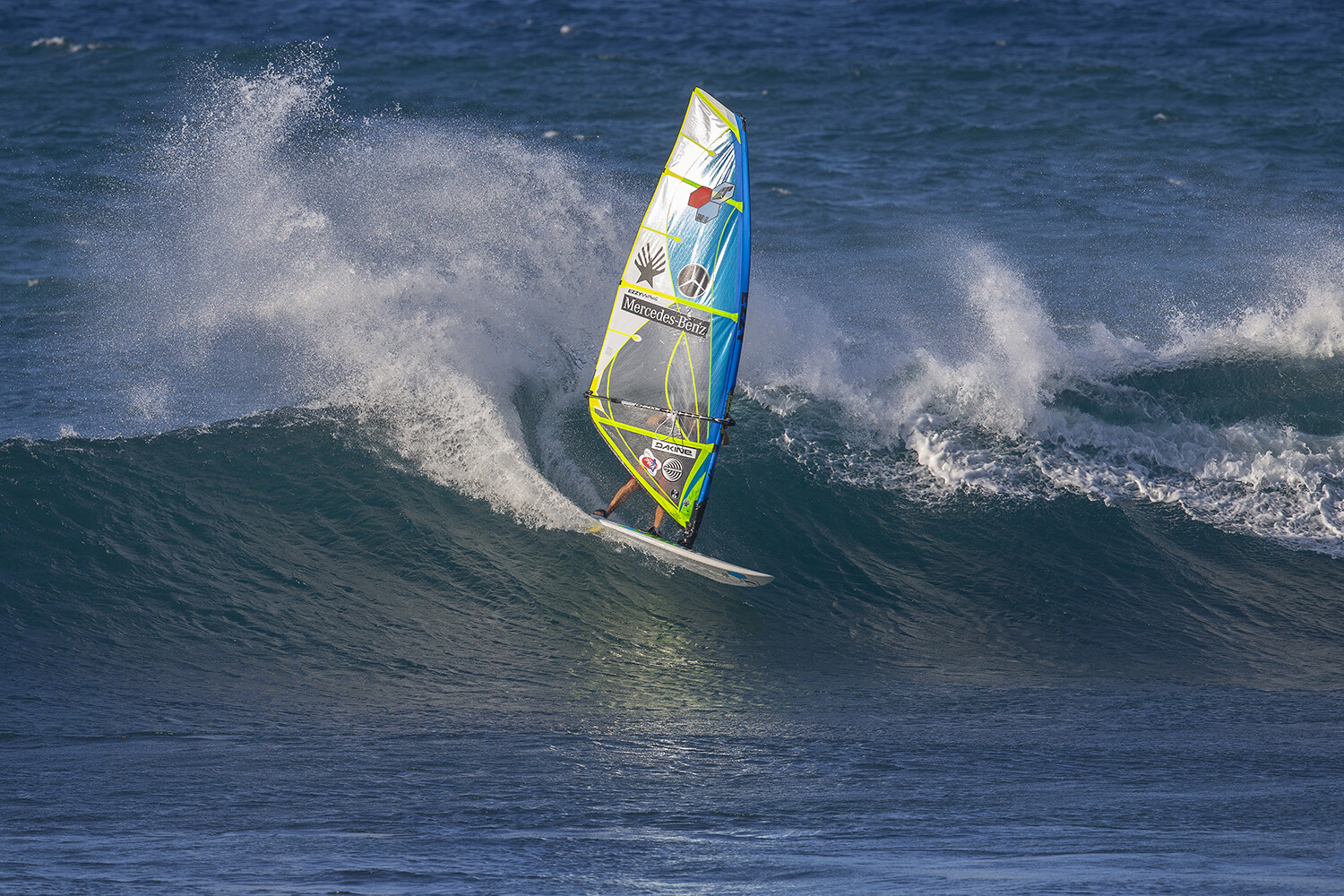 On a big Ho’okipa day like this with light wind and few sets it’s a lot about confidence, experience and staying calm. I only brought one board to Maui, the production Ultimate Wave 88, so I didn’t have to worry about board choices. I feel really confident on that board as I can sail it in super light winds, get planing early and at the same time it rides radical enough to do all the turns and tricks. I use that same board everywhere around Europe. In Ho’okipa however I equip it with different quad fins, which have more rake and provide better control. My sail choice was either 5.0 or 5.3 Combat in HD version to make sure the rig would last a heavy beating. These four batten sails bring powerful drive and smooth comfort at the same time, which is perfect for wave riding. I used both the super strong 90% and the slightly lighter 100% percent carbon masts and both worked great. I have the boom at a standard medium height – neither high nor low – and my harness line length is 30”.