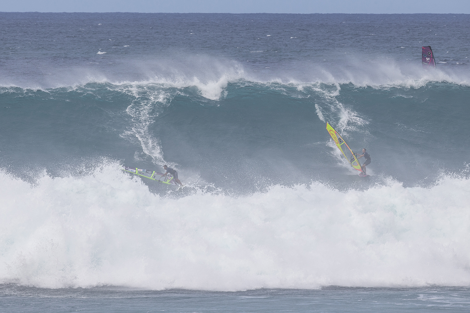 I was actually pretty happy when I saw it was big. It’s nerve racking, but I’ve sailed in these type of conditions a lot; living a few minutes away from Ho’okipa has it’s perks. When it’s big and has a lot of west swell the current turns into the lineup making a lot of the waves really bumpy, but at the same time the end bowl section can get really hollow compared to normal days. The west swell also closes out the channel a lot which makes timing your sail around the rocks critical. It’s really easy to mistime it and break everything, which we saw a lot of! If you do make it around the rocks, the current does make it really easy to get out and upwind though. Even if there is a huge closeout set you can kind of sit on the inside after the rocks and wait for it to pass. A lot of it comes down to local knowledge. When it’s big, it’s easy to see who has spent a lot of time out there and who has not. The person who wins in these conditions has the best wave selection and is hitting the most critical sections and Antoine definitely did that best!