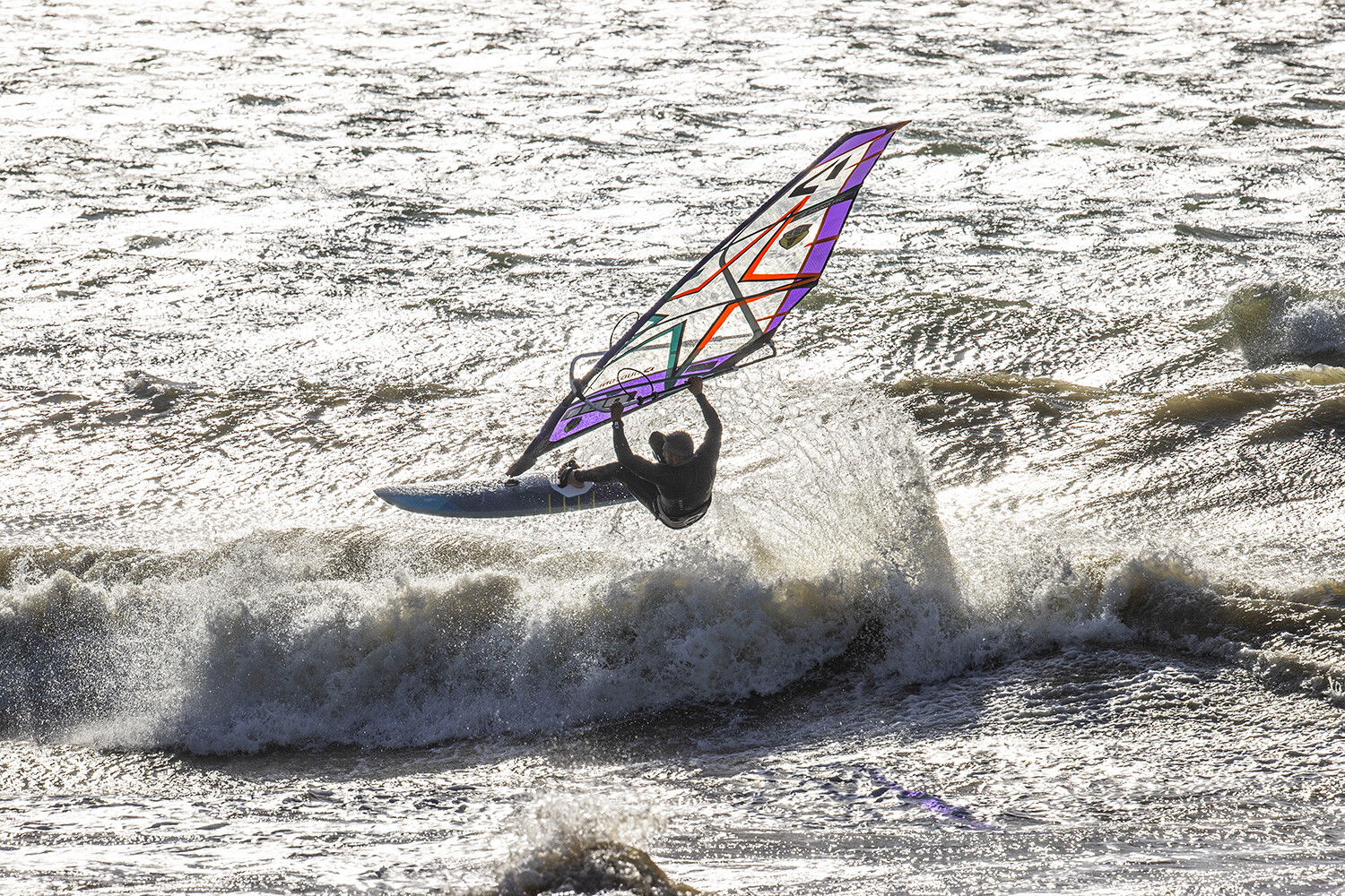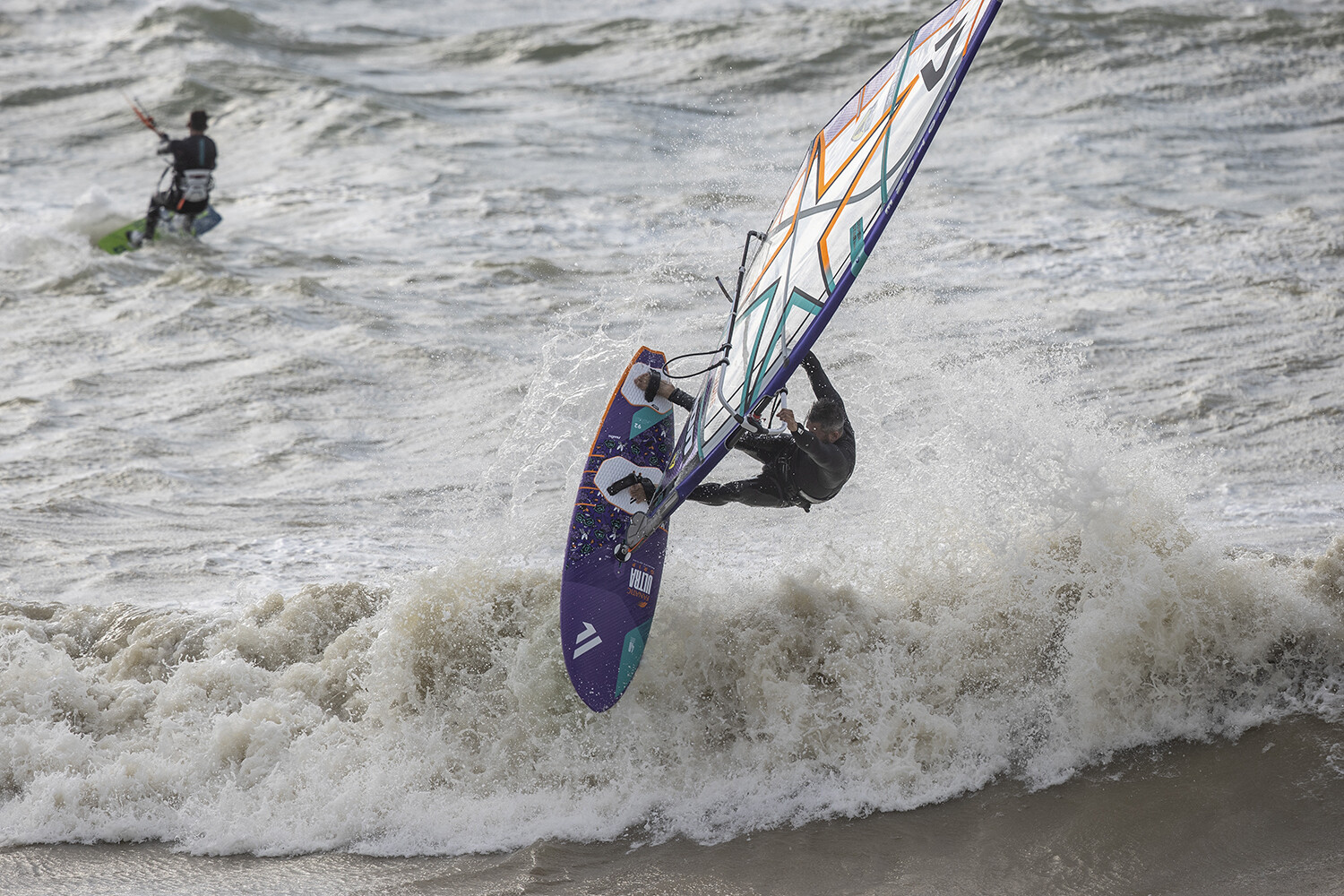 The reason I use the Mamba quite a lot here in Shoreham is that you can change direction easily and pivot off the tail and snap off the top. Sailing at Shoreham I like to snap off the back foot quite a lot. If I had better waves I would probably just sail the Grip, but in side–on and softer waves where I live, the Mamba comes into its own, with that pivot off the back foot style of sailing. It is halfway between our old Stubby and the Grip. The Stubby pivoted off the back foot incredibly well. It accelerated very quickly. The new Mamba is not quite as snappy off the back foot but it drives more through the turns. You can snap off the top but it will follow a line better than the Stubby. With the Stubby you would snap and stop. Then you would have to accelerate for the next turn. The Mamba will snap and keep on driving, not as much as the grip, but you get a bit of spray from the snap and it also drives into your next turn. That feels quite nice. For consumers, I think this will be an amazing board. You can bump and jump it, wave ride it and snap off the tail. The new boards are so much more responsive than that old Mosquito, they change direction and do what you expect them to do. When you get on a wave with the Mamba you can wait, wait, wait, and as you see the wave jacking up you can start your bottom turn. Then you can decide where you want to be. Go to the right, fade off before hitting the lip or whatever you wanted. On the old Mosquito there wasn’t any of that.