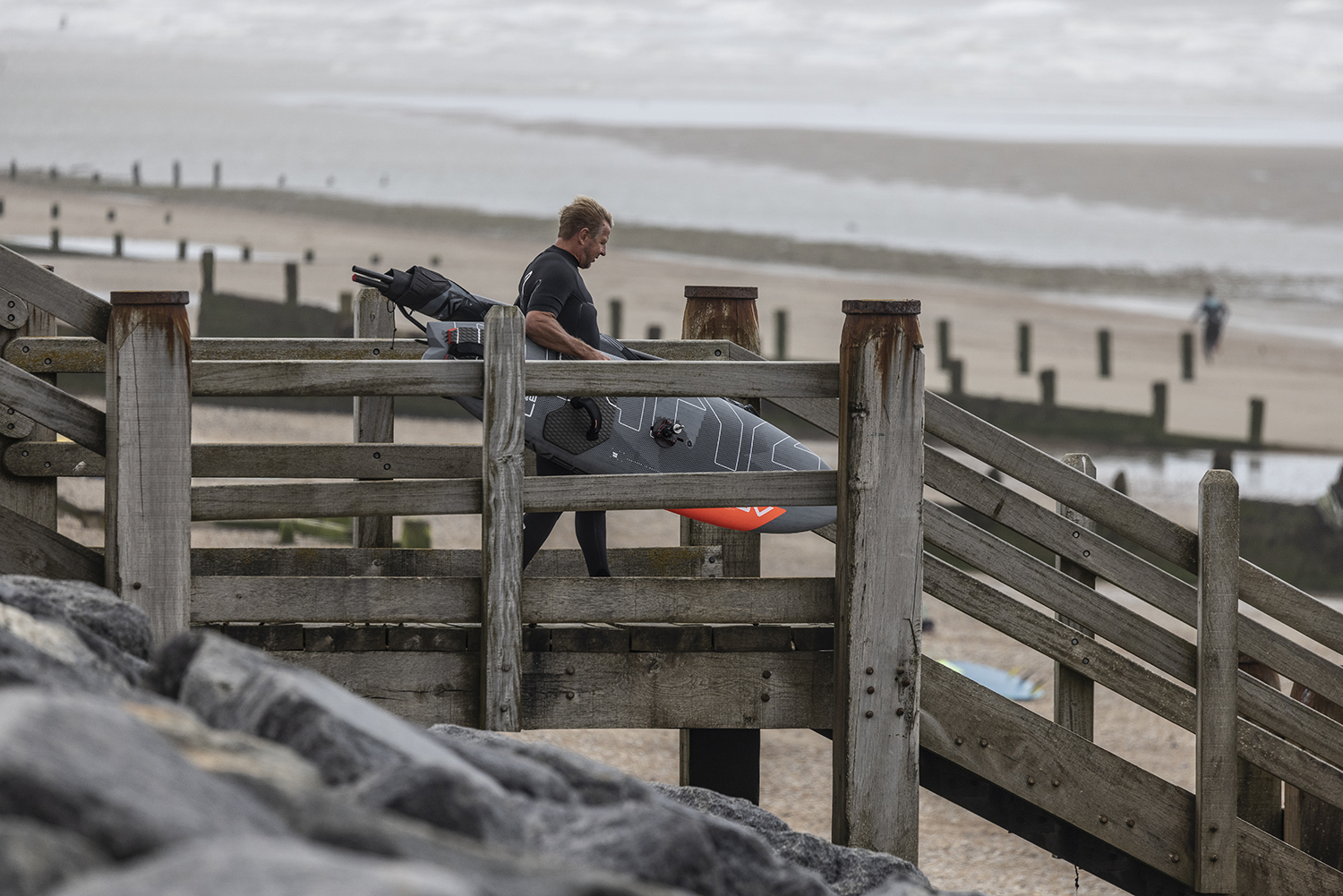 If I saw a forecast for Camber Sands for 20-25 knots from the southwest, with clear blue sky and small swell, that could easily be 4m or 4.2m conditions. At home it would most likely be 15 knots, with no waves and I would be lucky if I was even windsurf foiling. If I drive the three hours to Camber, I will be wave sailing fully stacked on small gear. It is a long drive though. I guess only people stupid enough like me would do it for a few hours session. From Brighton it is still quite a mission as the road is quite slow to Camber along the coast. But the wind will be so much stronger and there are normally waves, so that is what motivates me for the drive. From Poole, you are on the motorway for 90% of the drive, so that part is not too bad. It takes time but with cruise control I am there in three hours. I can leave home at 8 a.m., be there for 11, sail for three hours and be home for 5 p.m., work permitting! I am normally exhausted after sailing at Camber as on one run you could easily do five jumps on a really good day. I am normally done and dusted after two or three hours there. No pain, no gain!