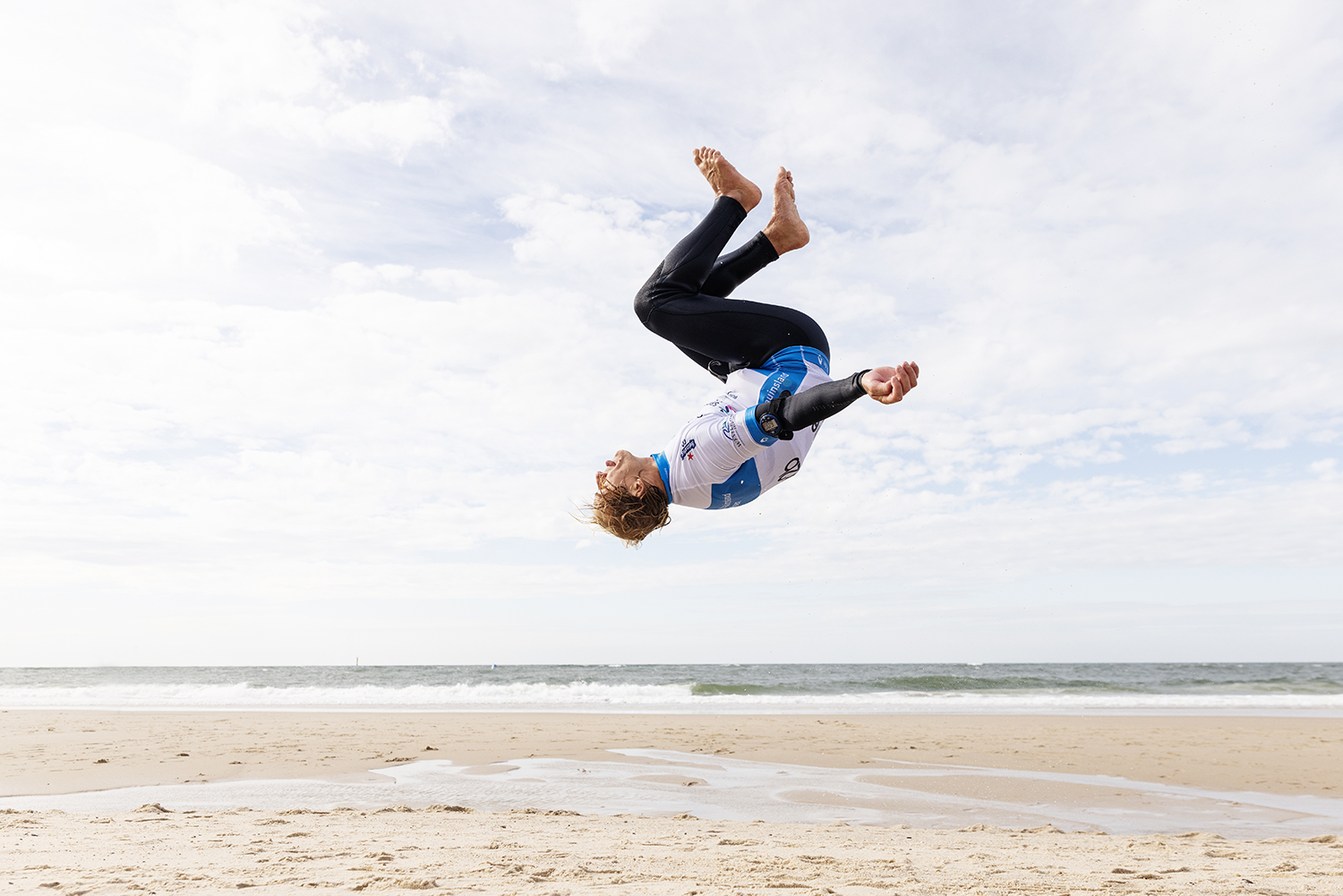 I never did any gymnastics, but I always loved to play a lot of different sports. I skateboard, snowboard, surf and I run around the dunes performing flips. I have always been busy playing sports as a kid and still now I am not one to sit around and wait for the wind. I keep performing all the flips I can do, while a lot of the younger guys I know, who used to do them, have quit and they are now scared to throw themselves around. Landing a backflip on the sand gives you an awareness in the air and you have to land like a cat. Every extreme sport can help you in one way or another. In freestyle you are really using your legs a lot to help pop and execute the moves. You have to be strong, but also very explosive and I think that is really important.