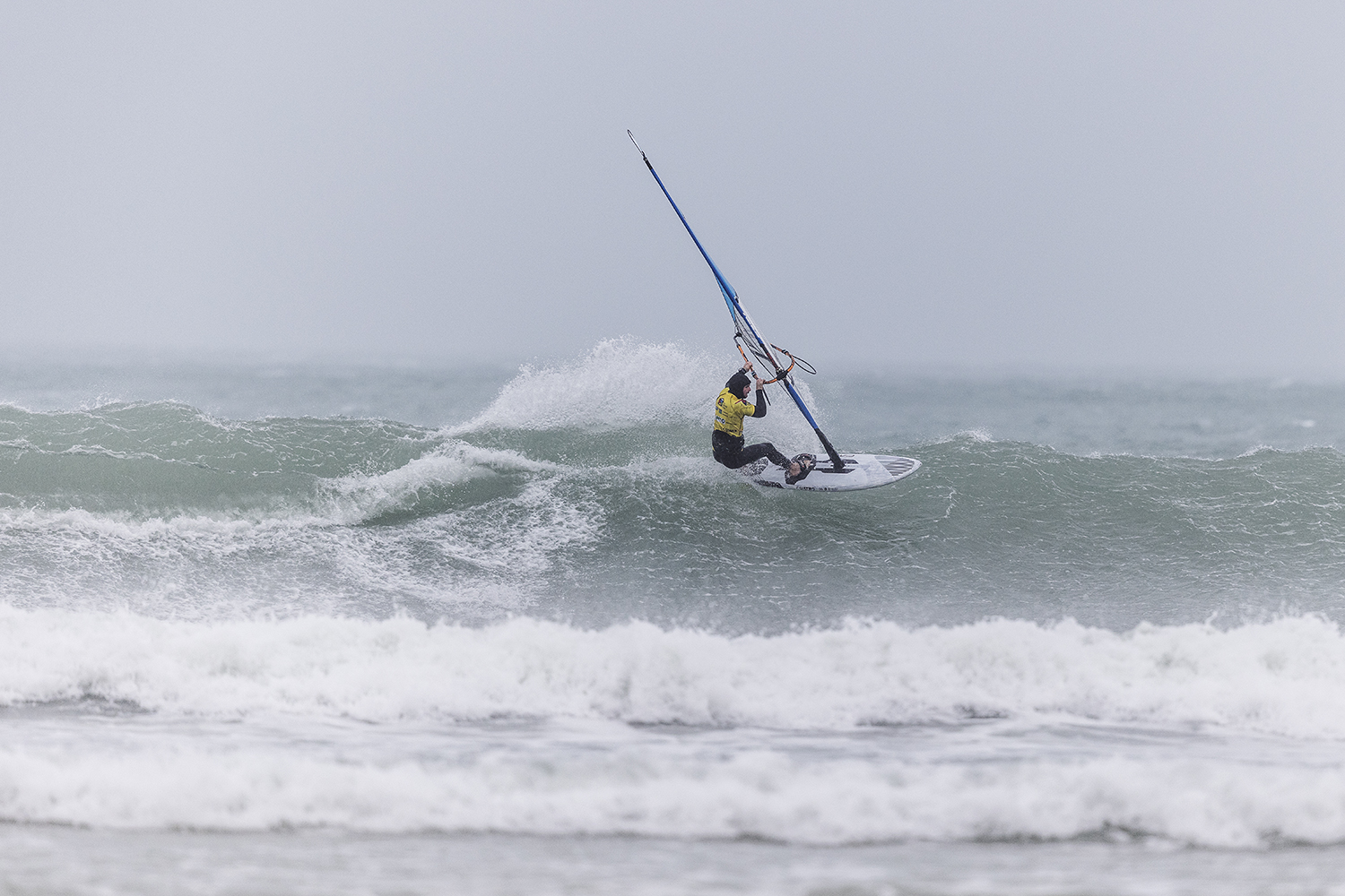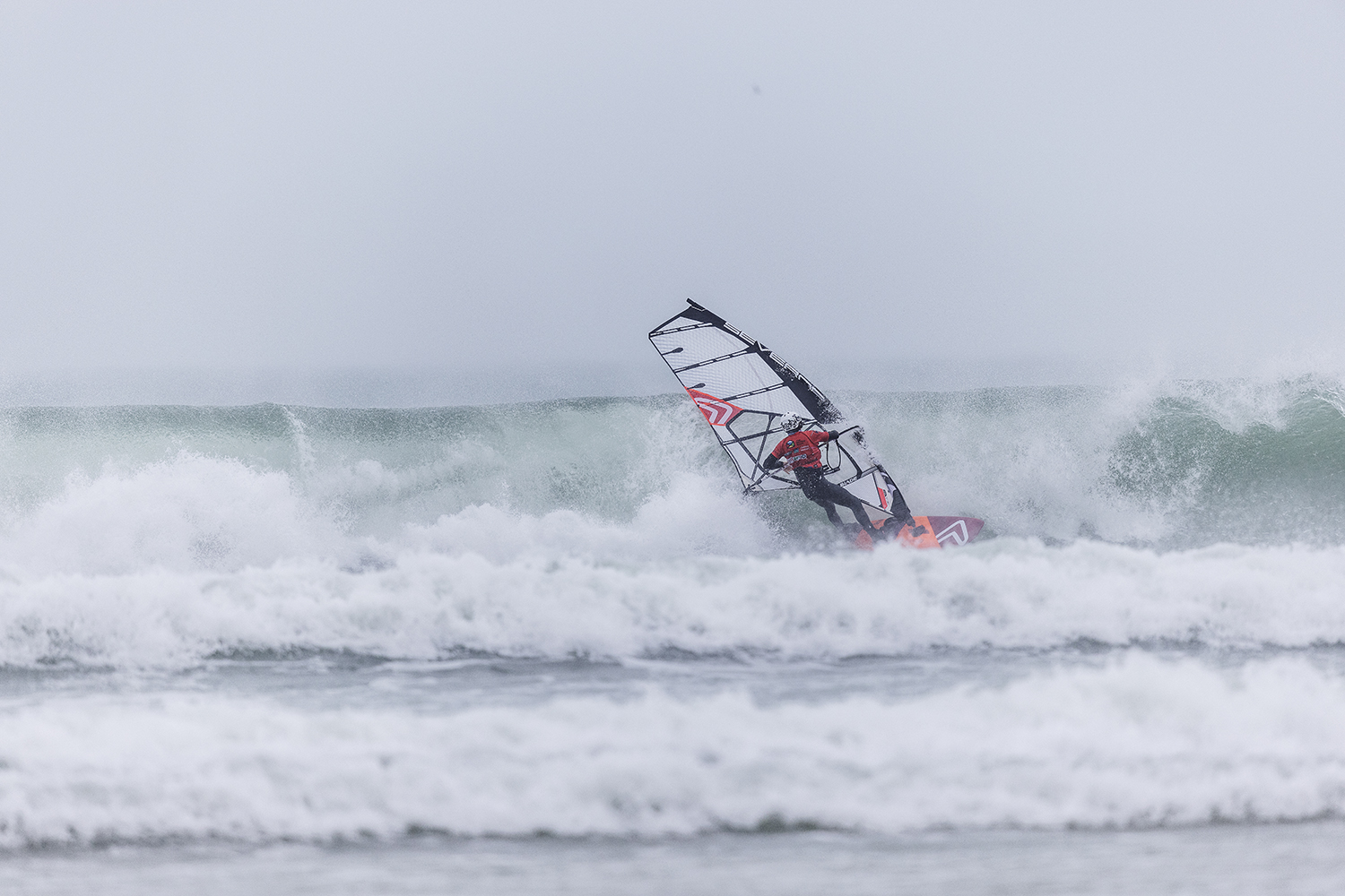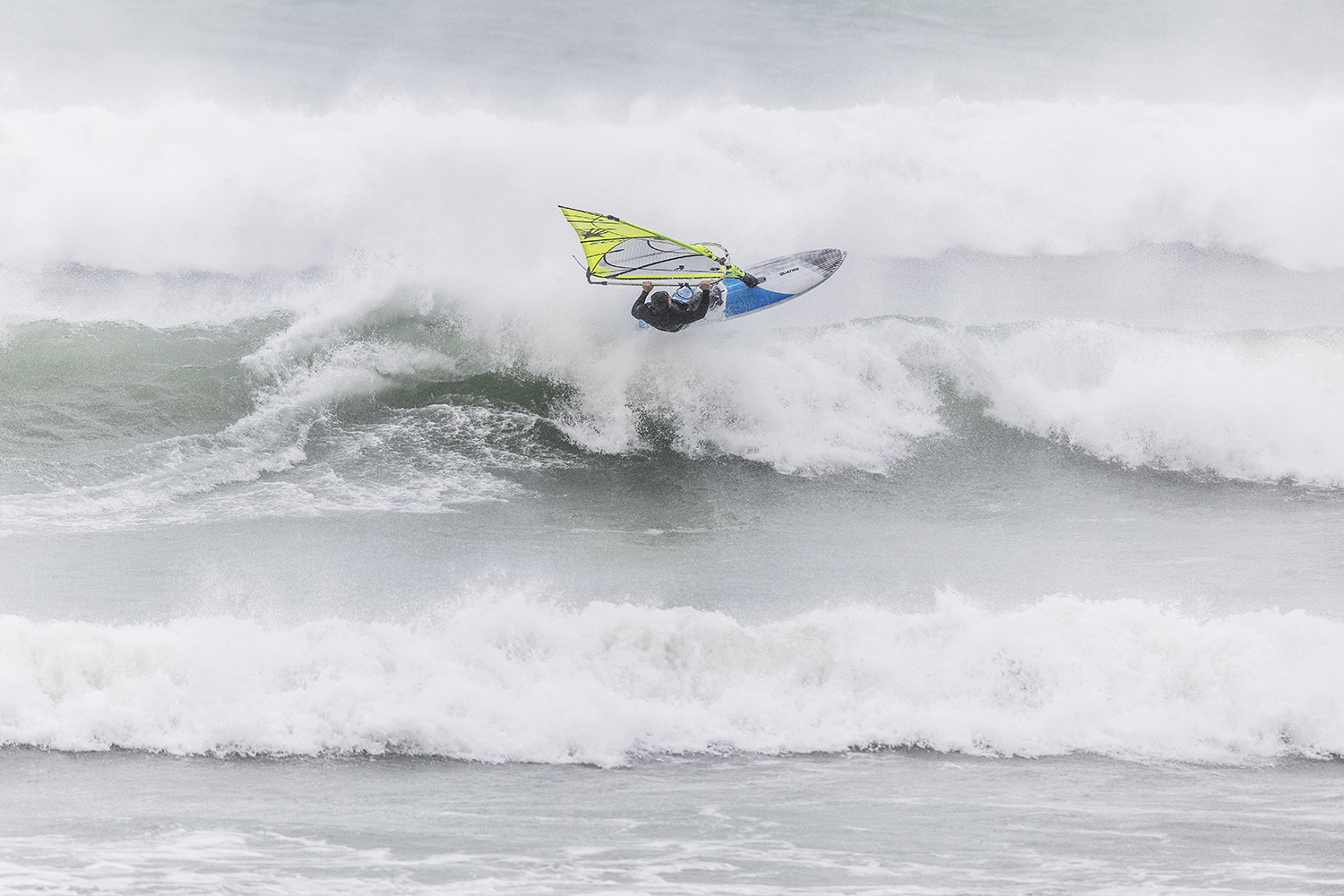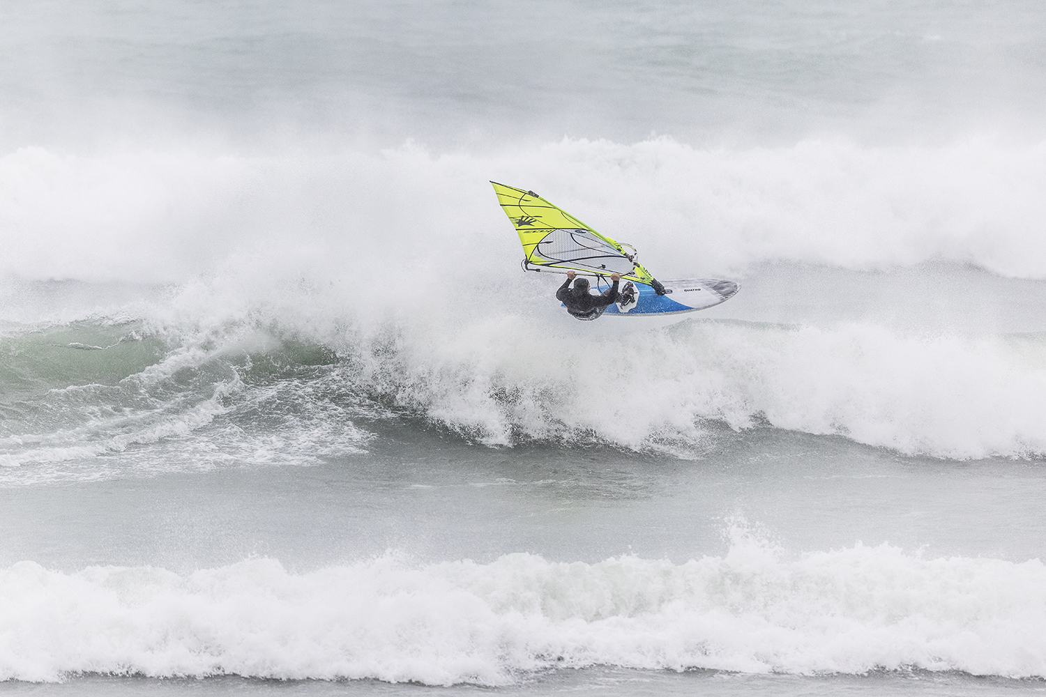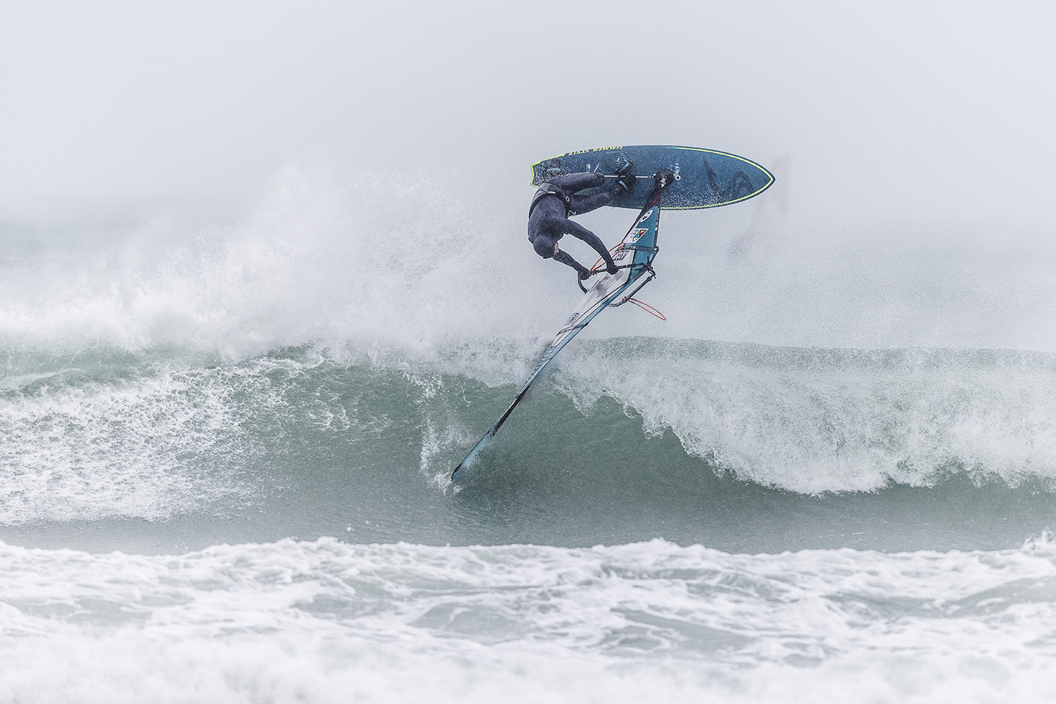 We were up early doors and it was pitch black when we arrived at Gwithian. The wind was blowing so hard we had to hang onto the van doors and it was driving rain just for good measure. When it was finally light enough to see, we make out the huge waves and white caps. I was in the first heat. Normally the top seed is in the last heat, so I was hoping it would be that way around. So, I didn’t get a chance to watch anybody. There was no chance to see what was going on. I had to guess the right equipment and I am not a local at Gwithian so didn’t really know where to take the waves when it was that size. I had to take a punt. I went on my 4m Black Tip Simmer sail and went for it. I was riding my 84L Simmer, Flywave set up as a quad. It is a nice super thin rail board and it really grips in the wave. When you turn tight it can hold lots of power and pressure from the sail. That was great because the wind was so strong.