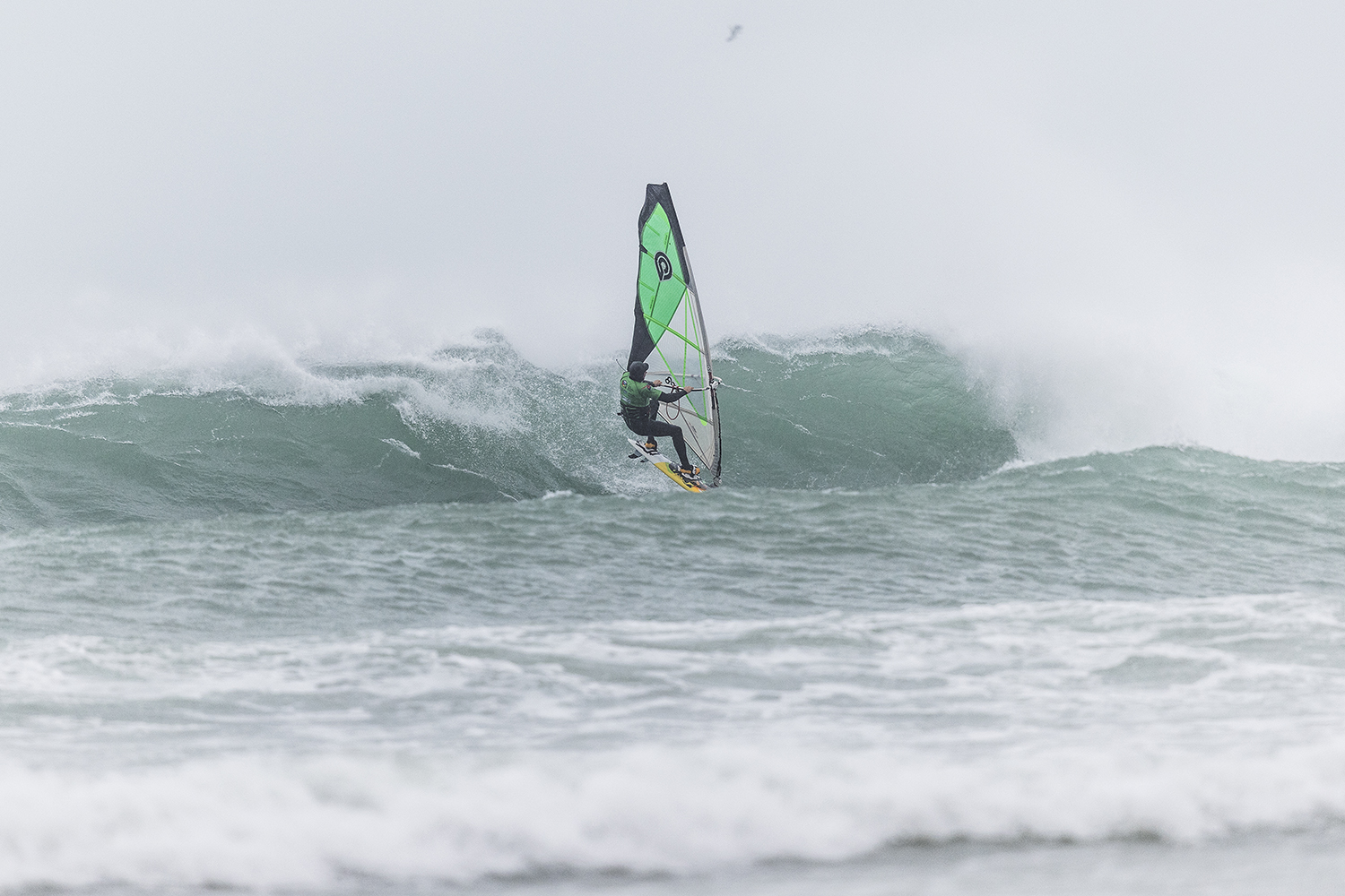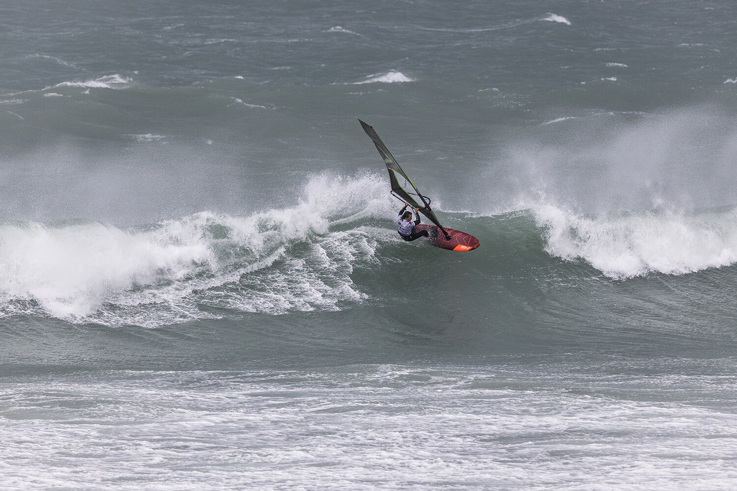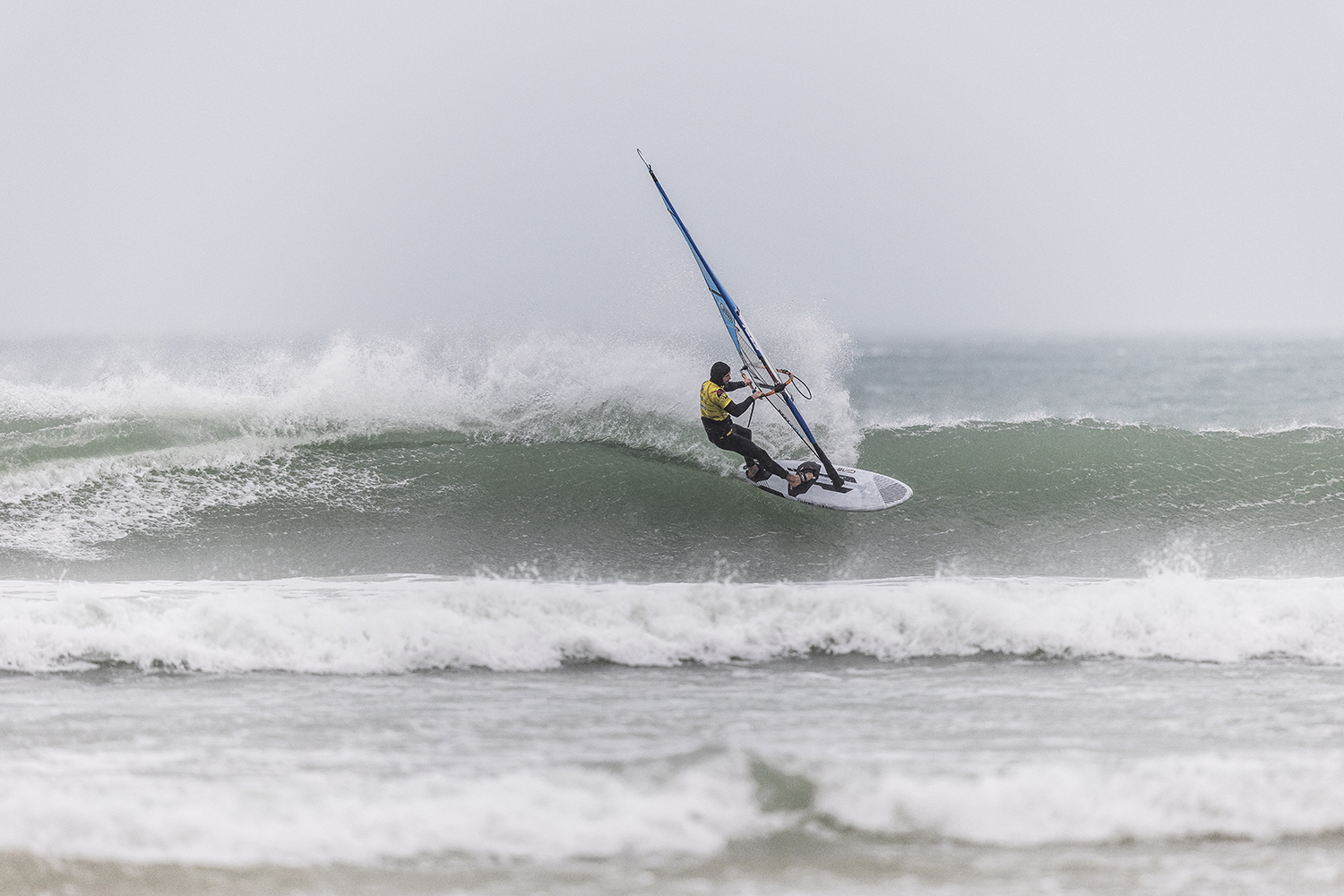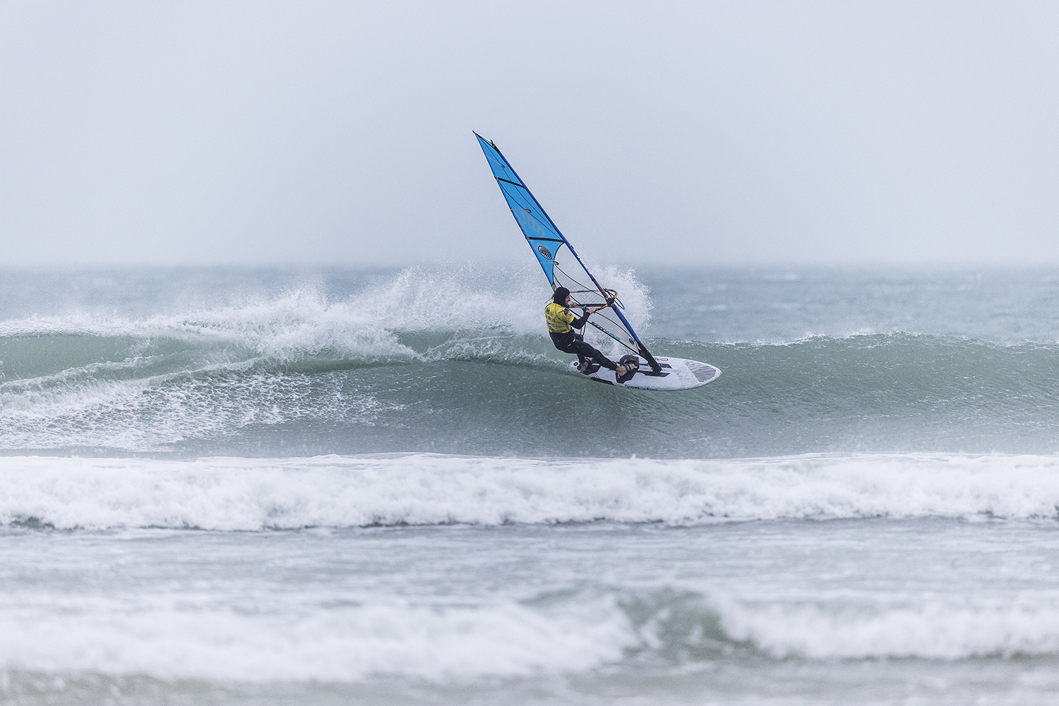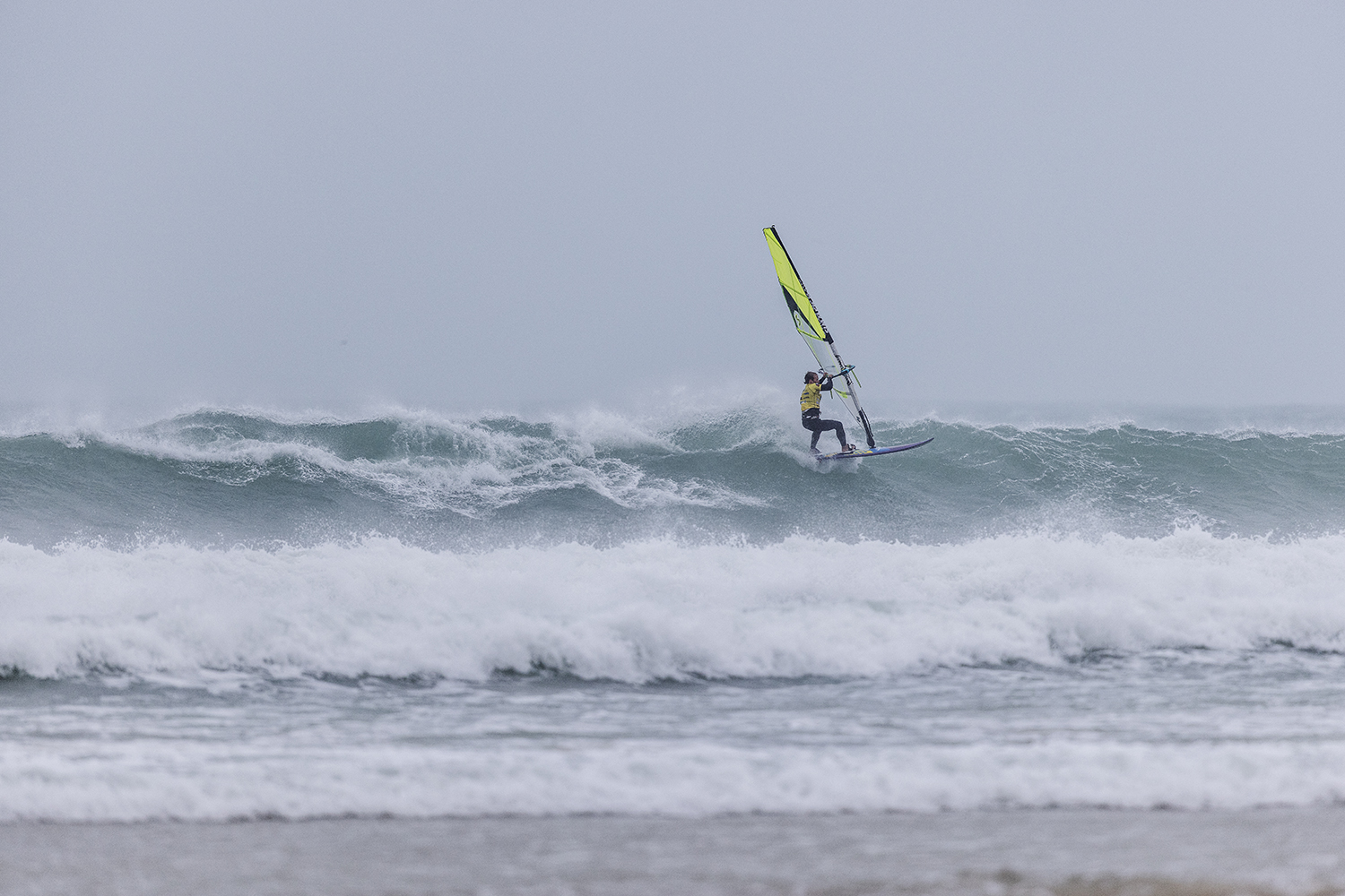 We were up early doors and it was pitch black when we arrived at Gwithian. The wind was blowing so hard we had to hang onto the van doors and it was driving rain just for good measure. When it was finally light enough to see, we make out the huge waves and white caps. I was in the first heat. Normally the top seed is in the last heat, so I was hoping it would be that way around. So, I didn’t get a chance to watch anybody. There was no chance to see what was going on. I had to guess the right equipment and I am not a local at Gwithian so didn’t really know where to take the waves when it was that size. I had to take a punt. I went on my 4m Black Tip Simmer sail and went for it. I was riding my 84L Simmer, Flywave set up as a quad. It is a nice super thin rail board and it really grips in the wave. When you turn tight it can hold lots of power and pressure from the sail. That was great because the wind was so strong.