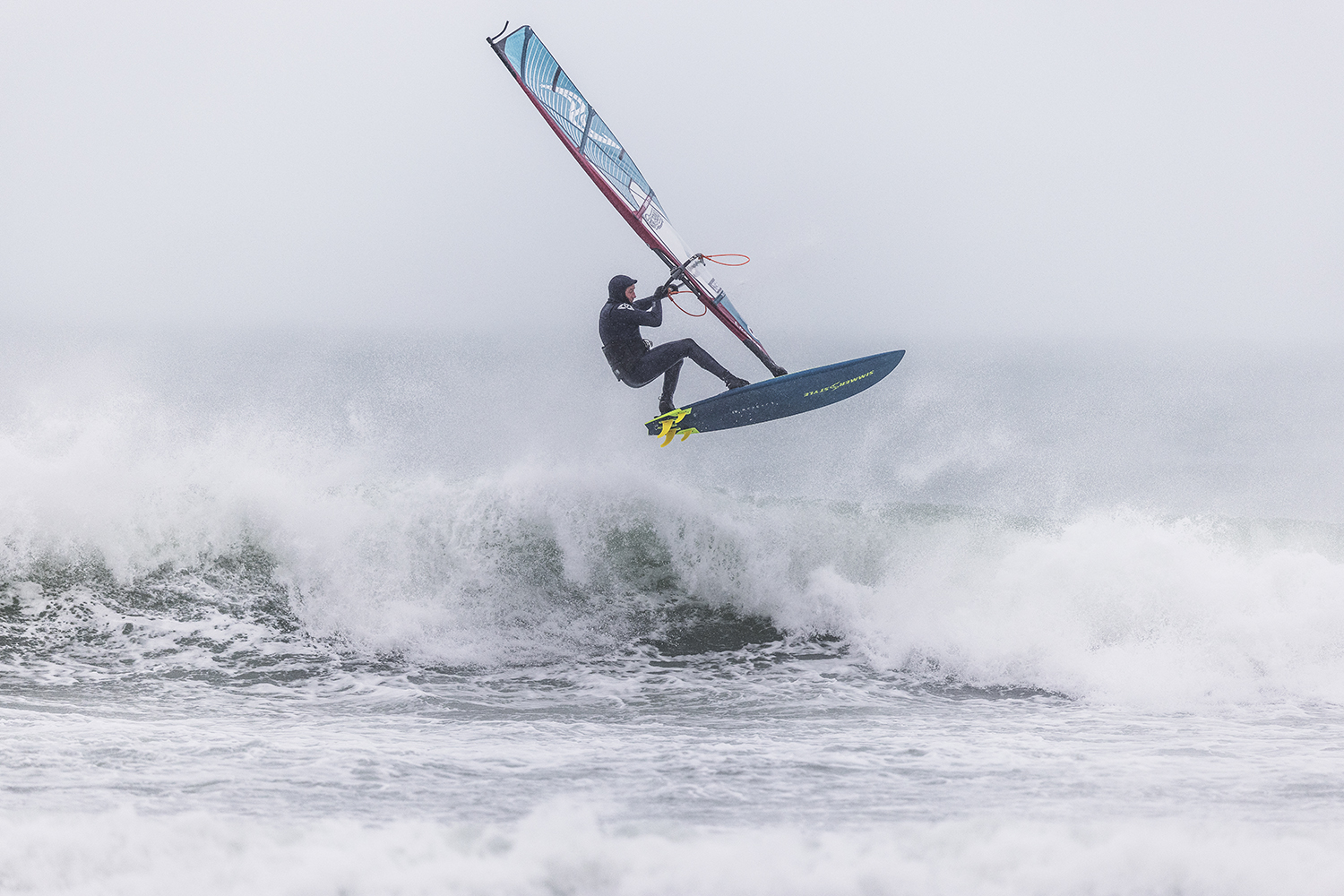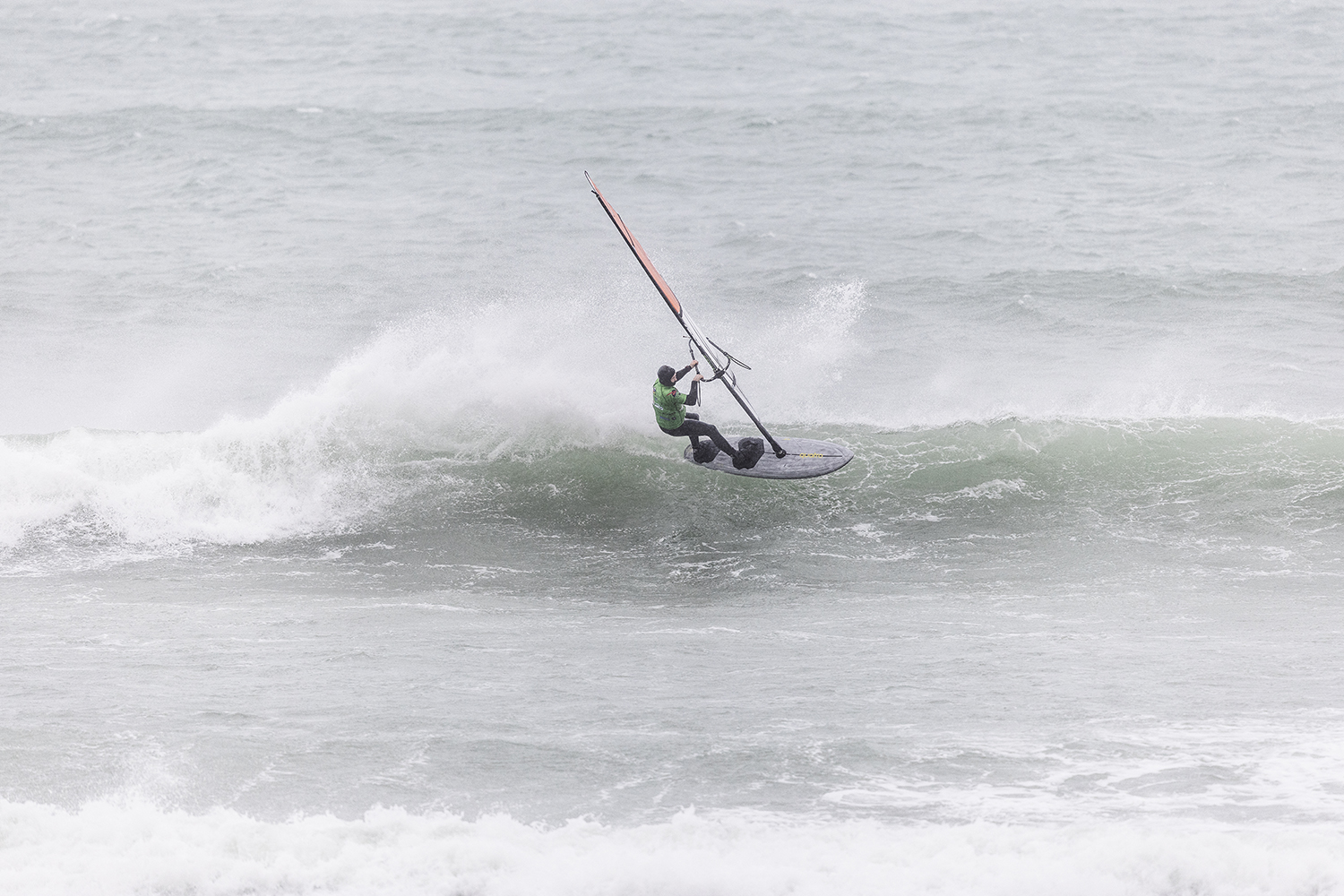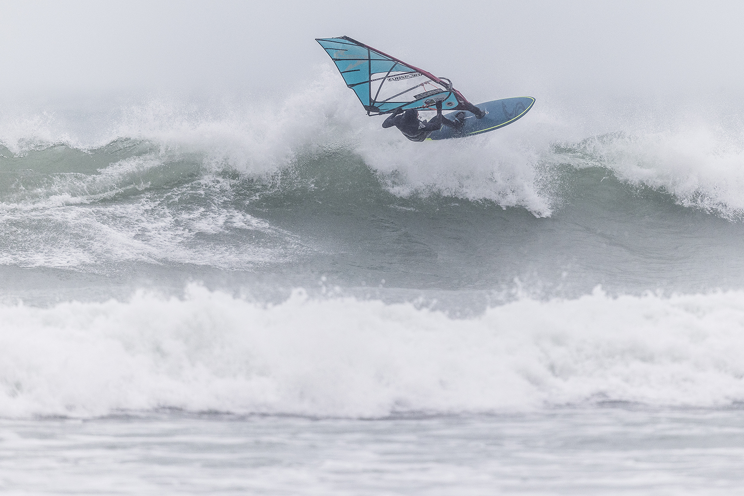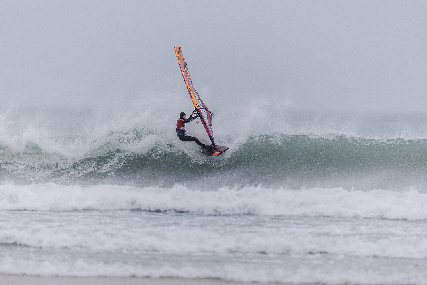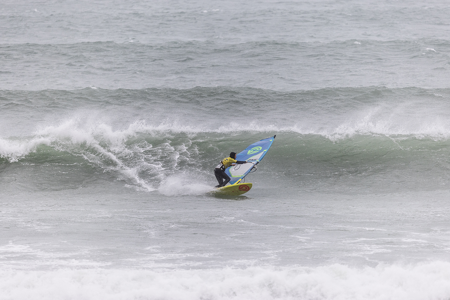 We were up early doors and it was pitch black when we arrived at Gwithian. The wind was blowing so hard we had to hang onto the van doors and it was driving rain just for good measure. When it was finally light enough to see, we make out the huge waves and white caps. I was in the first heat. Normally the top seed is in the last heat, so I was hoping it would be that way around. So, I didn’t get a chance to watch anybody. There was no chance to see what was going on. I had to guess the right equipment and I am not a local at Gwithian so didn’t really know where to take the waves when it was that size. I had to take a punt. I went on my 4m Black Tip Simmer sail and went for it. I was riding my 84L Simmer, Flywave set up as a quad. It is a nice super thin rail board and it really grips in the wave. When you turn tight it can hold lots of power and pressure from the sail. That was great because the wind was so strong.