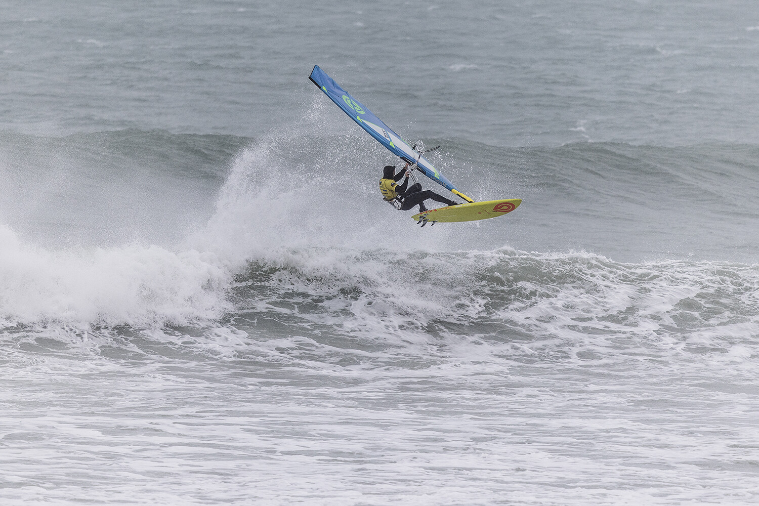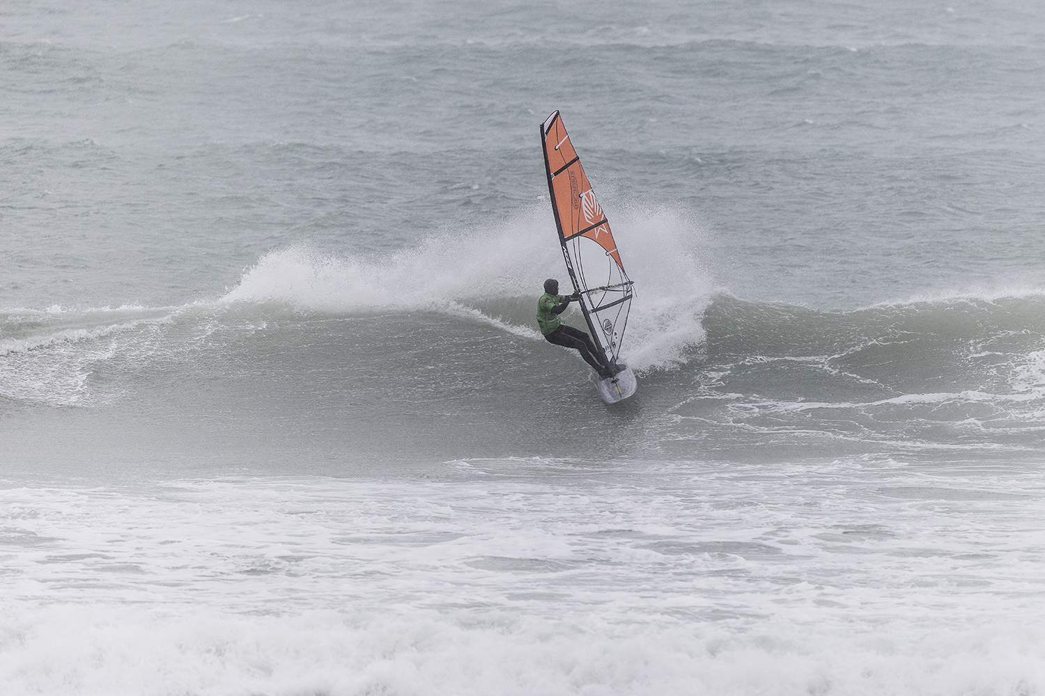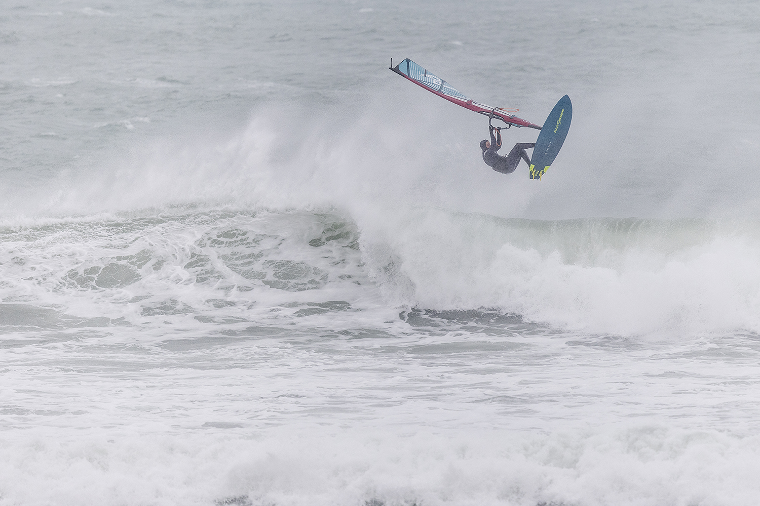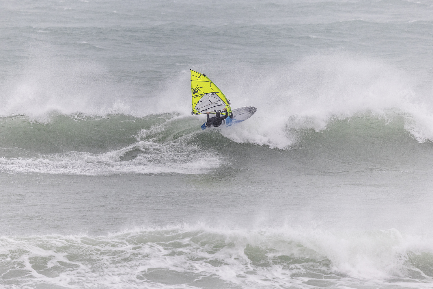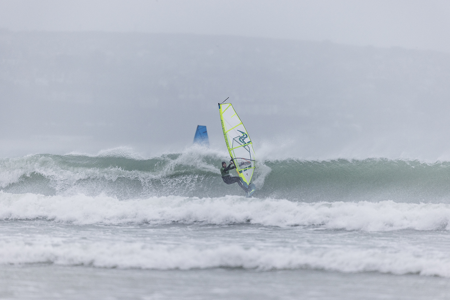 We were up early doors and it was pitch black when we arrived at Gwithian. The wind was blowing so hard we had to hang onto the van doors and it was driving rain just for good measure. When it was finally light enough to see, we make out the huge waves and white caps. I was in the first heat. Normally the top seed is in the last heat, so I was hoping it would be that way around. So, I didn’t get a chance to watch anybody. There was no chance to see what was going on. I had to guess the right equipment and I am not a local at Gwithian so didn’t really know where to take the waves when it was that size. I had to take a punt. I went on my 4m Black Tip Simmer sail and went for it. I was riding my 84L Simmer, Flywave set up as a quad. It is a nice super thin rail board and it really grips in the wave. When you turn tight it can hold lots of power and pressure from the sail. That was great because the wind was so strong.
