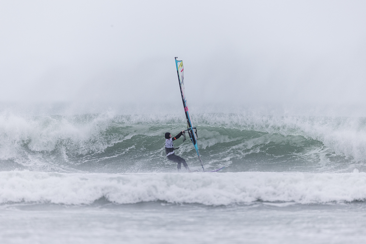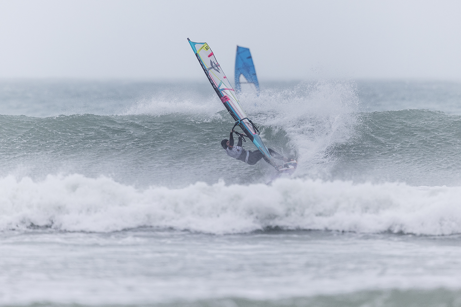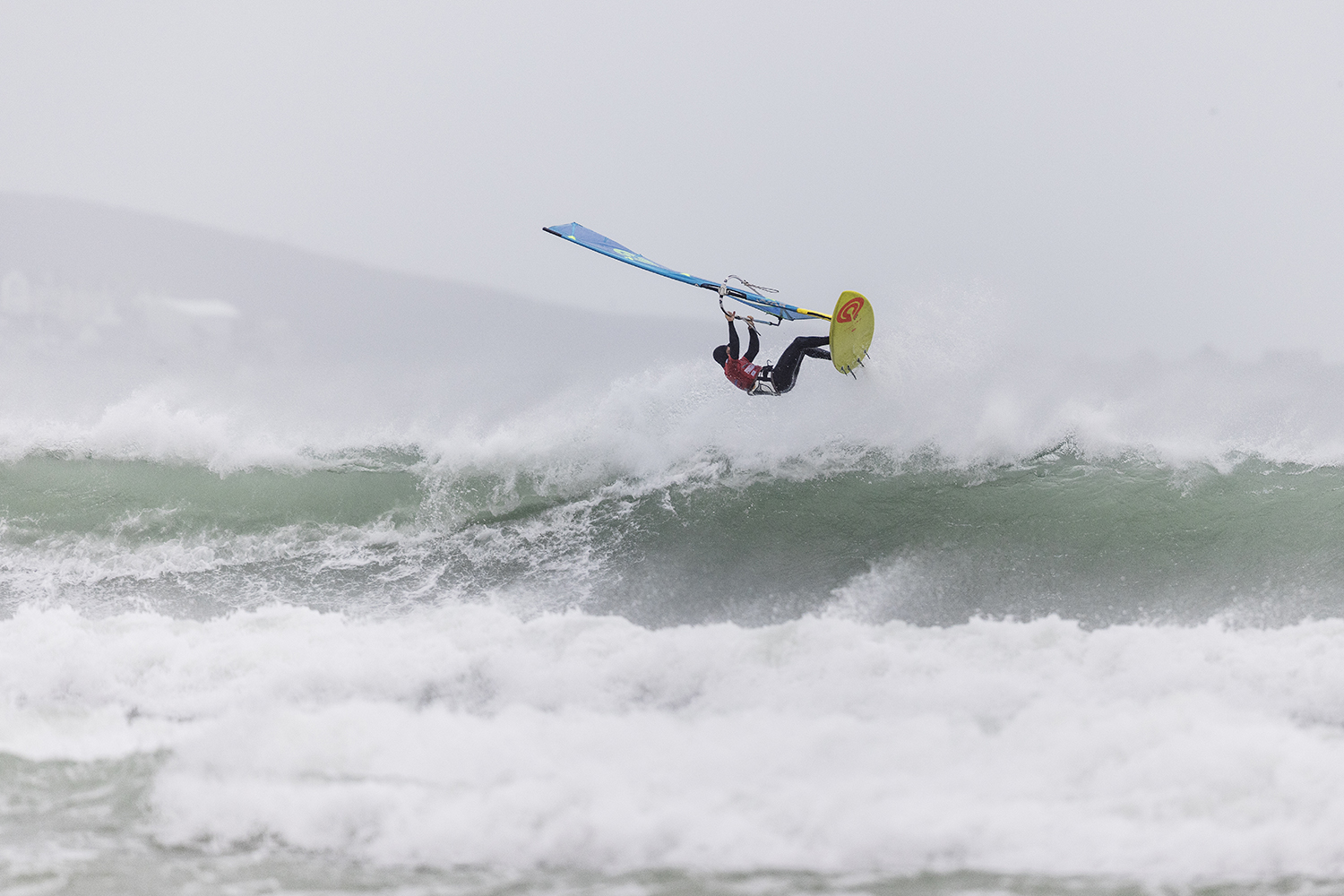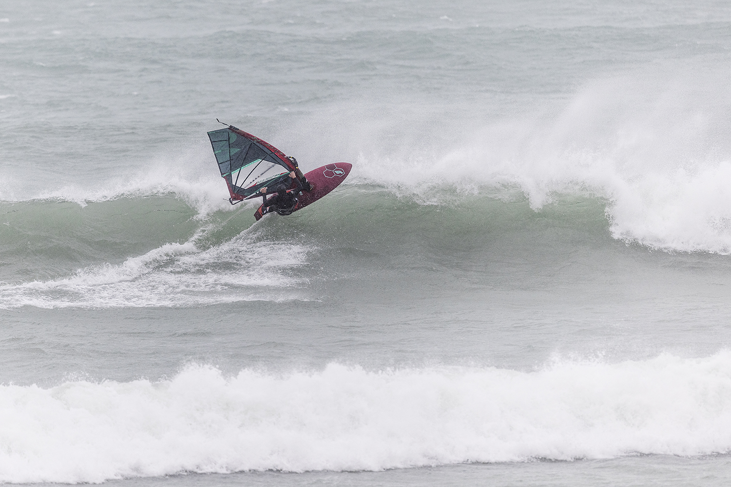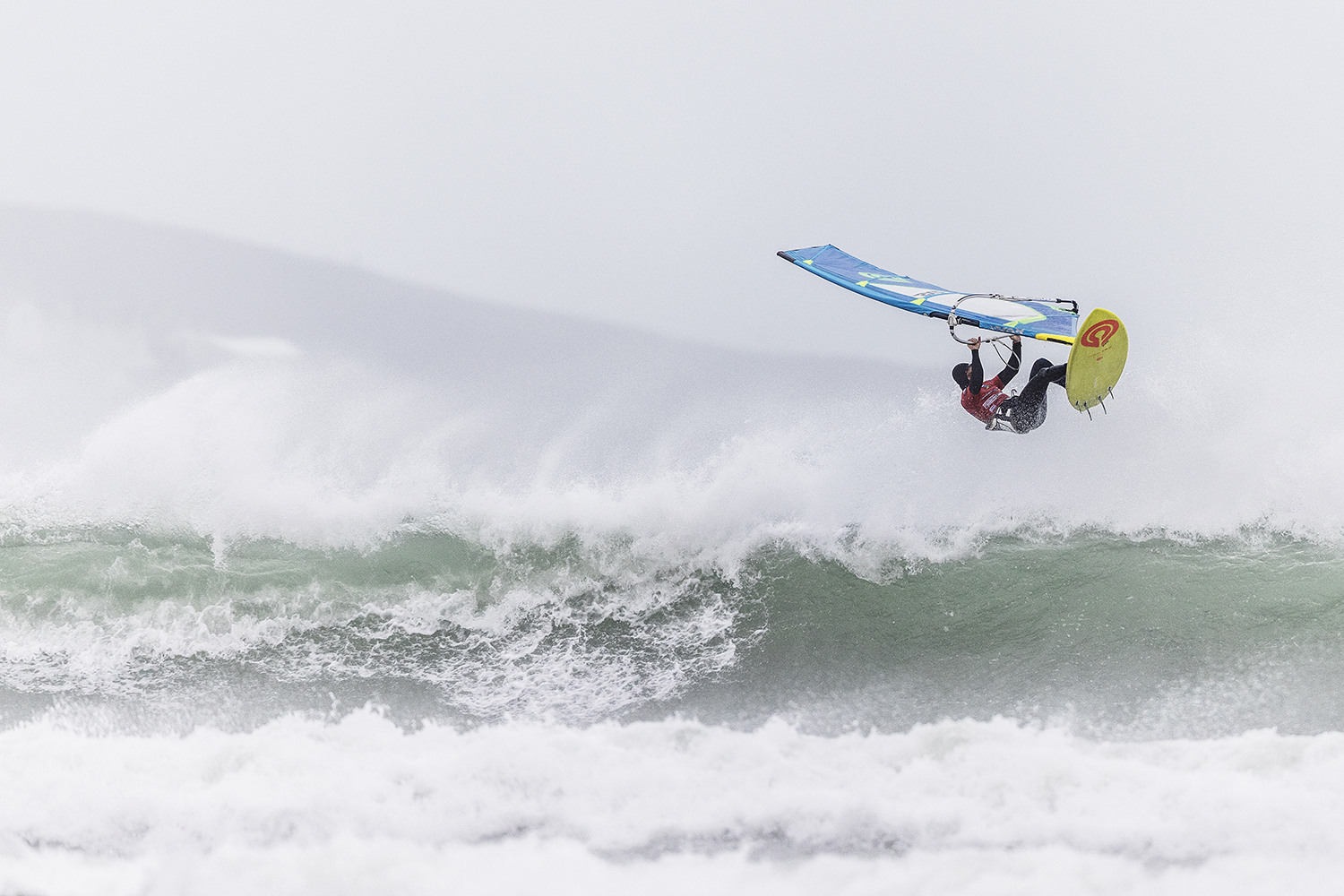 We were up early doors and it was pitch black when we arrived at Gwithian. The wind was blowing so hard we had to hang onto the van doors and it was driving rain just for good measure. When it was finally light enough to see, we make out the huge waves and white caps. I was in the first heat. Normally the top seed is in the last heat, so I was hoping it would be that way around. So, I didn’t get a chance to watch anybody. There was no chance to see what was going on. I had to guess the right equipment and I am not a local at Gwithian so didn’t really know where to take the waves when it was that size. I had to take a punt. I went on my 4m Black Tip Simmer sail and went for it. I was riding my 84L Simmer, Flywave set up as a quad. It is a nice super thin rail board and it really grips in the wave. When you turn tight it can hold lots of power and pressure from the sail. That was great because the wind was so strong.