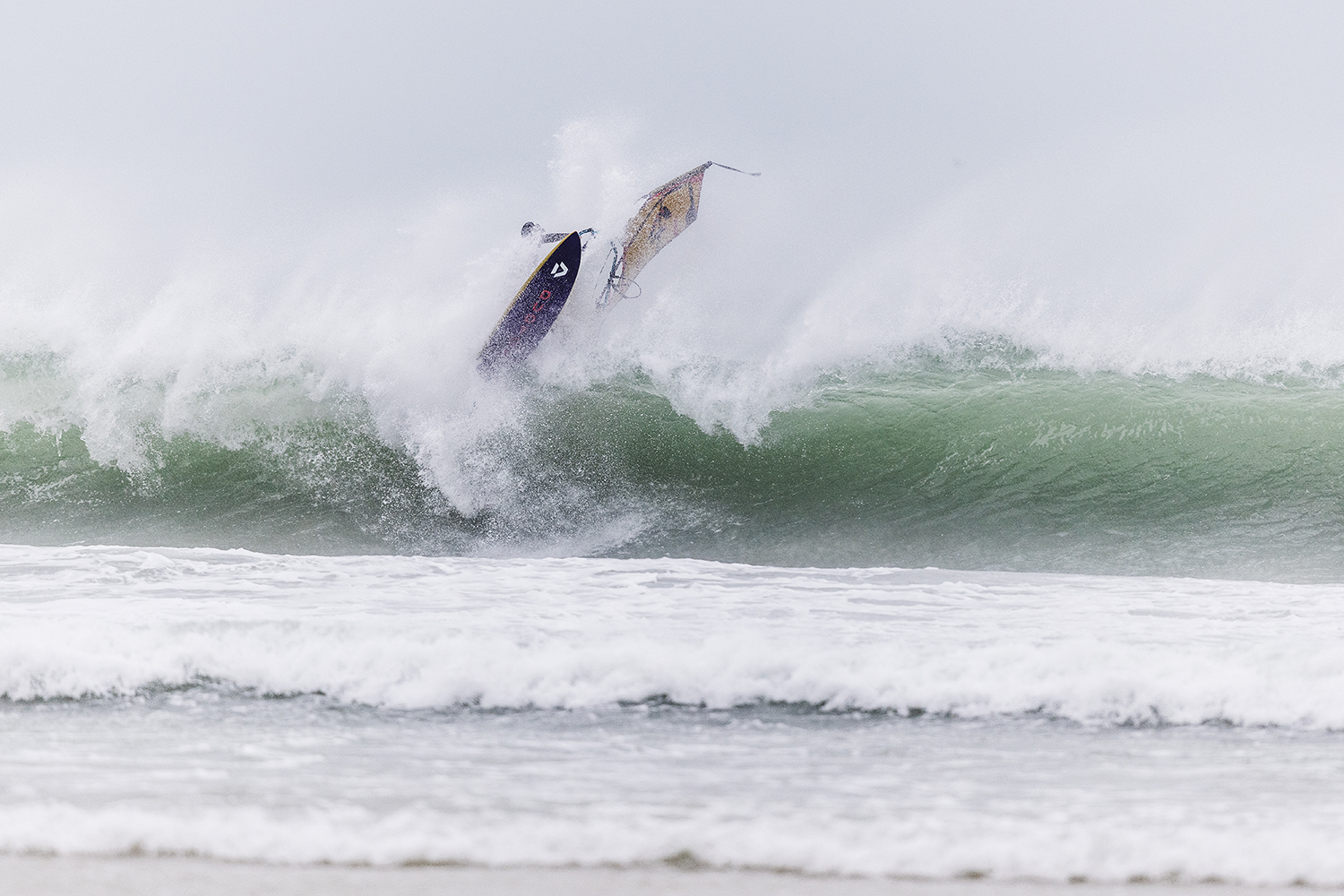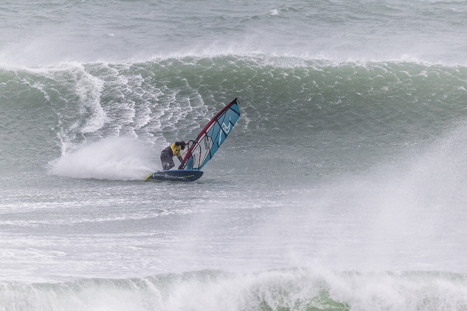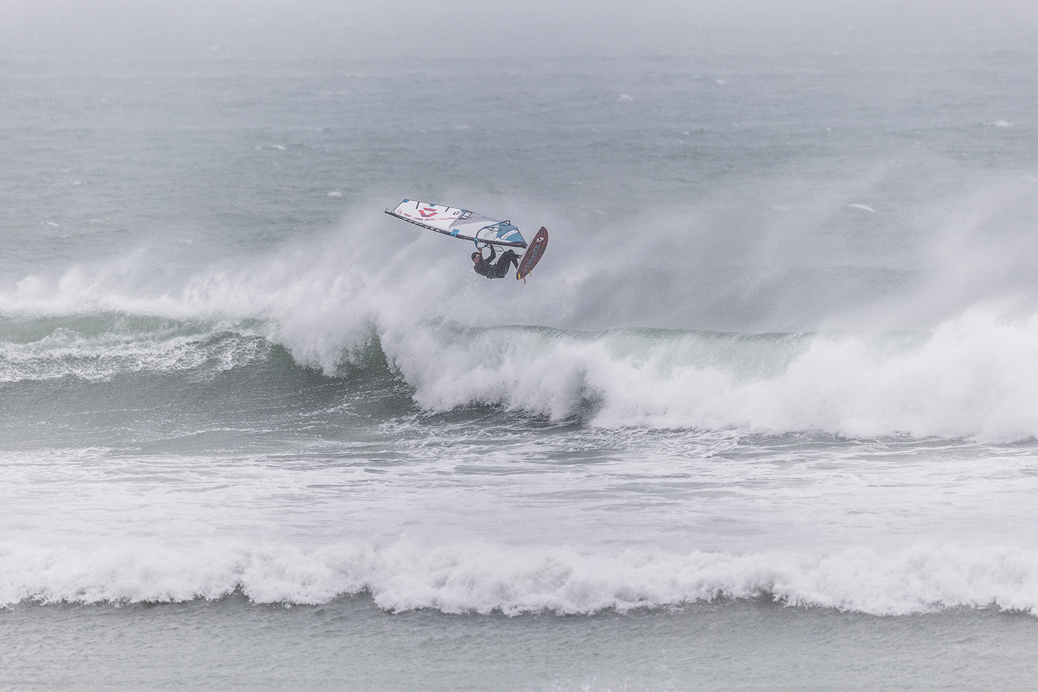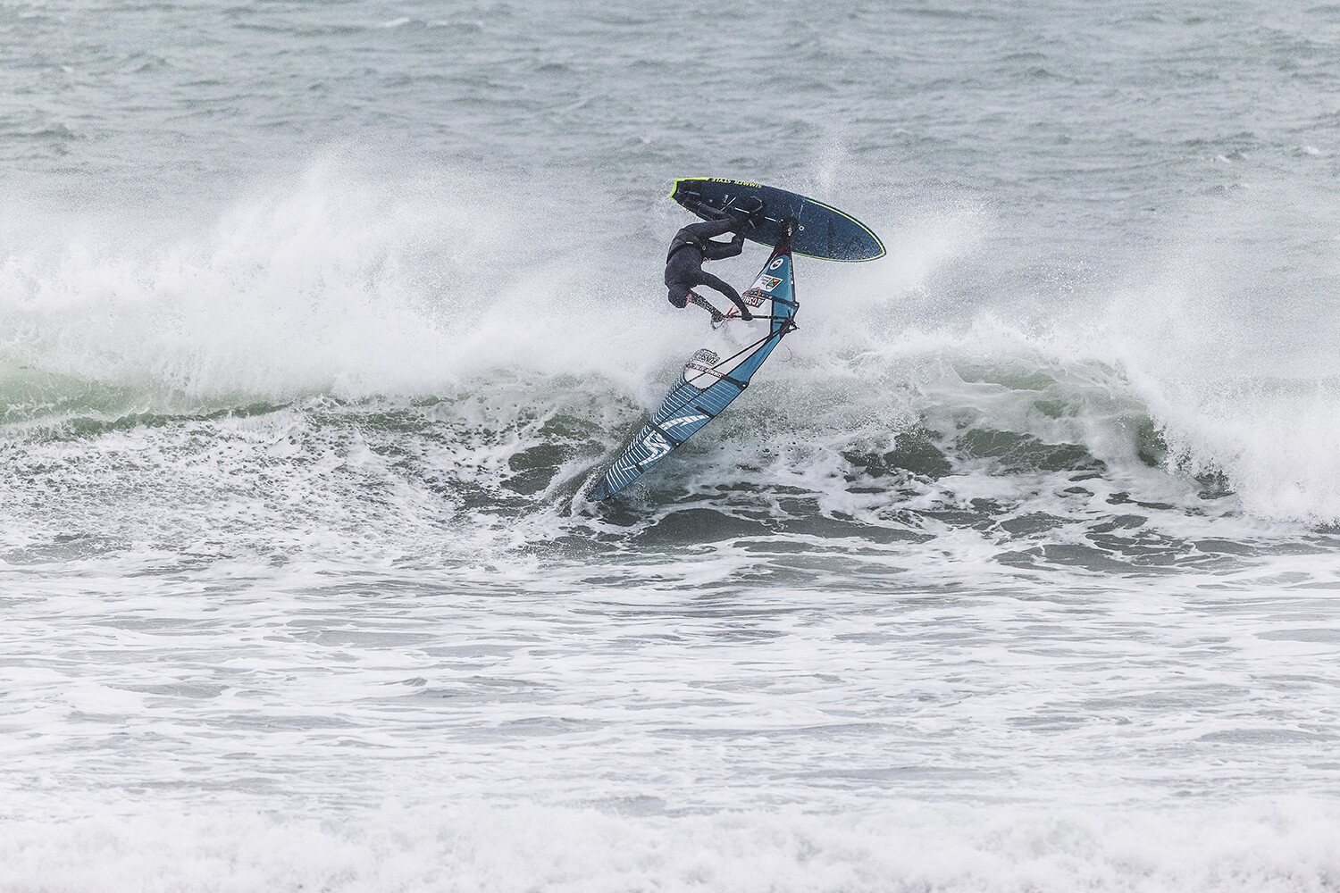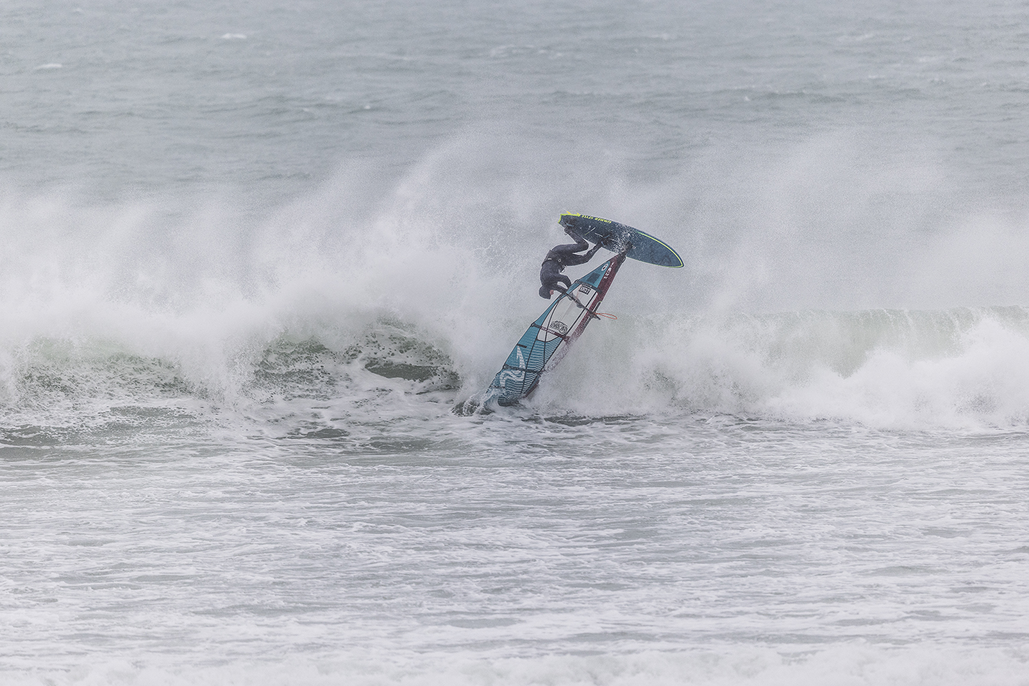 We were up early doors and it was pitch black when we arrived at Gwithian. The wind was blowing so hard we had to hang onto the van doors and it was driving rain just for good measure. When it was finally light enough to see, we make out the huge waves and white caps. I was in the first heat. Normally the top seed is in the last heat, so I was hoping it would be that way around. So, I didn’t get a chance to watch anybody. There was no chance to see what was going on. I had to guess the right equipment and I am not a local at Gwithian so didn’t really know where to take the waves when it was that size. I had to take a punt. I went on my 4m Black Tip Simmer sail and went for it. I was riding my 84L Simmer, Flywave set up as a quad. It is a nice super thin rail board and it really grips in the wave. When you turn tight it can hold lots of power and pressure from the sail. That was great because the wind was so strong.