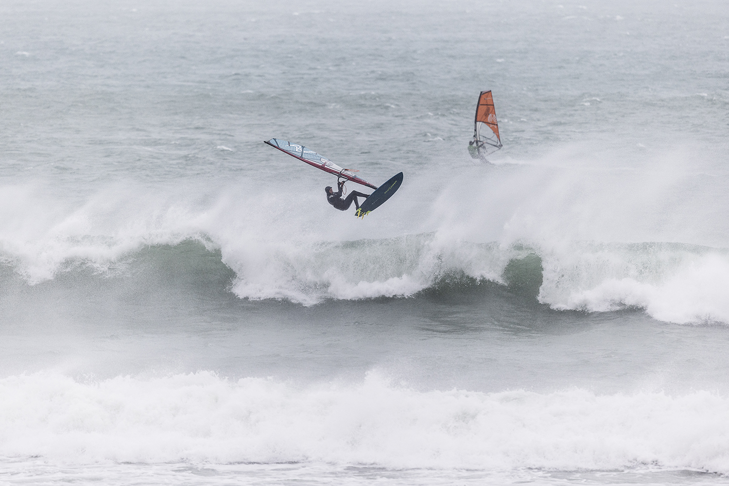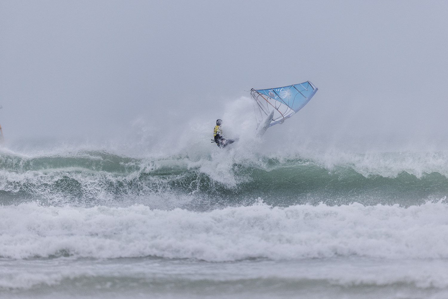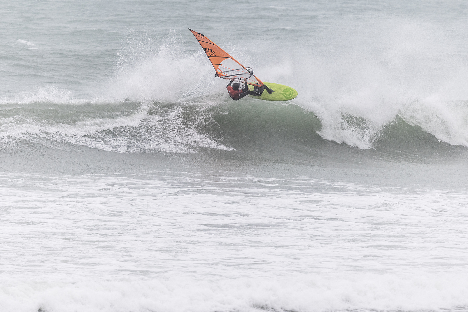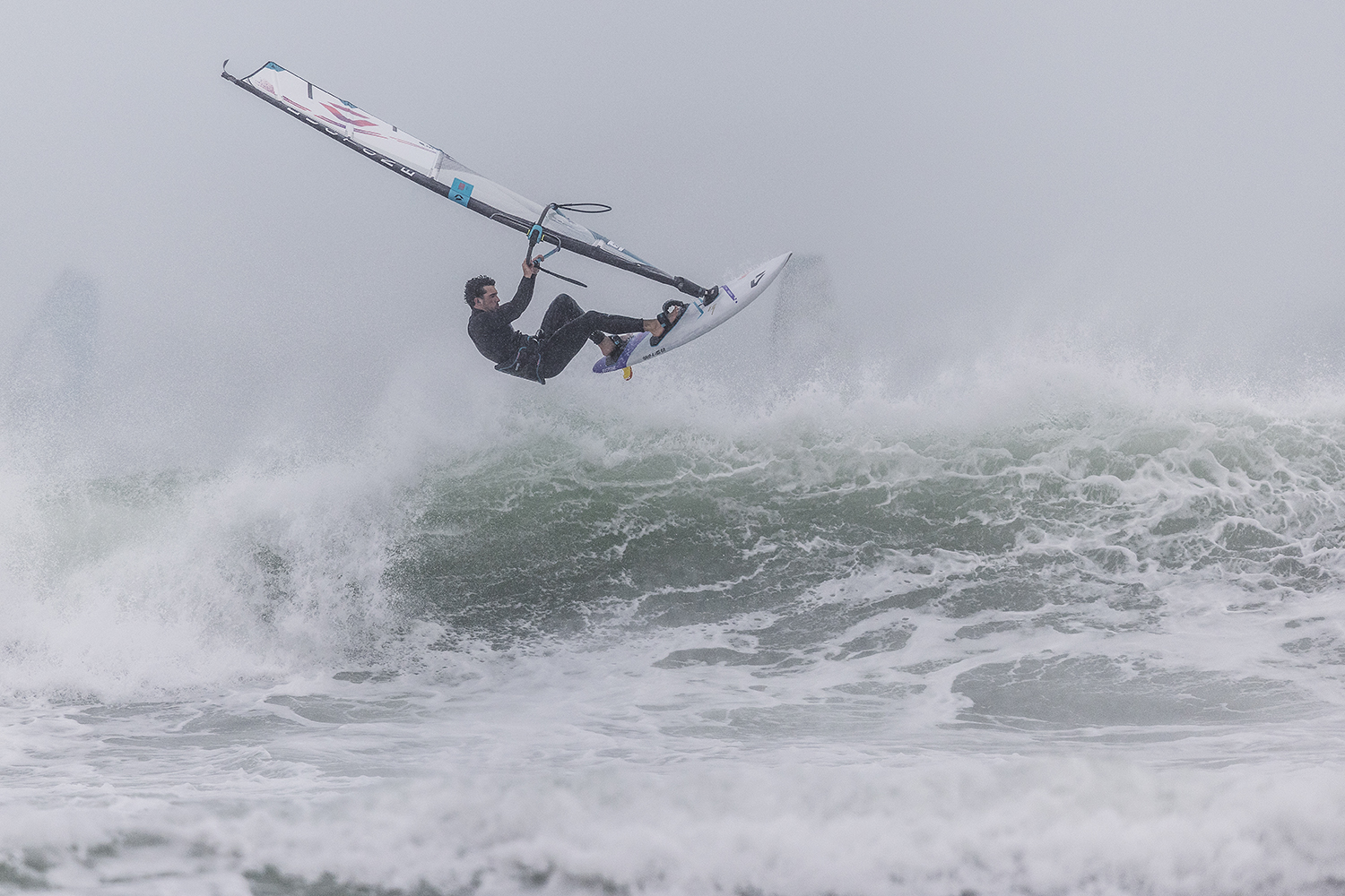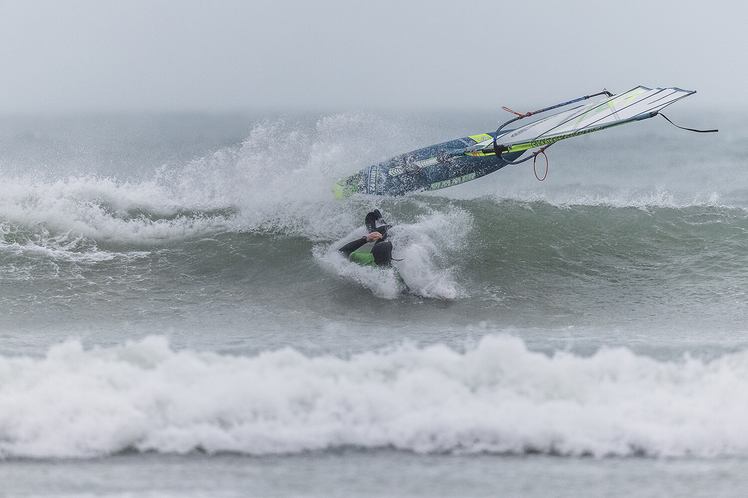 We were up early doors and it was pitch black when we arrived at Gwithian. The wind was blowing so hard we had to hang onto the van doors and it was driving rain just for good measure. When it was finally light enough to see, we make out the huge waves and white caps. I was in the first heat. Normally the top seed is in the last heat, so I was hoping it would be that way around. So, I didn’t get a chance to watch anybody. There was no chance to see what was going on. I had to guess the right equipment and I am not a local at Gwithian so didn’t really know where to take the waves when it was that size. I had to take a punt. I went on my 4m Black Tip Simmer sail and went for it. I was riding my 84L Simmer, Flywave set up as a quad. It is a nice super thin rail board and it really grips in the wave. When you turn tight it can hold lots of power and pressure from the sail. That was great because the wind was so strong.