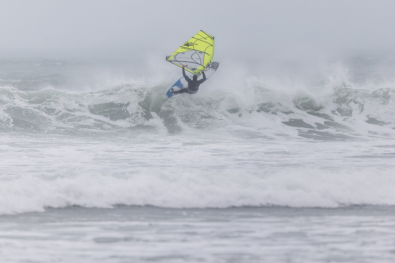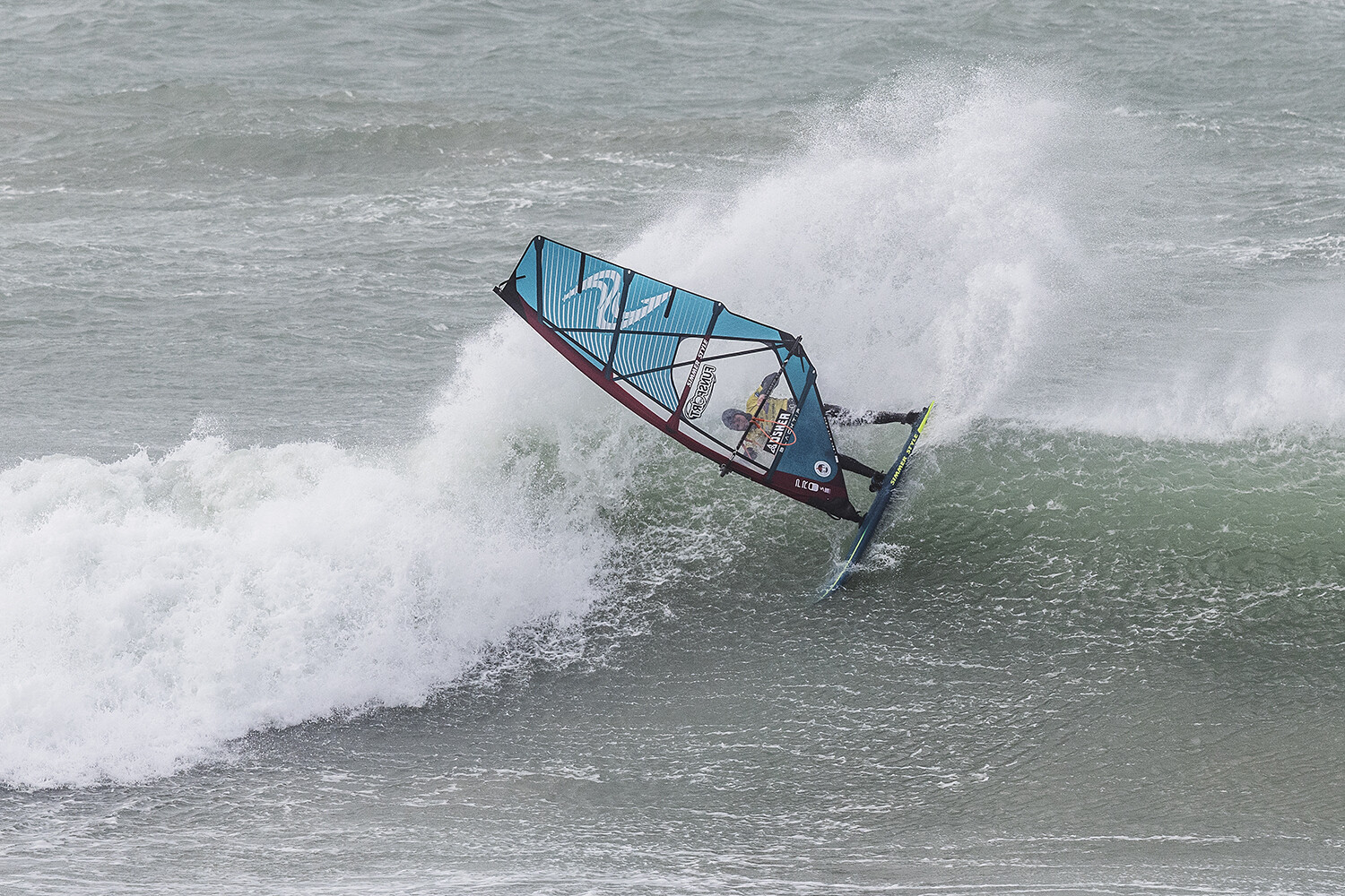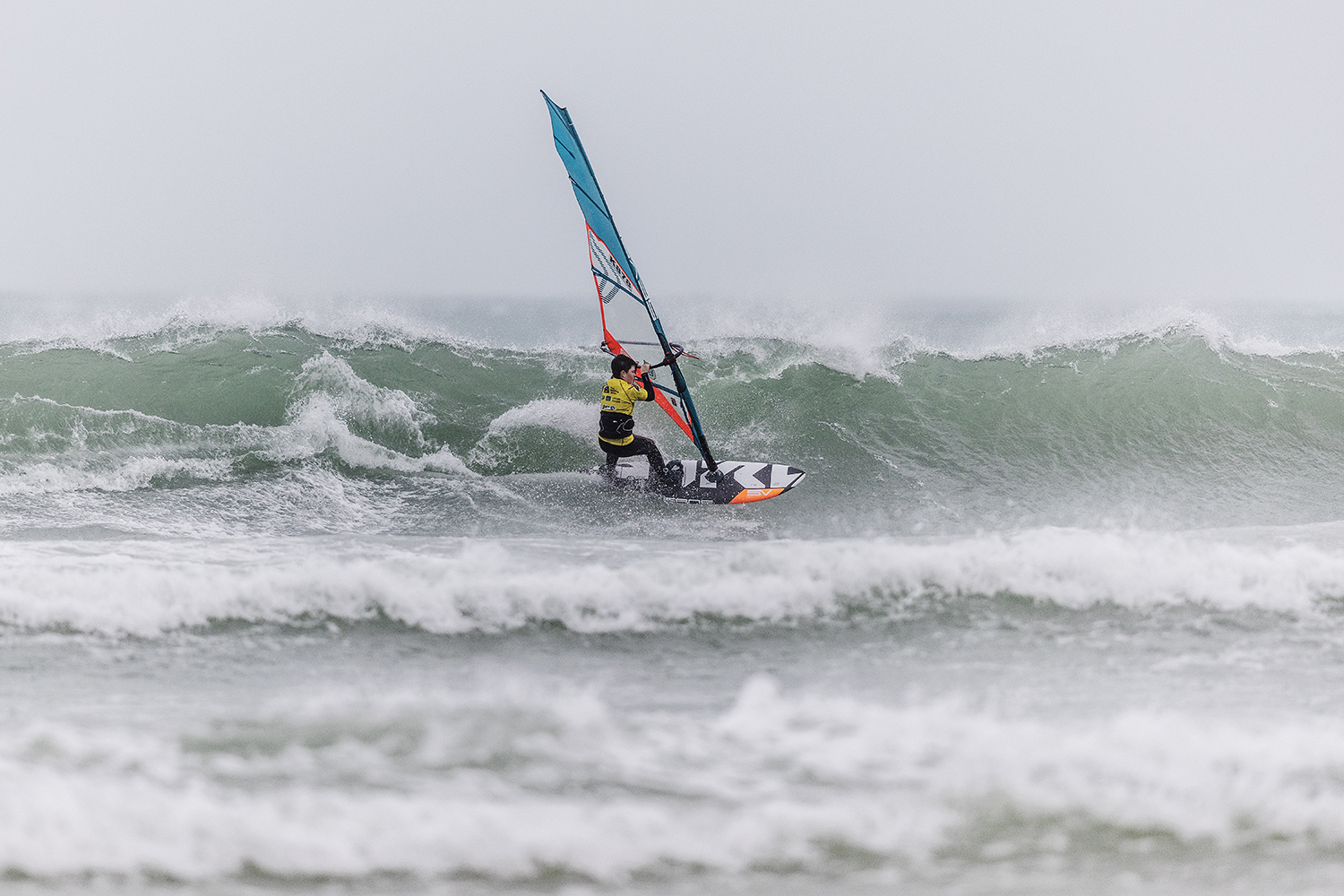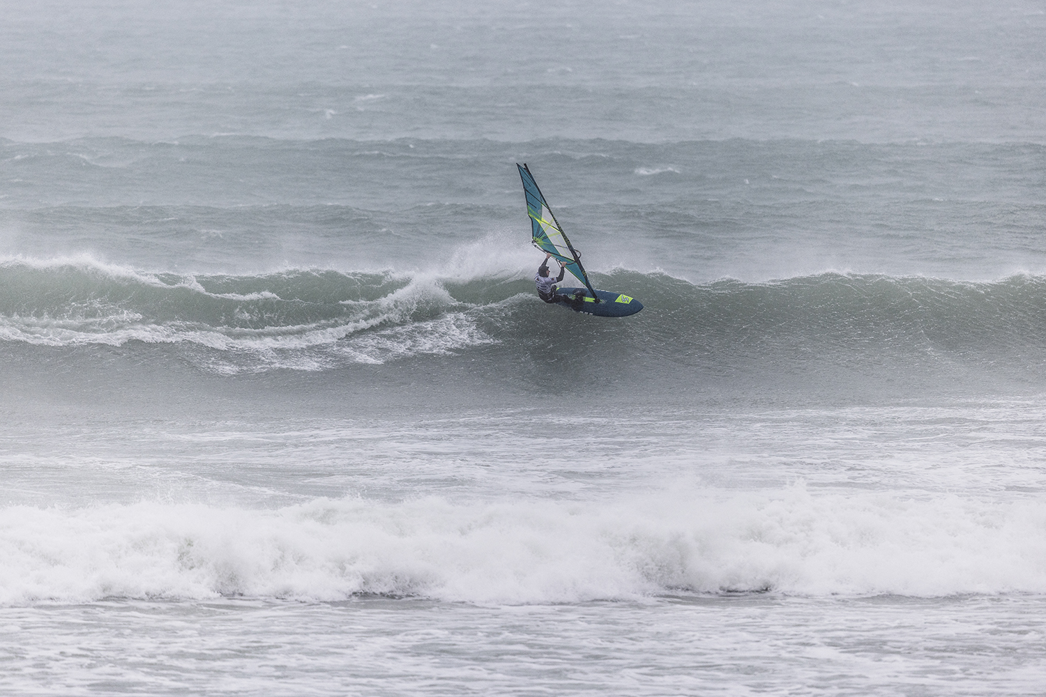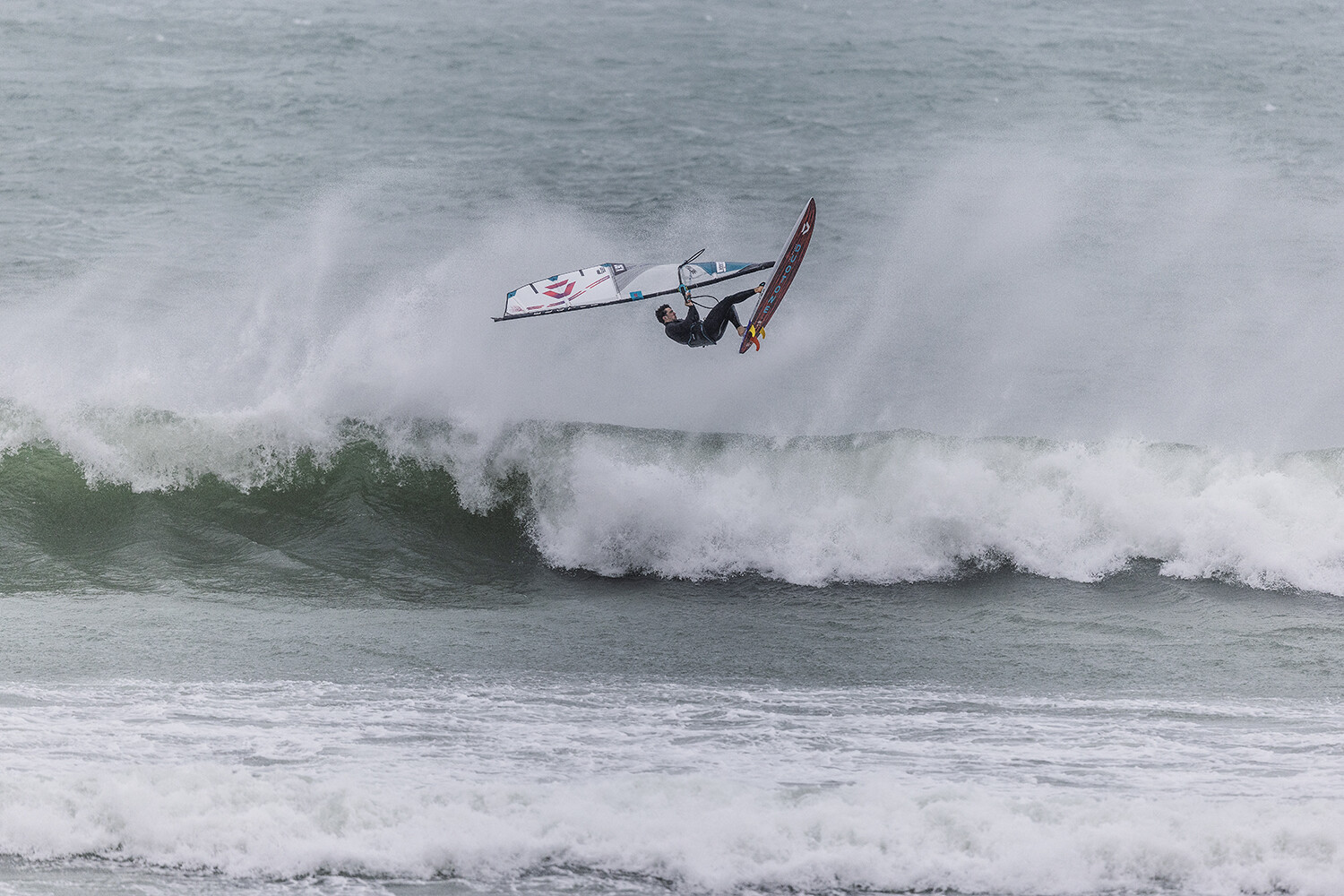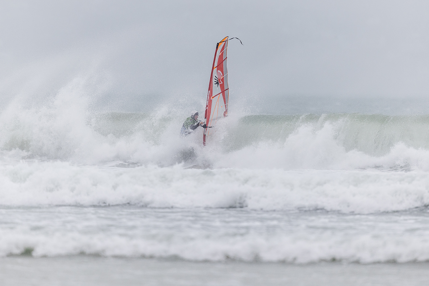 We were up early doors and it was pitch black when we arrived at Gwithian. The wind was blowing so hard we had to hang onto the van doors and it was driving rain just for good measure. When it was finally light enough to see, we make out the huge waves and white caps. I was in the first heat. Normally the top seed is in the last heat, so I was hoping it would be that way around. So, I didn’t get a chance to watch anybody. There was no chance to see what was going on. I had to guess the right equipment and I am not a local at Gwithian so didn’t really know where to take the waves when it was that size. I had to take a punt. I went on my 4m Black Tip Simmer sail and went for it. I was riding my 84L Simmer, Flywave set up as a quad. It is a nice super thin rail board and it really grips in the wave. When you turn tight it can hold lots of power and pressure from the sail. That was great because the wind was so strong.